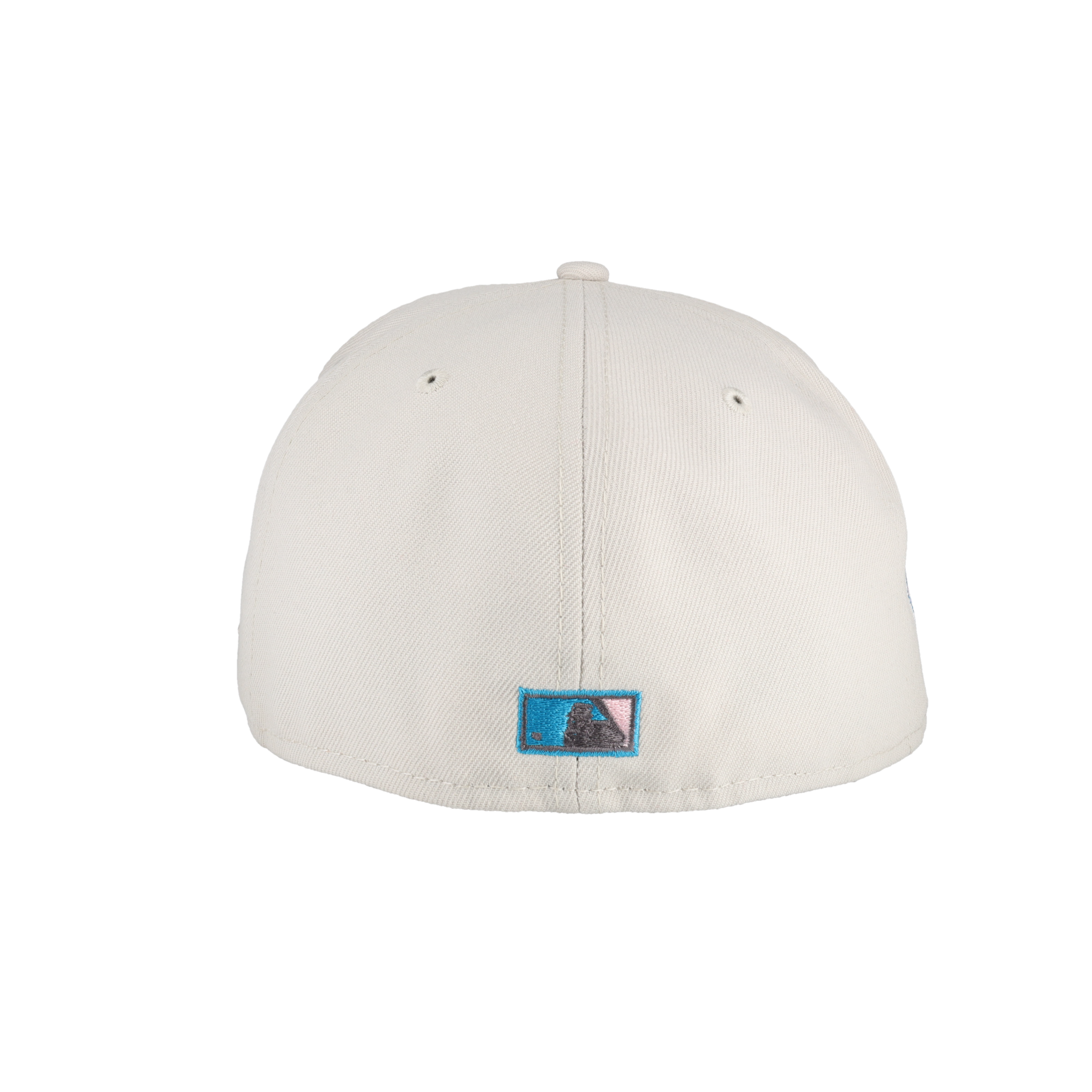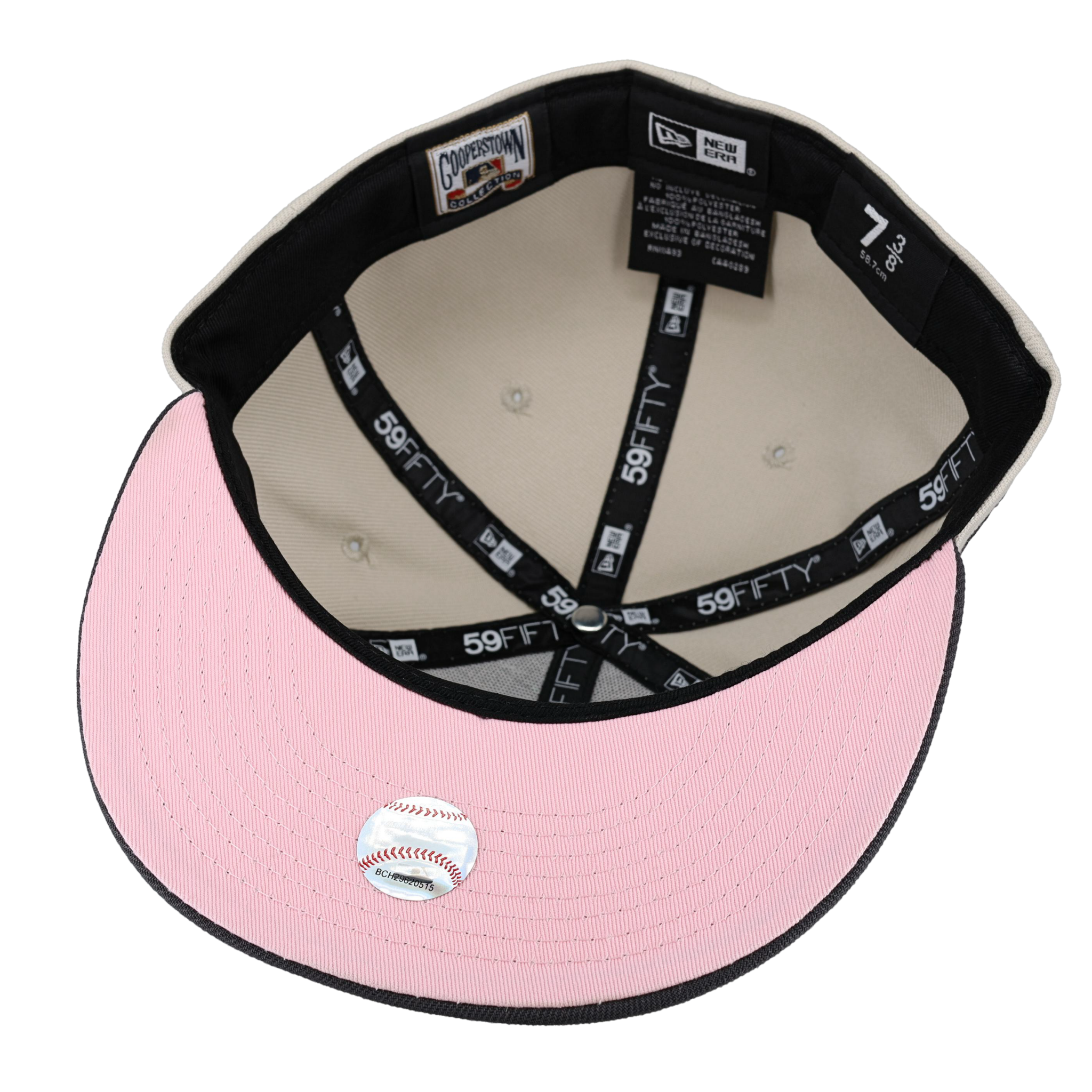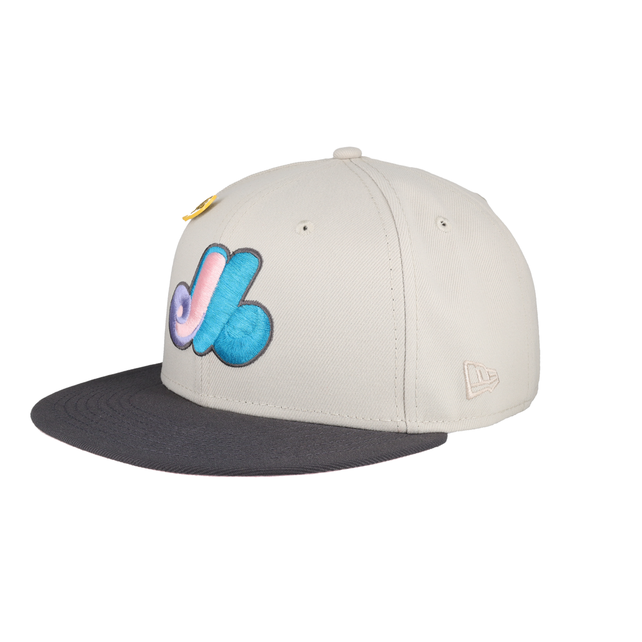 This New Era Montreal Expos 'Comet' 35 Years 2023 59FIFTY Fitted Hat was released by Capsule. The fitted has a chrome six panel structured high crown, embroidered eyelets and fabric squatchee button. The flat bill of the fitted cap is black with a pink bottom undervisor. The front panel features the Montreal Expos logo embroidery and a side patch embroidered on the right panel. The left panel of the fitted displays the New Era logo and the official MLB Batterman logo embroidered on the rear crown.