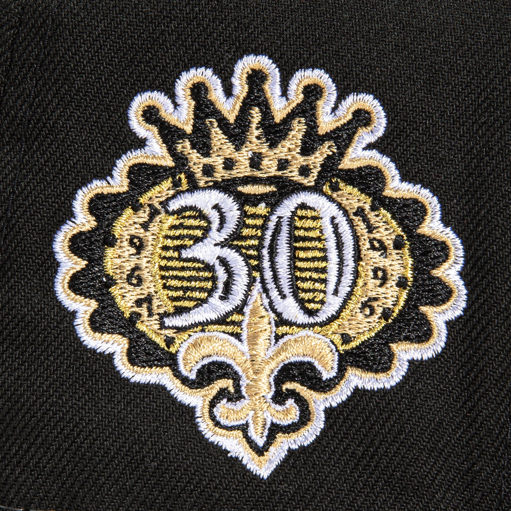 This New Era New Orleans SharkTooth Saints 30th Anniversary 59FIFTY Fitted Hat was released by Hat Club. The fitted has a black six panel structured high crown, fabric squatchee button and brim with a grey undervisor. The front panel features a shark tooth pattern with the New Orleans Saints logo embroidery. The left panel includes the New Era logo embroidery and the official NFL shield on the rear crown.