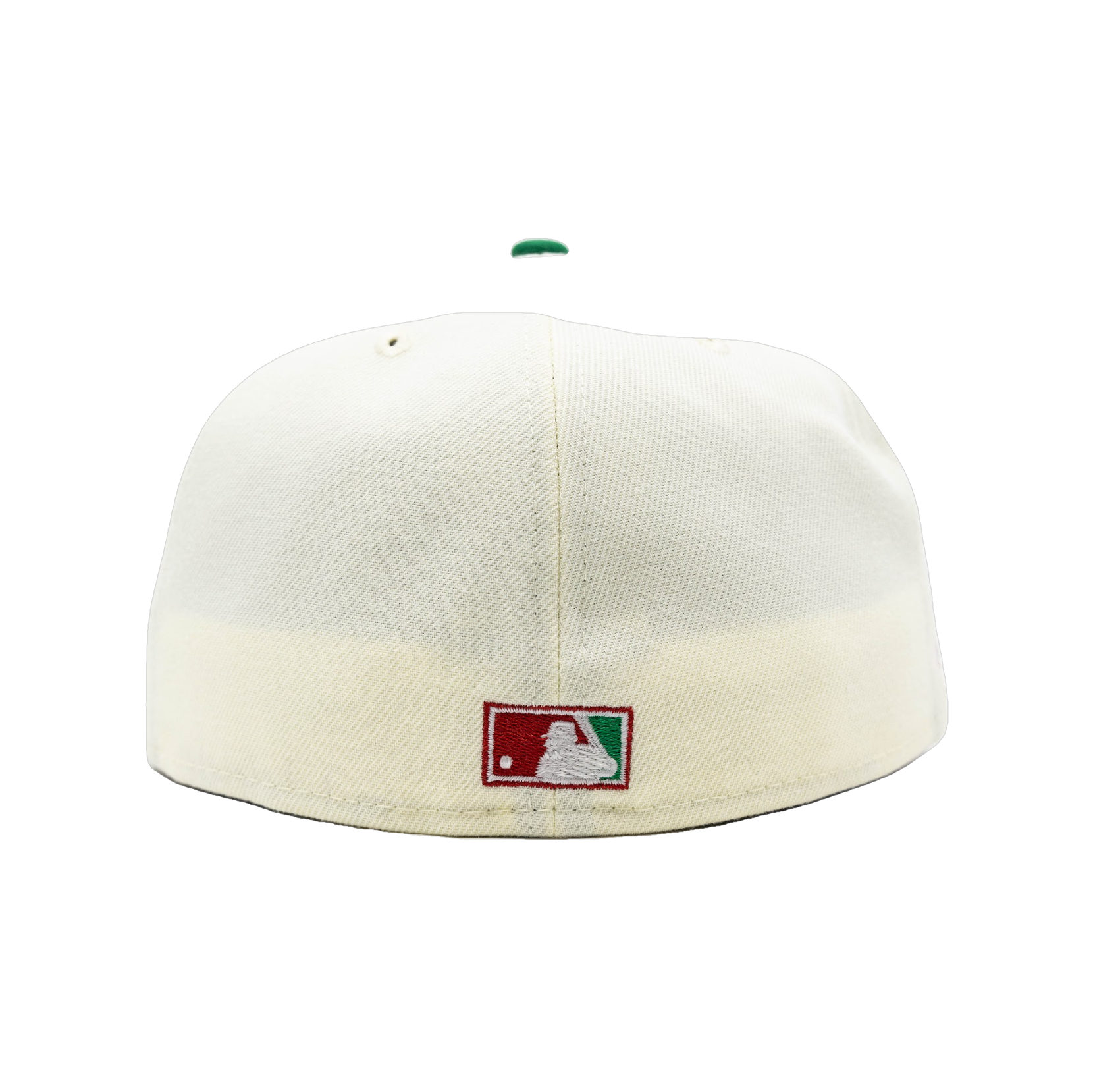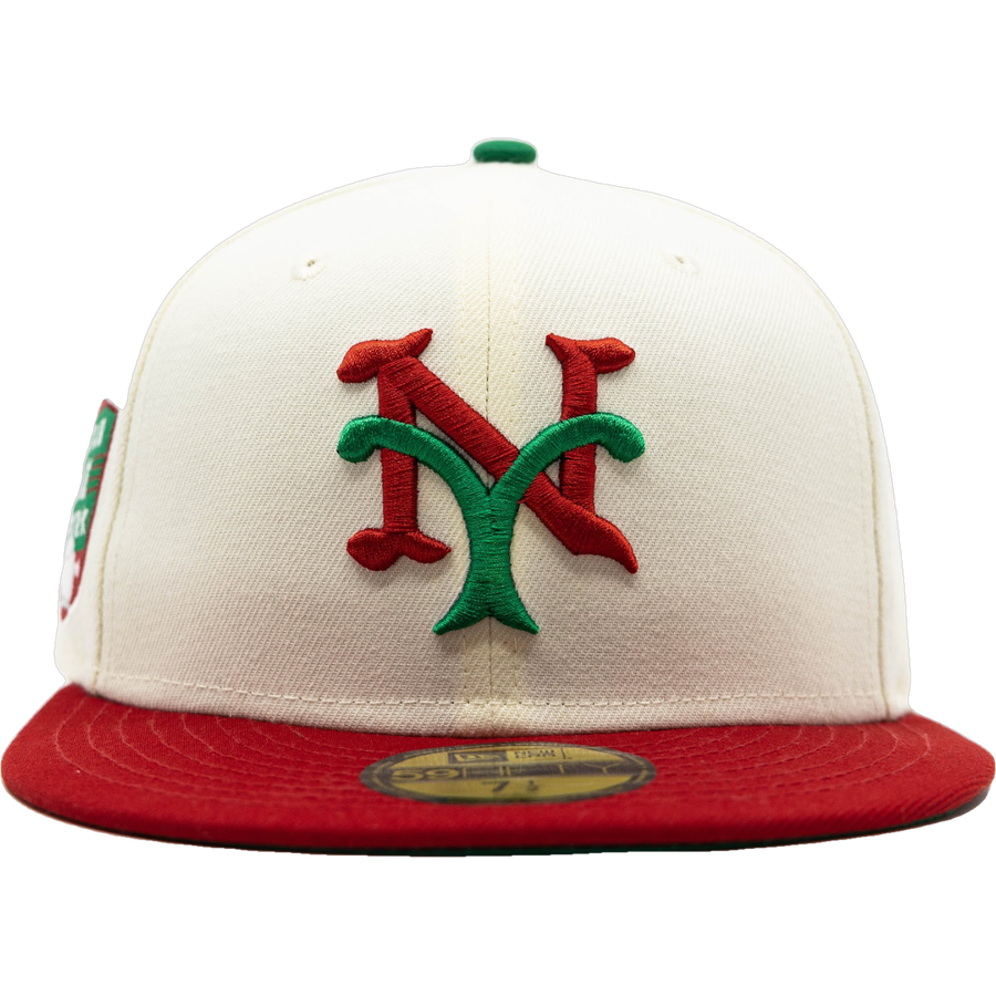This New Era New York Giants MLB 1934 All-Star Game 59FIFTY Fitted Hat was released by All The Right. The fitted has a white six panel structured high crown, embroidered eyelets and green fabric squatchee button. The flat bill of the fitted is also green. The front panel features the New York Giants (MLB) logo embroidery and a 1934 ASG side patch embroidered on the right panel. The left panel of the fitted displays the New Era logo and the official MLB logo embroidery on the rear crown.