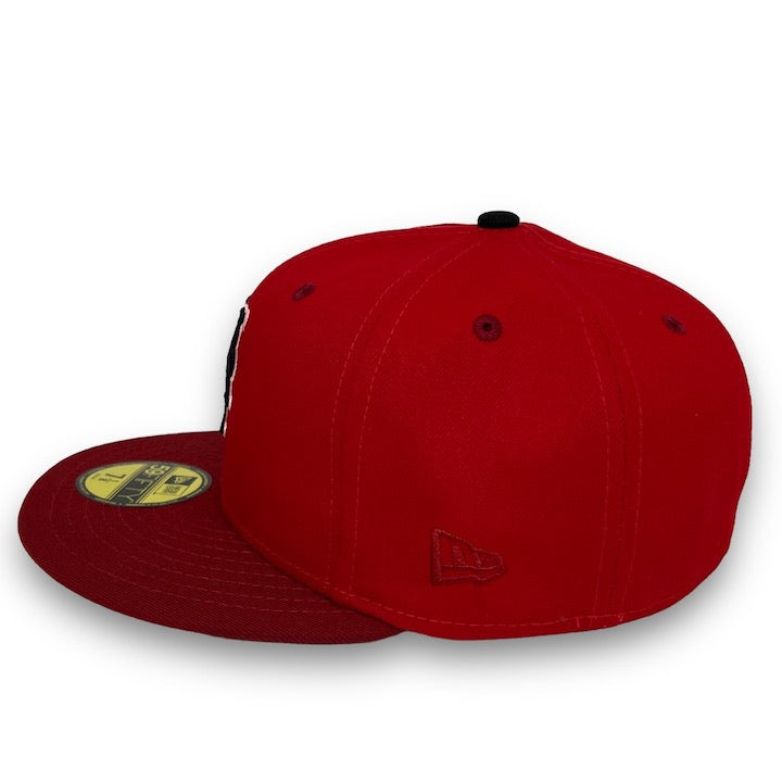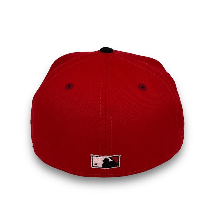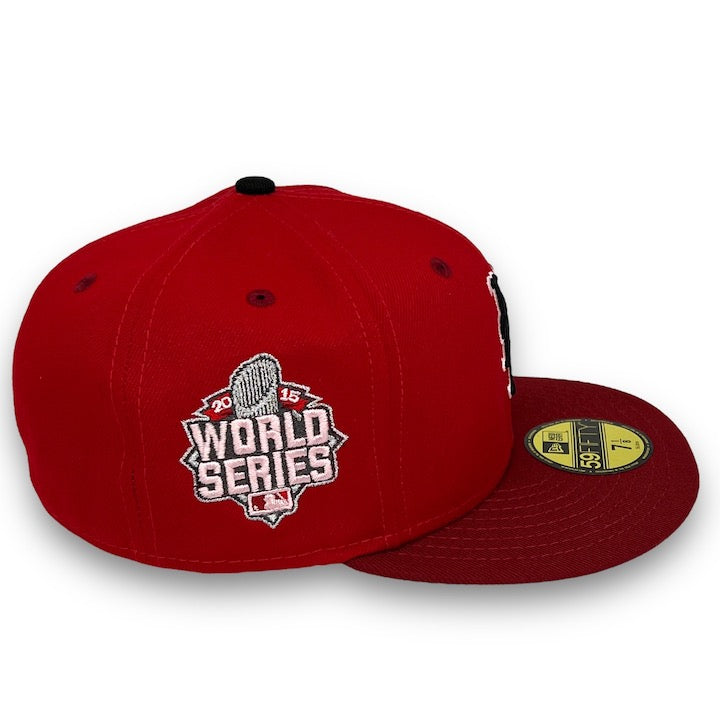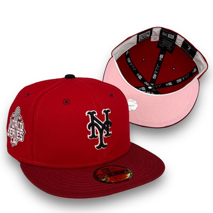 This New Era New York Mets 59FIFTY fitted hat was released by USA Cap King. The fitted has a red six panel structured high crown with a cardinal red embroidered eyelets and flat bill. The fabric squatchee button located at the top of the fitted is black. The cap has a pink undervisor with a white sweatband. The front panel features the New York Mets logo and a 2015 World Series side patch on the right panel.