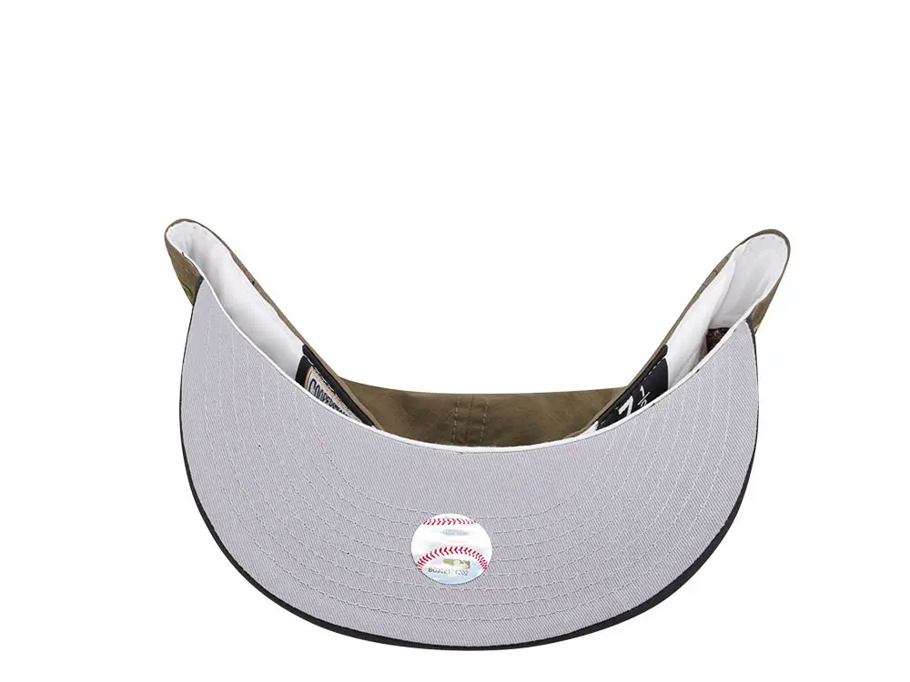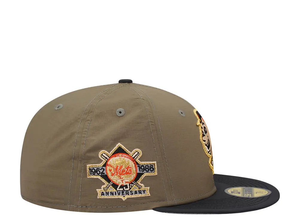 This New York Mets fitted hat was released by Topperz Store. The fitted has an olive green six panel structured high crown and embroidered eyelets with a black fabric squatchee button. The fitted cap also has a black flat bill with a grey undervisor and white sweatband. The front panel features the New York Mets Mr. Met logo embroidery and a 25th Anniversary side patch embroidery on the right panel. The left panel of the fitted displays the New Era logo and the official MLB Batterman logo embroidery on the rear crown.