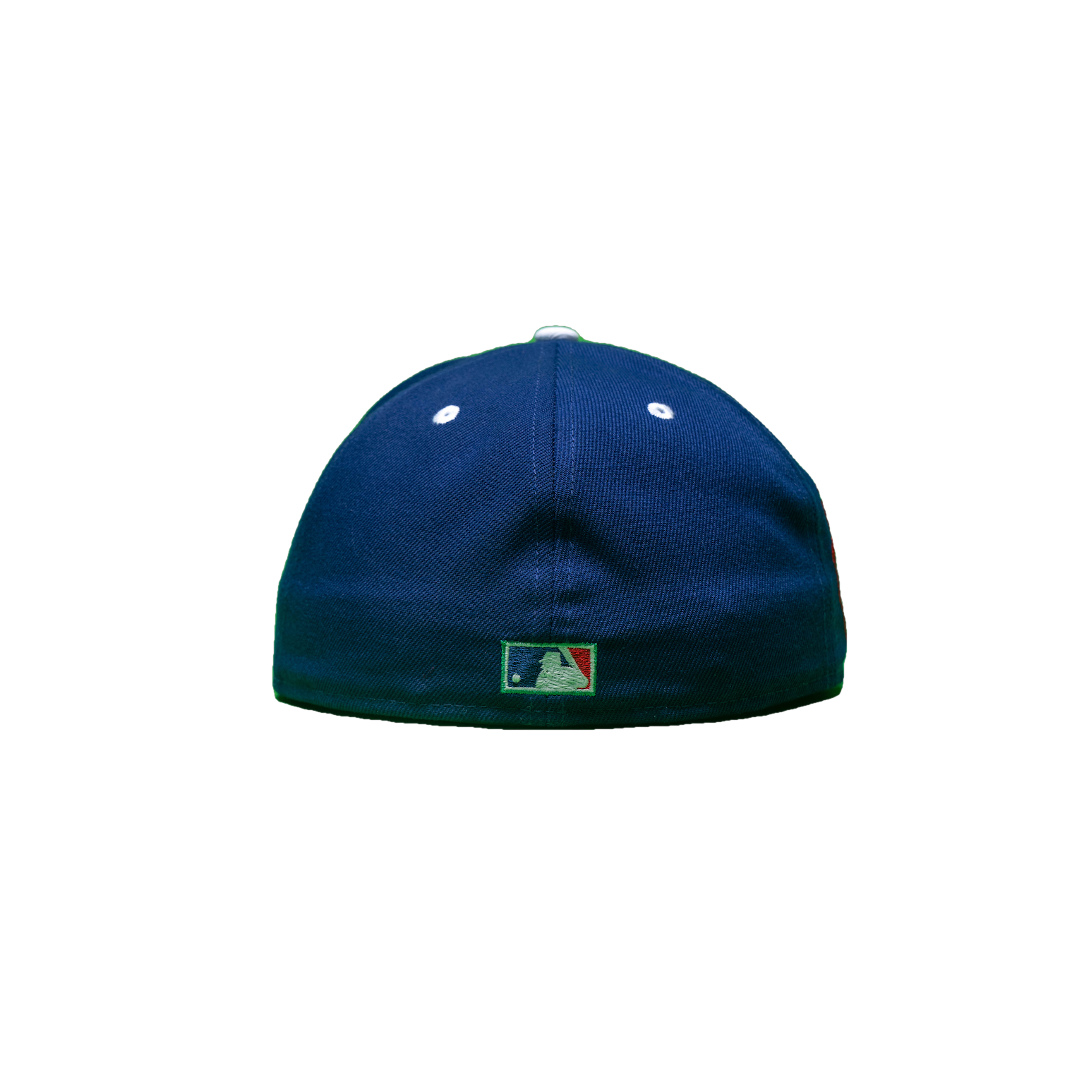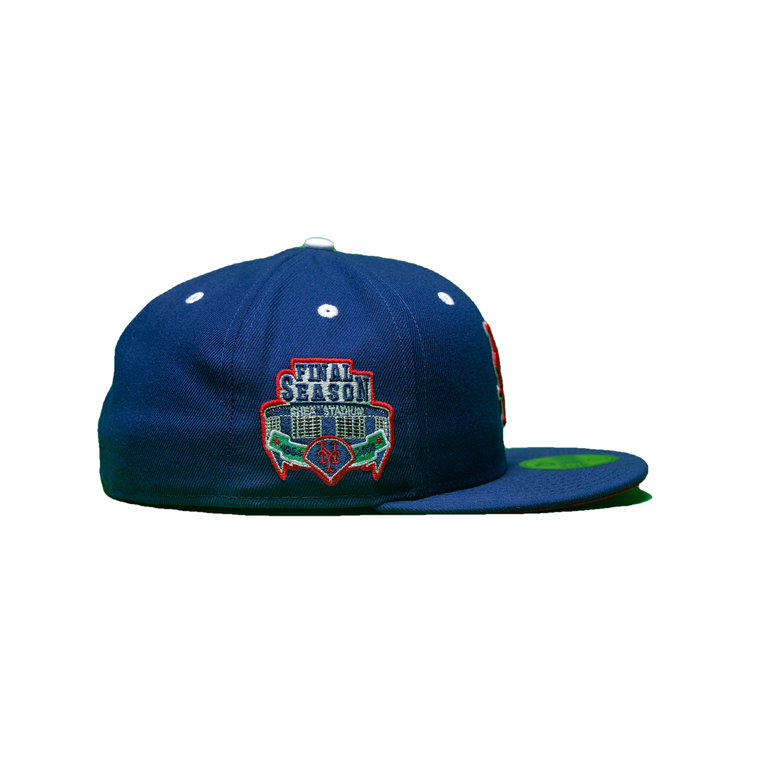 This New Era New York Mets Final Season 59FIFTY Fitted Hat was released by All The Right. The fitted has a blue six panel structured high crown, white embroidered eyelets and fabric squatchee button. The flat bill of the fitted is also blue. The front panel features the New York Mets logo embroidery and a final season side patch embroidered on the right panel. The left panel of the fitted displays the New Era logo and the official MLB logo embroidery on the rear crown.