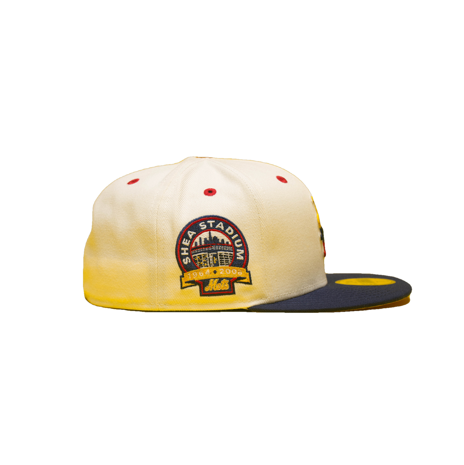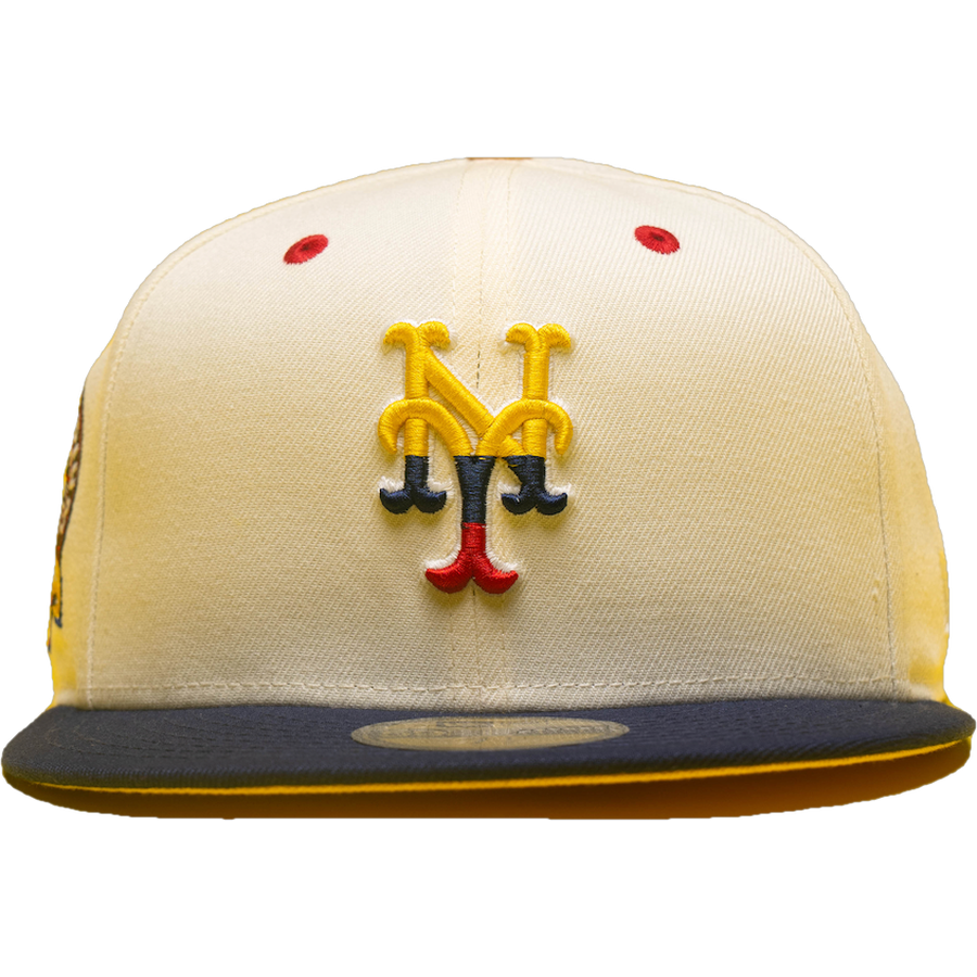 This New Era New York Mets Shea Stadium 59FIFTY Fitted Hat was released by All The Right. The fitted has a chrome six panel structured high crown, red embroidered eyelets and stats flat bill. The fitted cap has a yellow bottom undervisor. The front panel features the New York Mets logo embroidery and a Shea stadium side patch embroidered on the right panel. The left panel of the fitted displays the New Era logo and the official MLB logo embroidery on the rear crown.