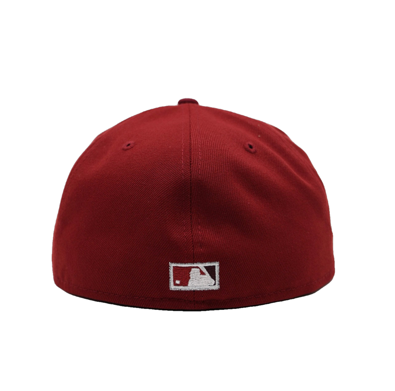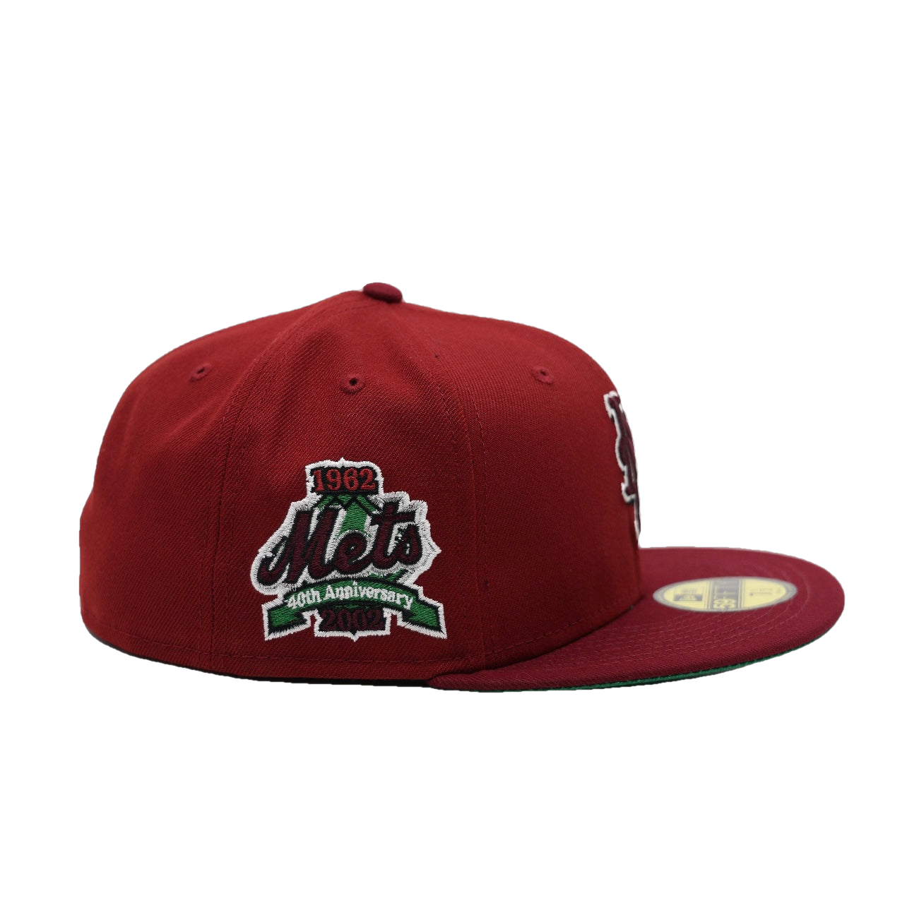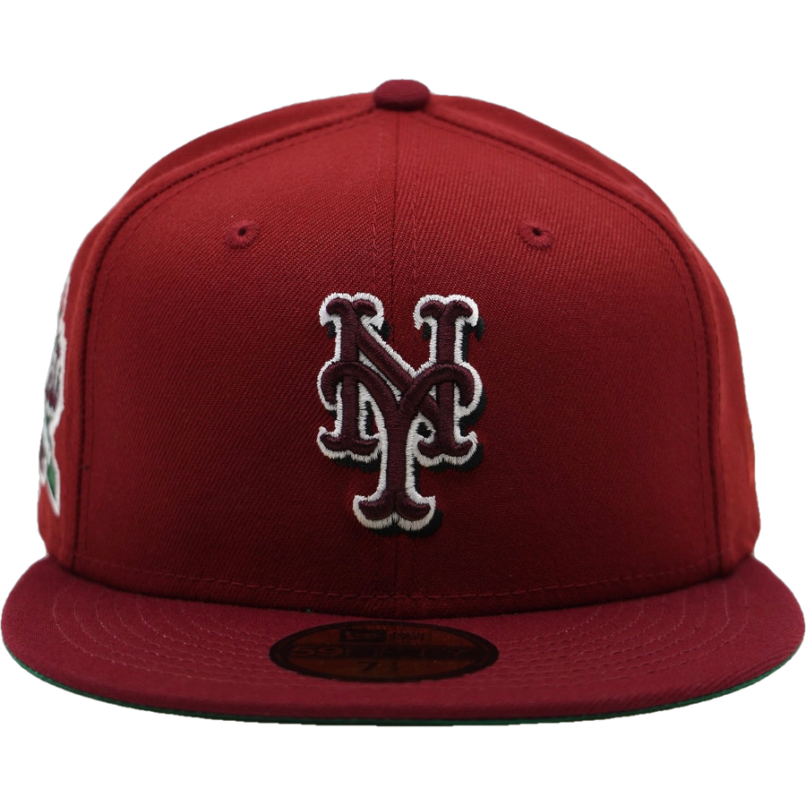 This New Era New York Mets "Qatar" 40th Anniversary 59FIFTY Fitted Hat was released by All The Right. The fitted has a burgundy six panel structured high crown, embroidered eyelets and flat bill. The front panel features the New York Mets logo embroidery and a side patch embroidered on the right panel. The left panel of the fitted displays the New Era logo and the official MLB logo embroidery on the rear crown.