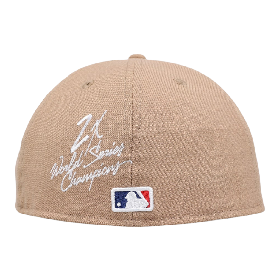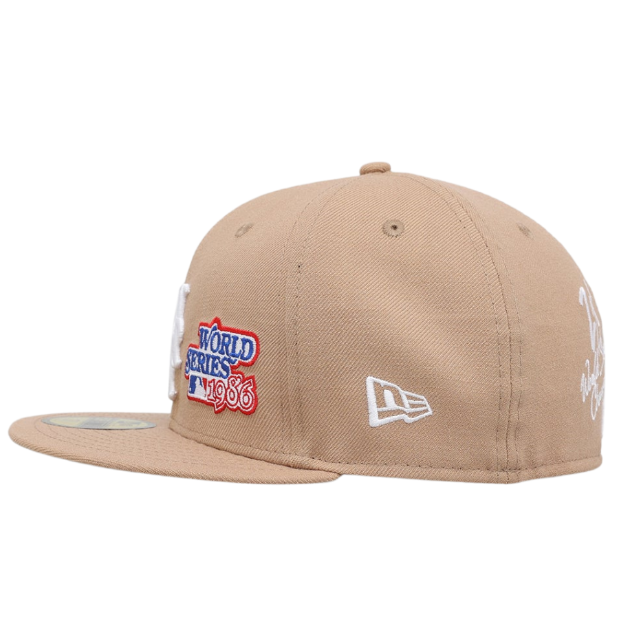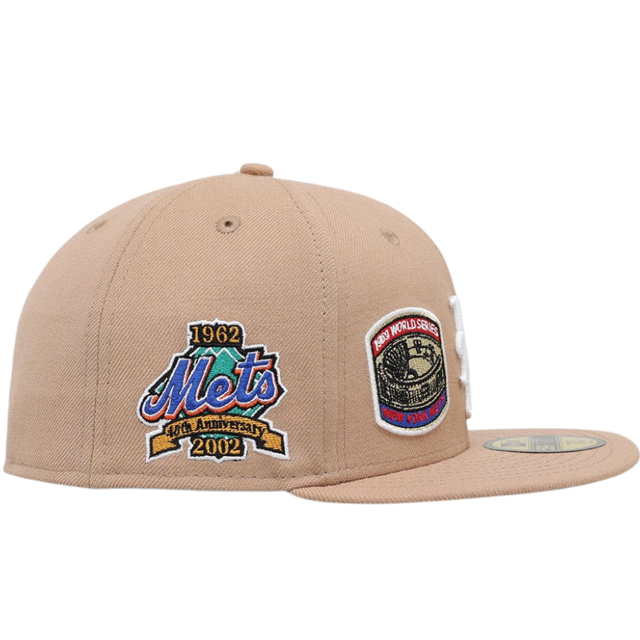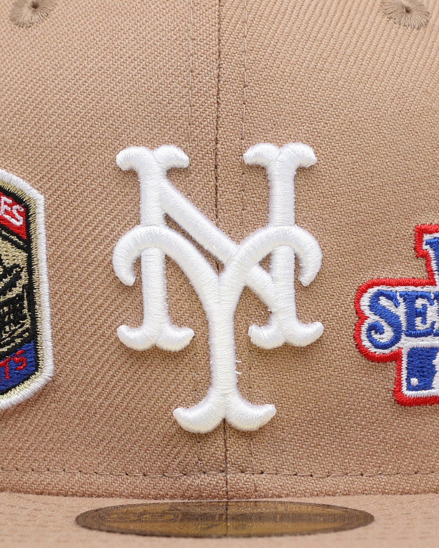 This New Era New York Mets 'World Series Multi Logo' Tumbleweed 2023 59FIFTY Fitted Hat was released by Culture Kings. The fitted has a tan six panel structured high crown and embroidered eyelets with a tan fabric squatchee button. The flat bill of the fitted cap is also tan with a gray undervisor and black sweatband. The front panel features the New York Mets logo embroidery and the New Era "Fly Your Own Flag" logo on the left panel. The rear crown has the official MLB logo on display.