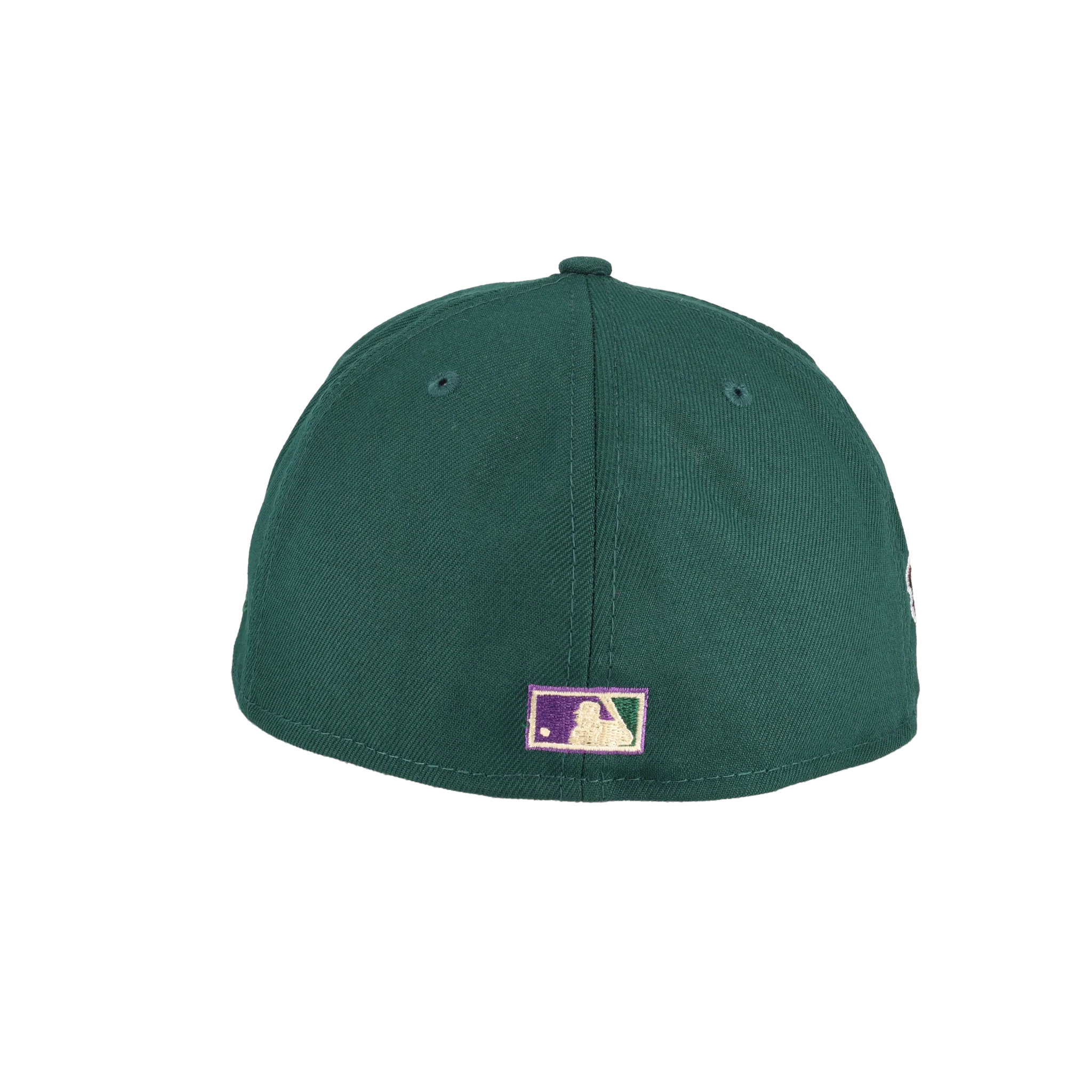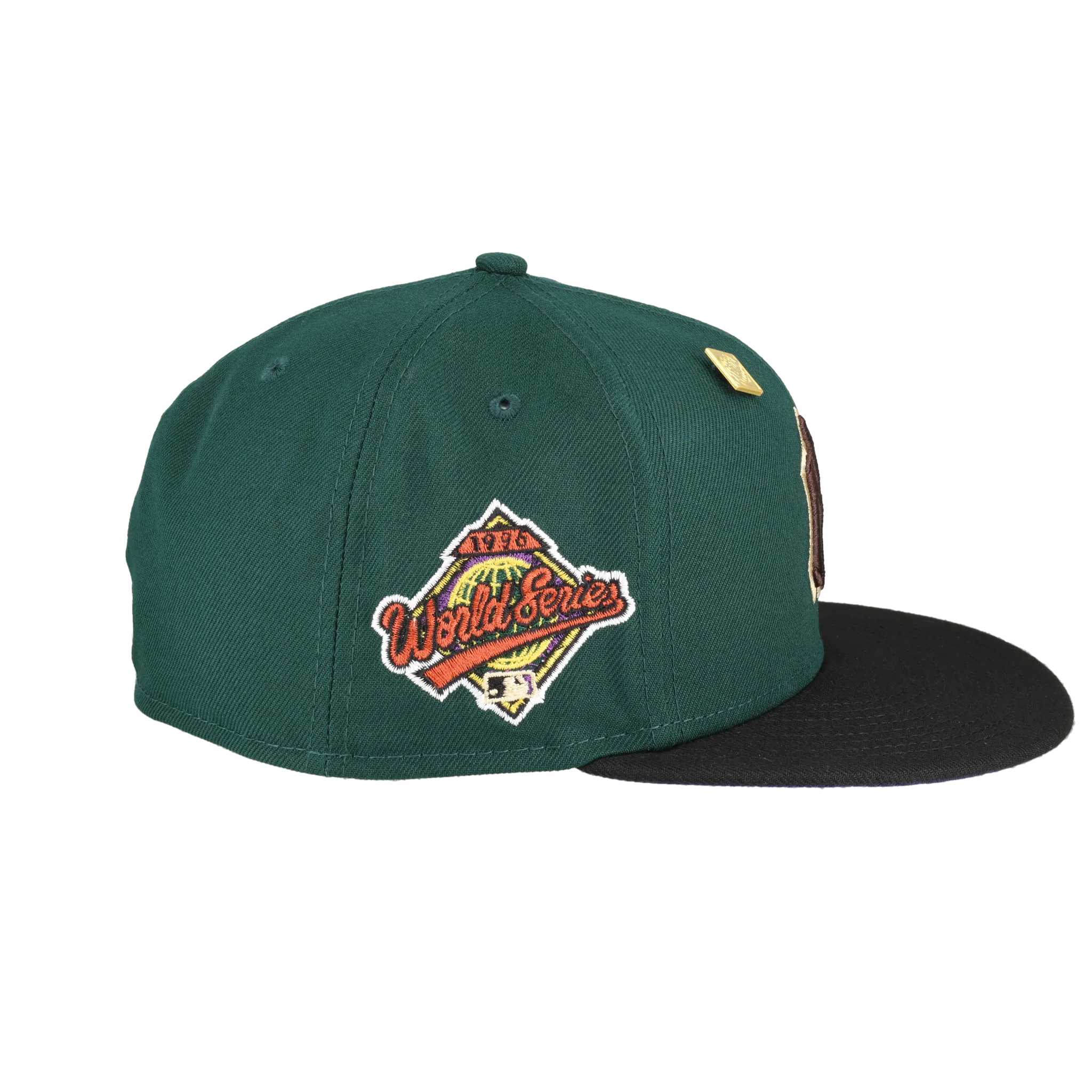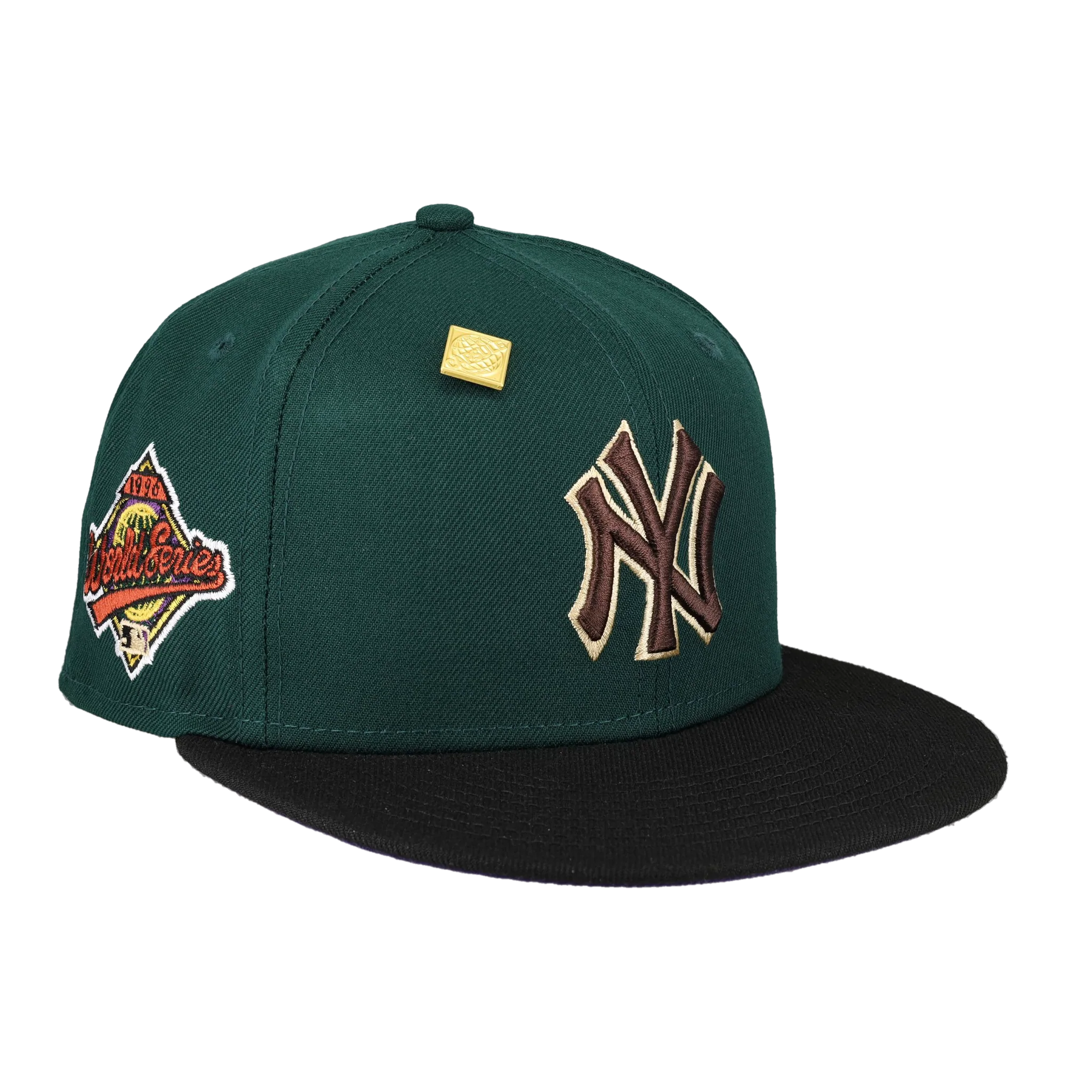 This New Era New York Yankees Green Bark Collection 1996 World Series 59FIFTY Fitted Hat was released by Capsule. The fitted has a dark green six panel structured high crown, embroidered eyelets and fabric squatchee button. The flat bill of the fitted cap is also black with a purple bottom undervisor and black sweatband. The front panel features the New York Yankees logo embroidery and a side patch embroidered on the right panel. The left panel of the fitted displays the New Era logo and the official MLB logo insignia embroidered on the rear crown.