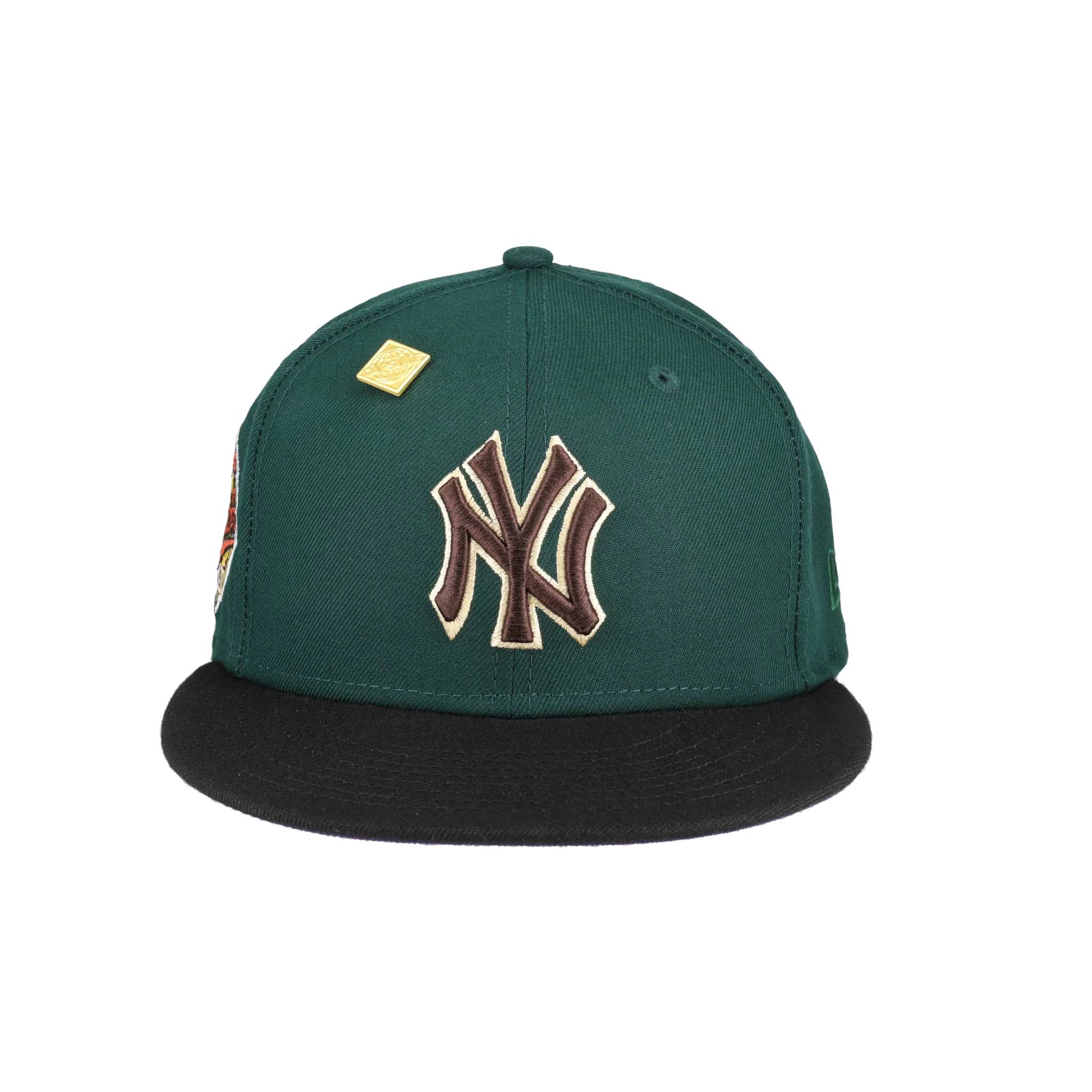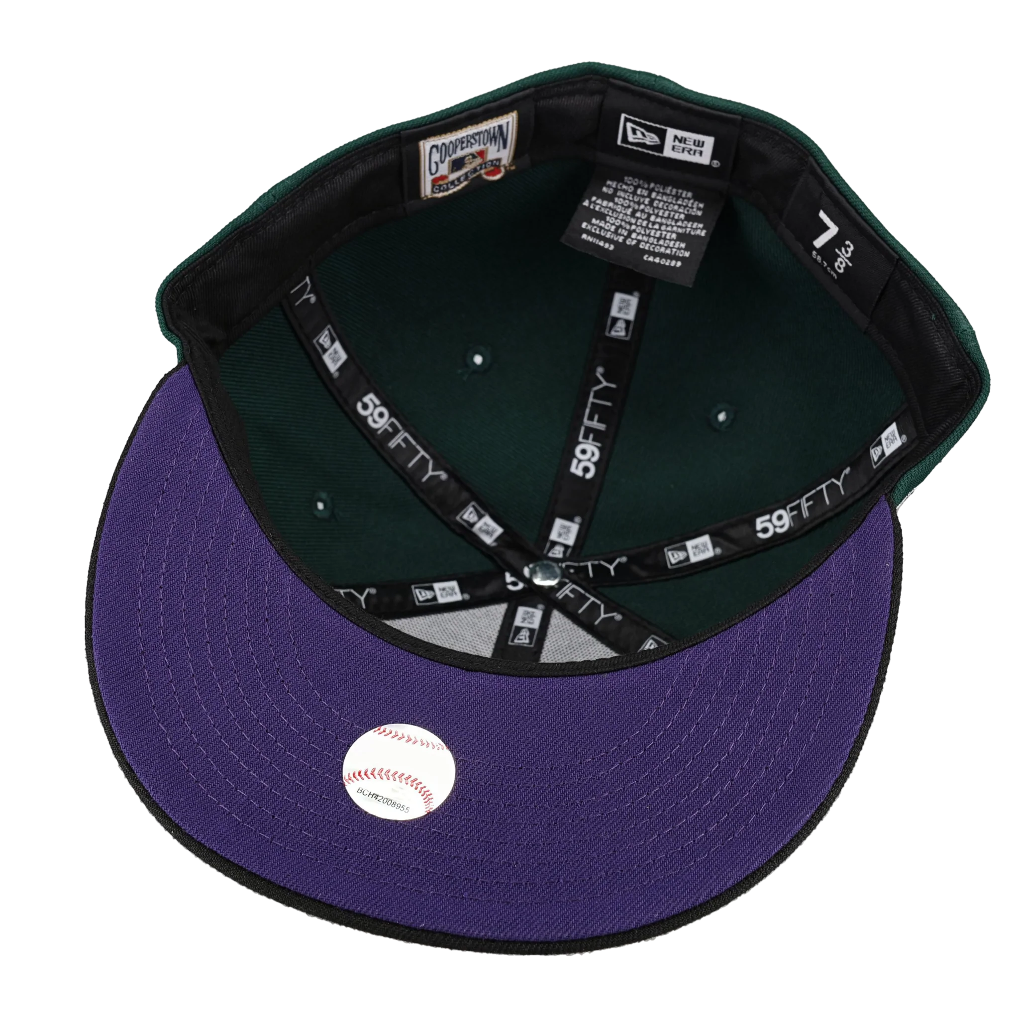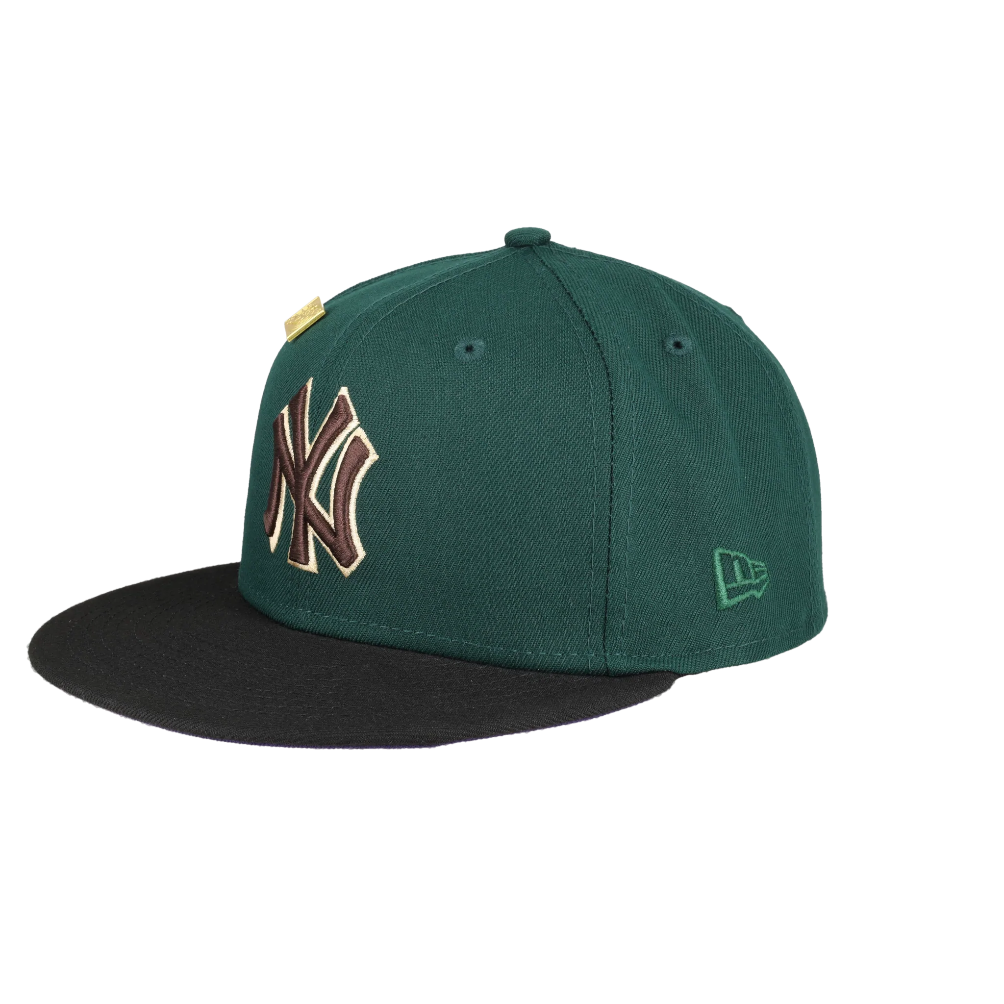 This New Era New York Yankees Green Bark Collection 1996 World Series 59FIFTY Fitted Hat was released by Capsule. The fitted has a dark green six panel structured high crown, embroidered eyelets and fabric squatchee button. The flat bill of the fitted cap is also black with a purple bottom undervisor and black sweatband. The front panel features the New York Yankees logo embroidery and a side patch embroidered on the right panel. The left panel of the fitted displays the New Era logo and the official MLB logo insignia embroidered on the rear crown.