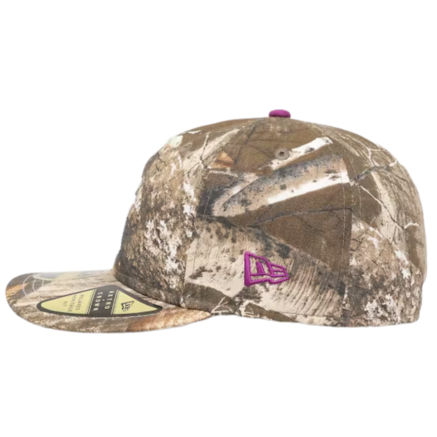 This New Era New York Yankees Realtree Camo/Magenta Low Profile 59FIFTY Fitted Hat has a realtree six panel structured high crown and embroidered eyelets with a realtree fabric squatchee button. The fitted cap has a realtree flat bill with a grey undervisor. The front panel features the New York Yankees logo embroidery and a magenta Subway Series side patch embroidery on the right panel. The left panel of the fitted displays the New Era logo and the official MLB logo embroidery on the rear crown.