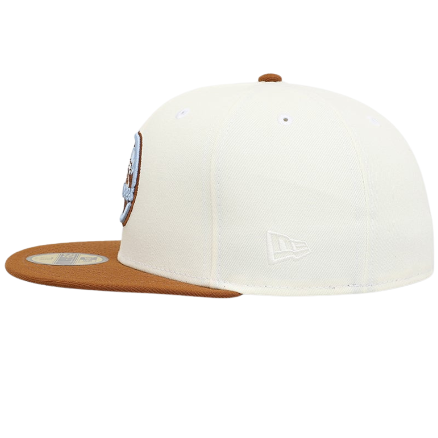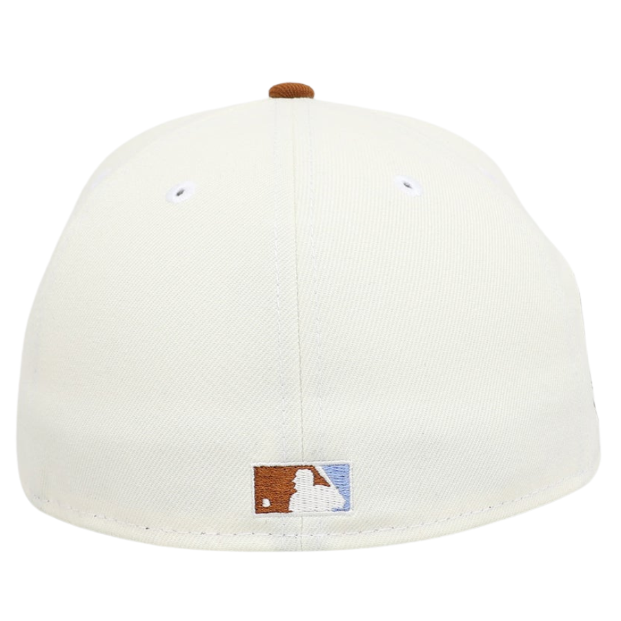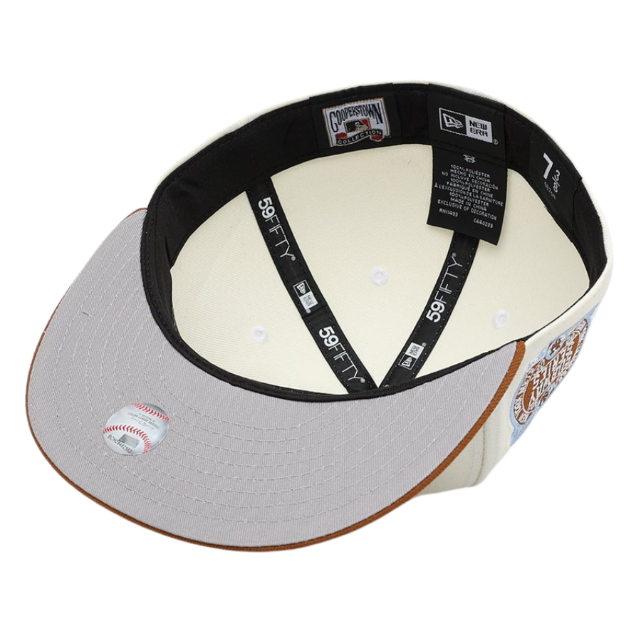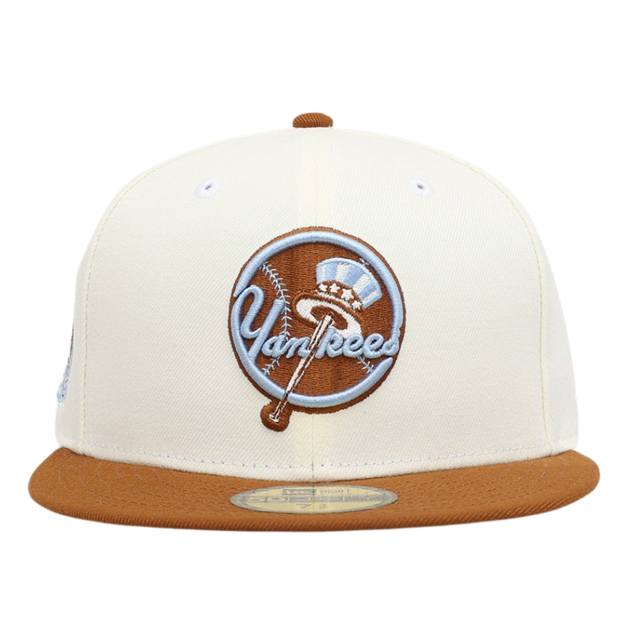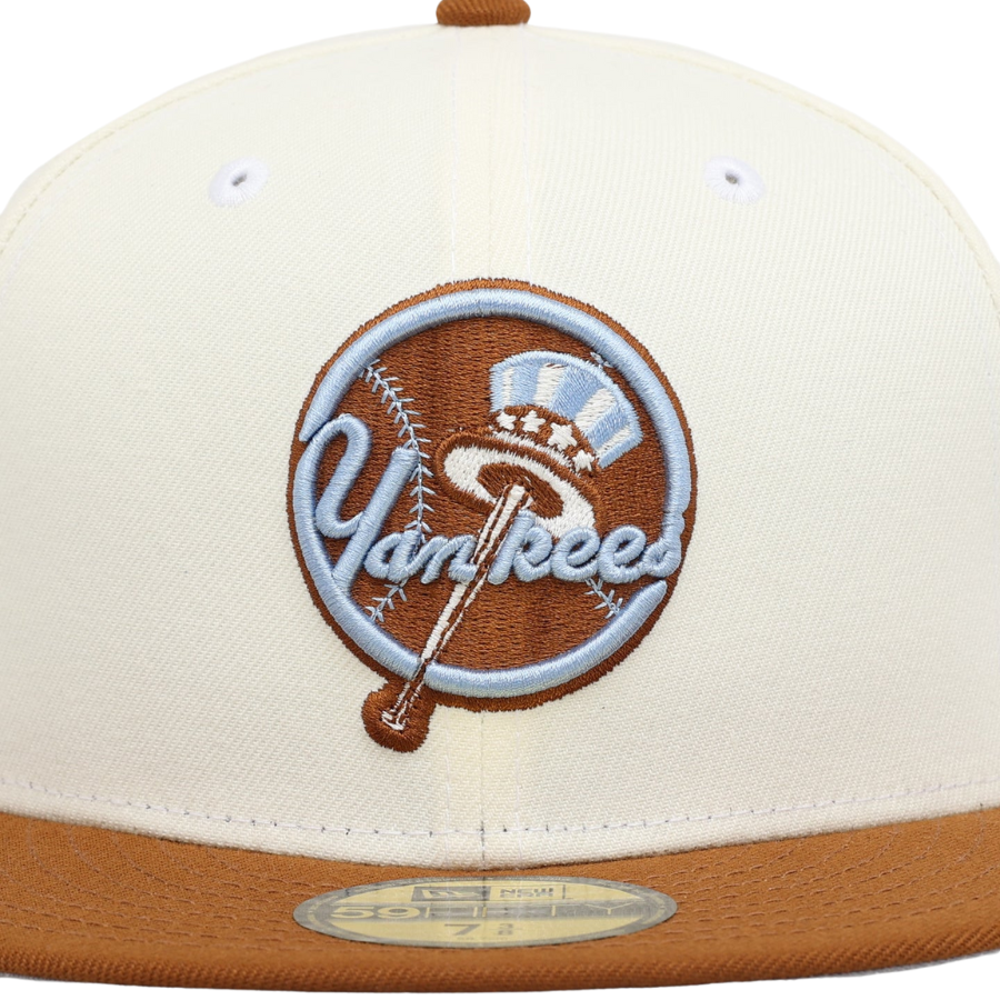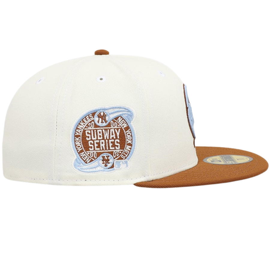 This New York Yankees fitted hat was released by Culture kings. The fitted has a white six panel structured high crown and embroidered eyelets with a toasted peanut fabric squatchee button. The flat bill of the cap is toasted peanut with a grey undervisor and black sweatband. The front panel features the New York Yankees logo embroidery and a Subway Series side patch embroidery on the right panel. The left panel of the fitted displays the New Era logo and the official MLB Batterman logo embroidery on the rear crown.