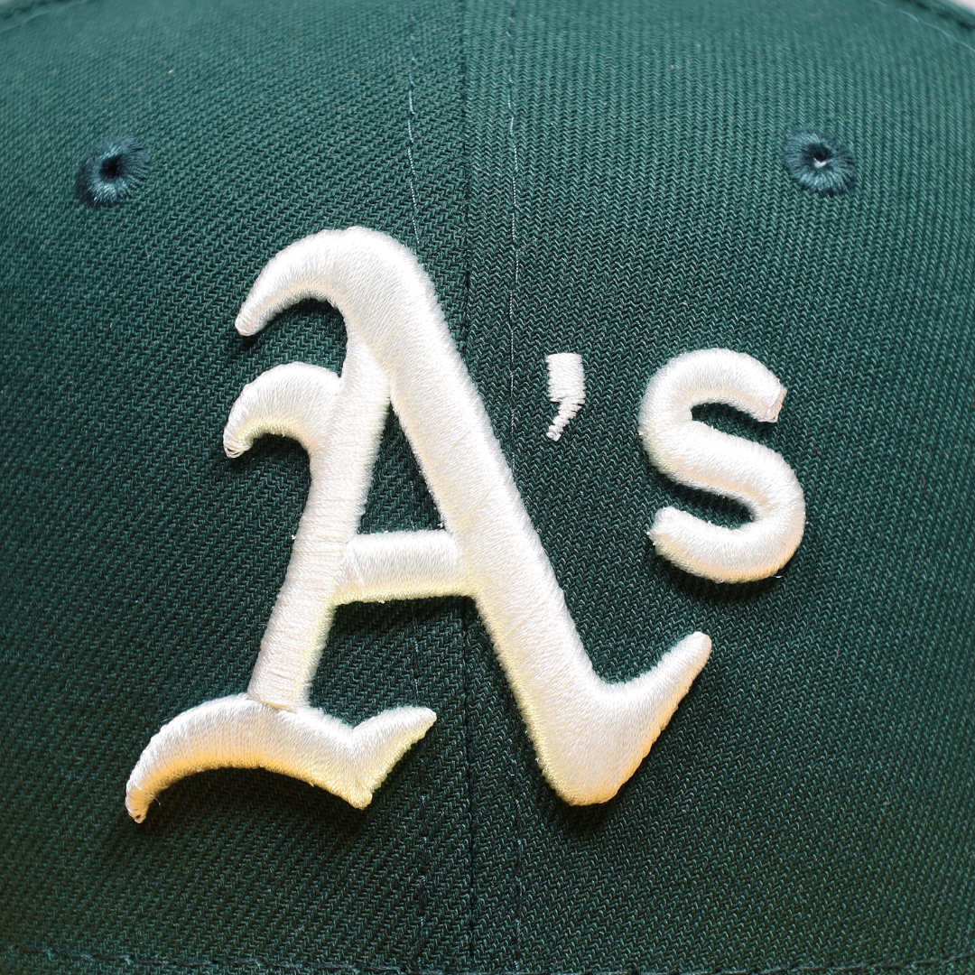 This New Era Oakland Athletics 1974 World Series 59FIFTY Fitted Hat has a six panel structured high crown and embroidered eyelets with a fabric squatchee button. The fitted cap has a flat bill with a sweatband. The front panel features the Oakland Athletics logo embroidery.
