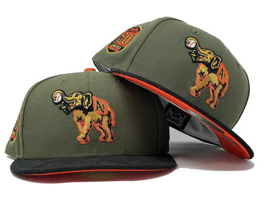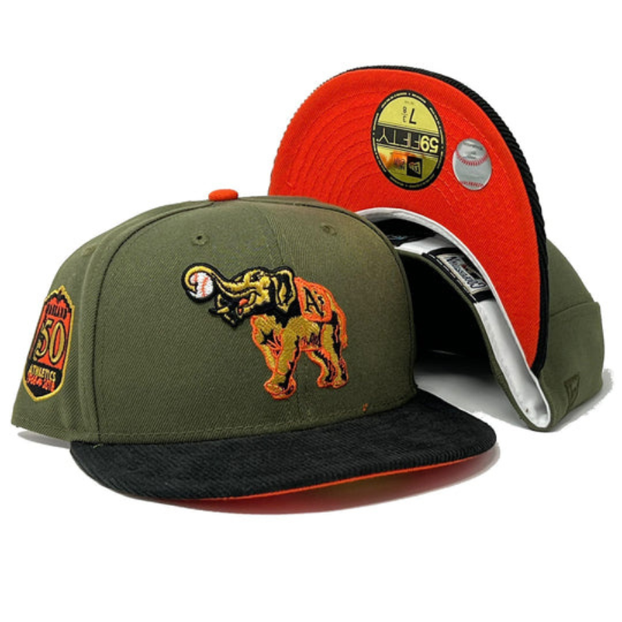 This New Era Oakland Athletics "Corduroy Brim" Pack 50th Anniversary fitted hat has an olive green six panel structured high crown and embroidered eyelets with a orange fabric squatchee button. The fitted cap also has a black corduroy flat bill with an orange undervisor. The front panel features the Oakland A's Stomper logo embroidery and a 50th Anniversary side patch embroidery on the right panel. The left panel of the fitted displays the New Era logo and the official MLB logo embroidery on the rear crown.
