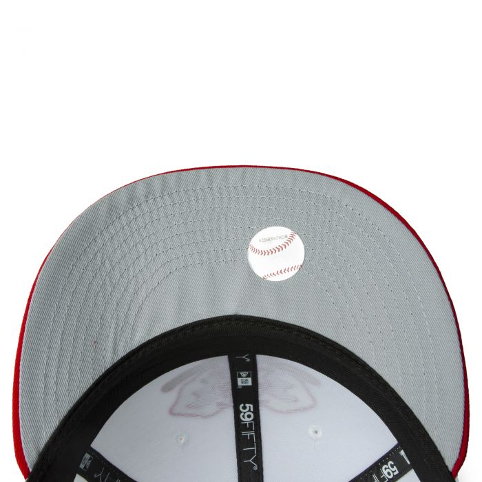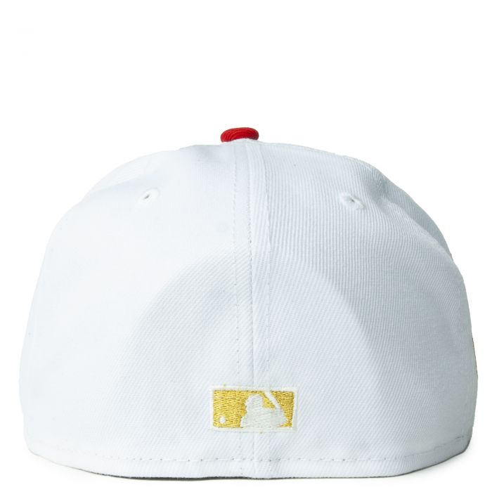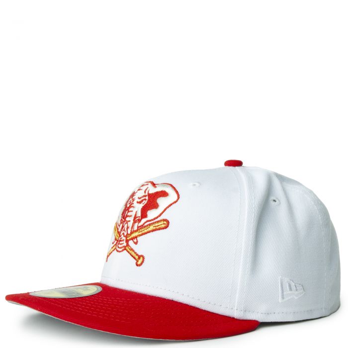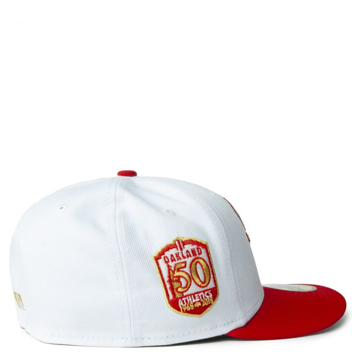 This New Era Oakland Athletics Stomper White/Red/Gold 50th Anniversary 59FIFTY Fitted Hat was released by Karma Loop. The fitted has a white six panel structured high crown and embroidered eyelets with a red fabric squatchee button. The fitted cap also has a red flat bill with a grey undervisor and black sweatband. The front panel features the Stomper logo embroidery and a 50th Anniversary side patch embroidery on the right panel. The left panel of the fitted displays the New Era logo and the official MLB Batterman logo embroidery on the rear crown.