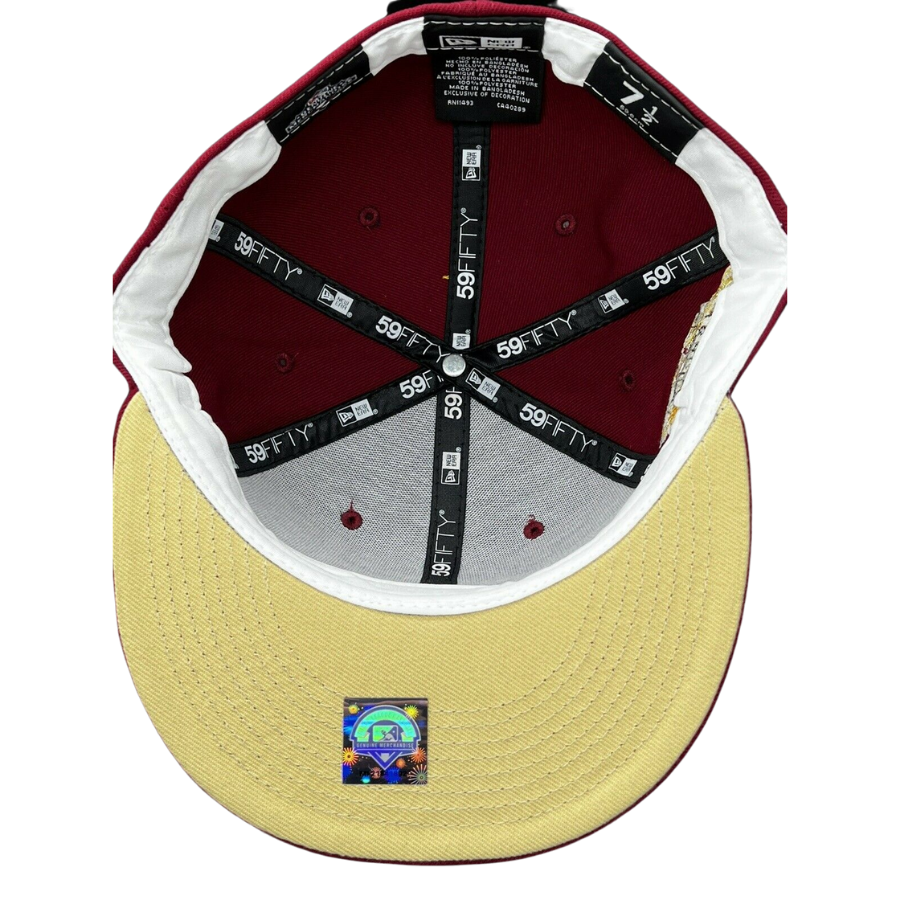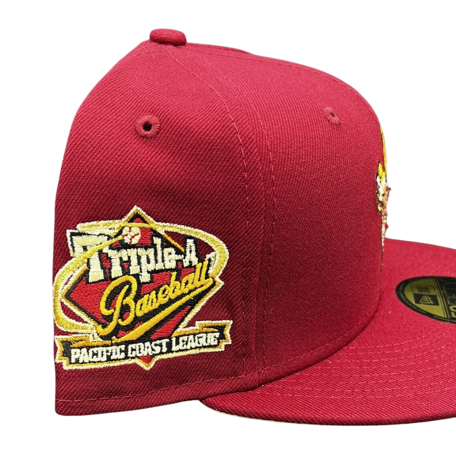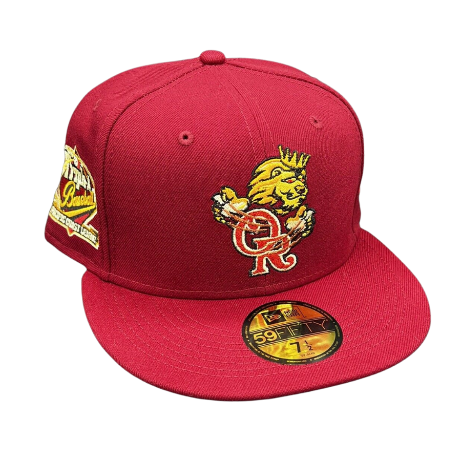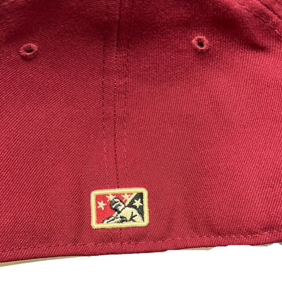 This New Era Omaha Royals 'Harry Potter and the Chamber of Secrets Gryffindor' inspired fitted hat is a My Fitteds exclusive release. The fitted has a burgundy six panel structured high crown, embroidered eyelets and fabric squatchee button. The flat bill of the fitted cap is burgundy with an old gold undervisor and white sweatband. The front panel features the Omaha Royals, now the Omaha Storm Chasers, logo embroidery on the front panel and a Triple-A Baseball Pacific Coast League side patch embroidered on the right panel. The fitted hat colorway was inspired by the J.K Rowling children book Harry Potter and the Chamber of Secrets Gryffindor.