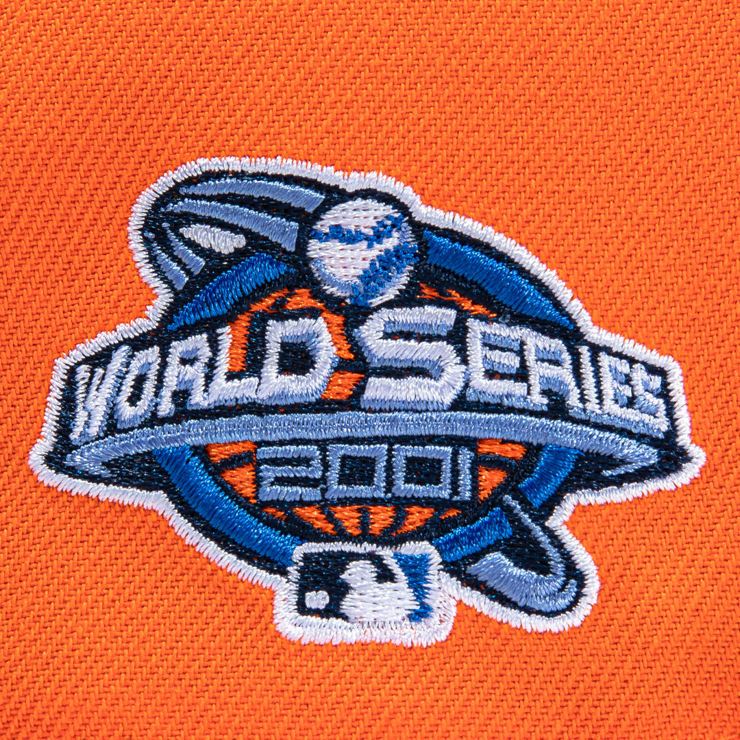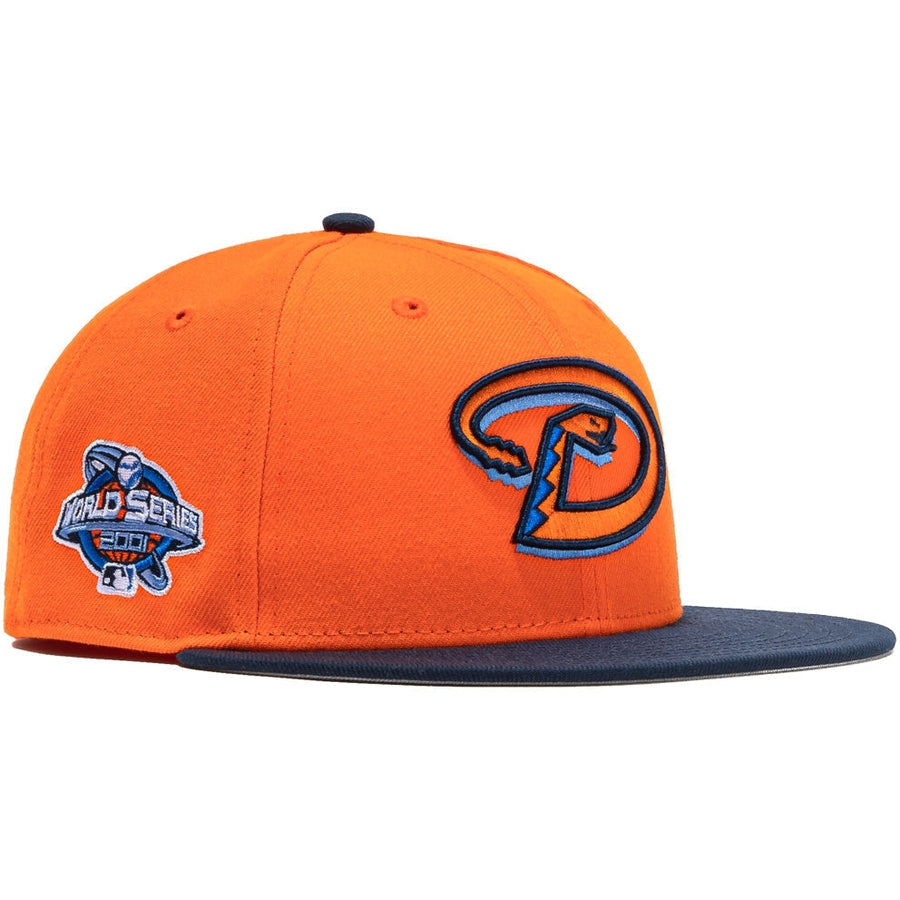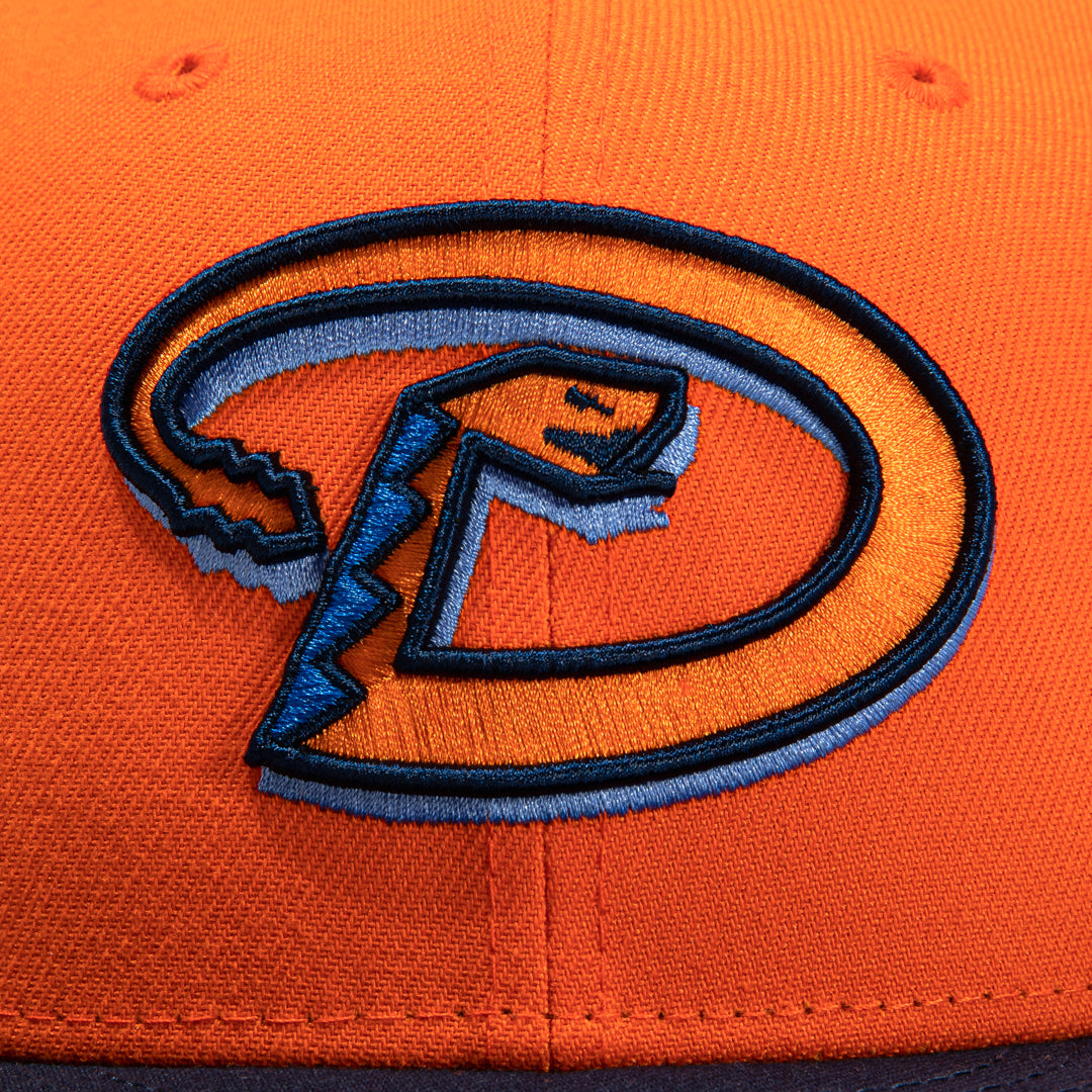 This New Era Arizona Diamondbacks Orange Crush 59FIFTY fitted hat has an orange six panel structured high crown and embroidered eyelets with a navy blue fabric squatchee button. The fitted cap also has a navy blue flat bill with a grey undervisor and black sweatband. The front panel features the Arizona Diamondbacks logo embroidery, with a side patch embroidery on the right panel. The left panel of the fitted displays the New Era logo with the official MLB logo embroidery on the rear crown.