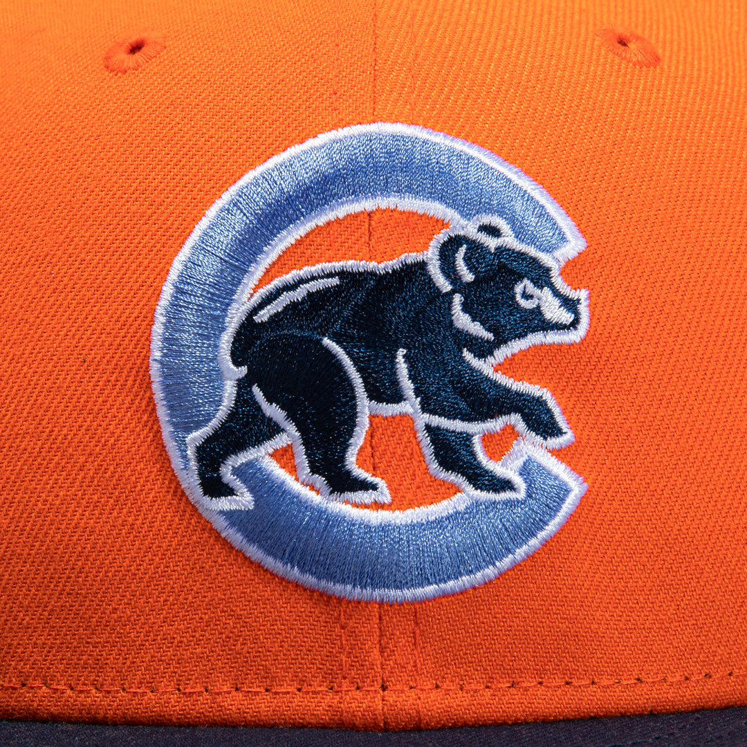 This New Era Chicago Cubs Orange Crush 59FIFTY fitted hat has an orange six panel structured high crown and embroidered eyelets with a navy blue fabric squatchee button. The fitted cap also has a navy blue flat bill with a grey undervisor and black sweatband. The front panel features the Chicago Cubs logo embroidery, with a side patch embroidery on the right panel. The left panel of the fitted displays the New Era logo with the official MLB logo embroidery on the rear crown.