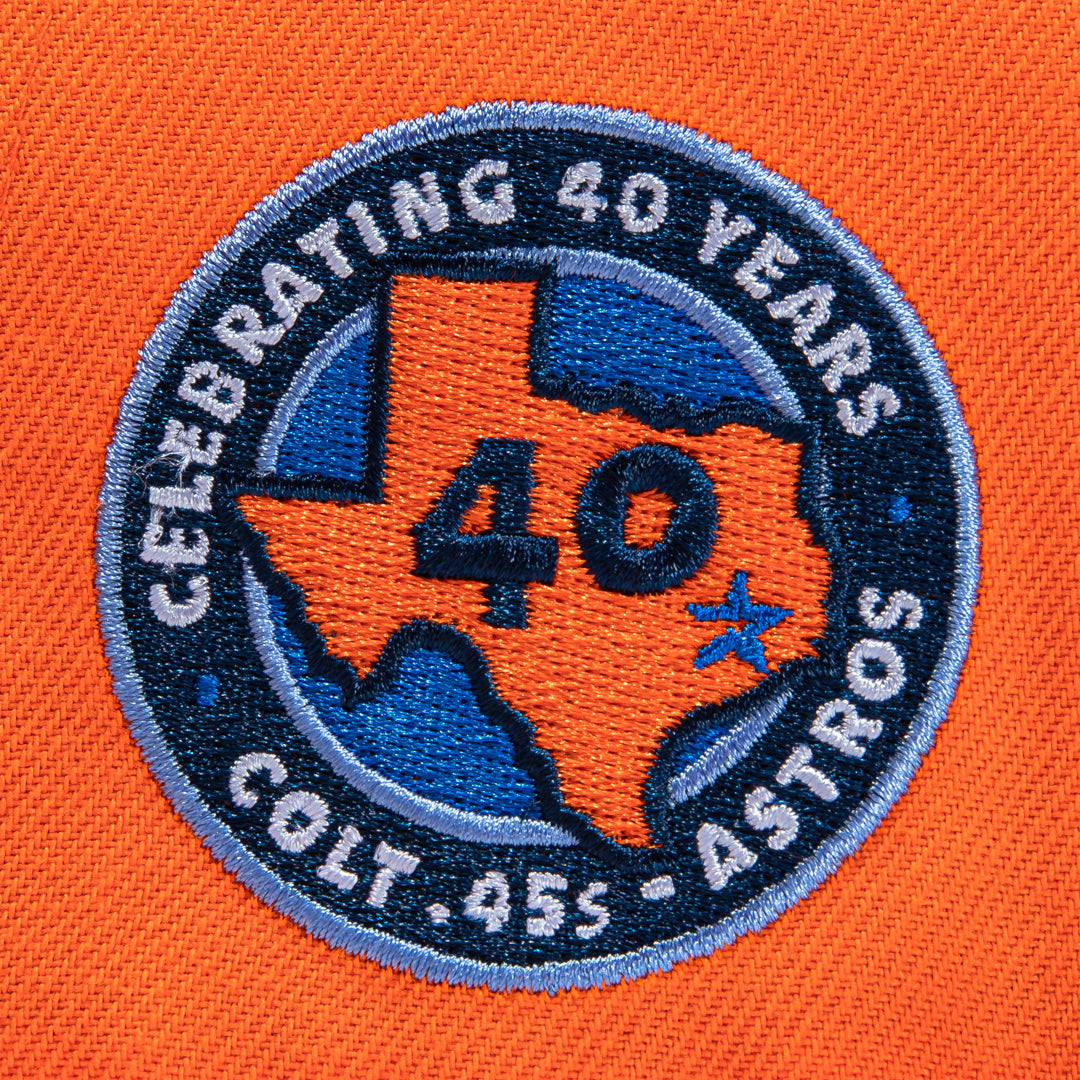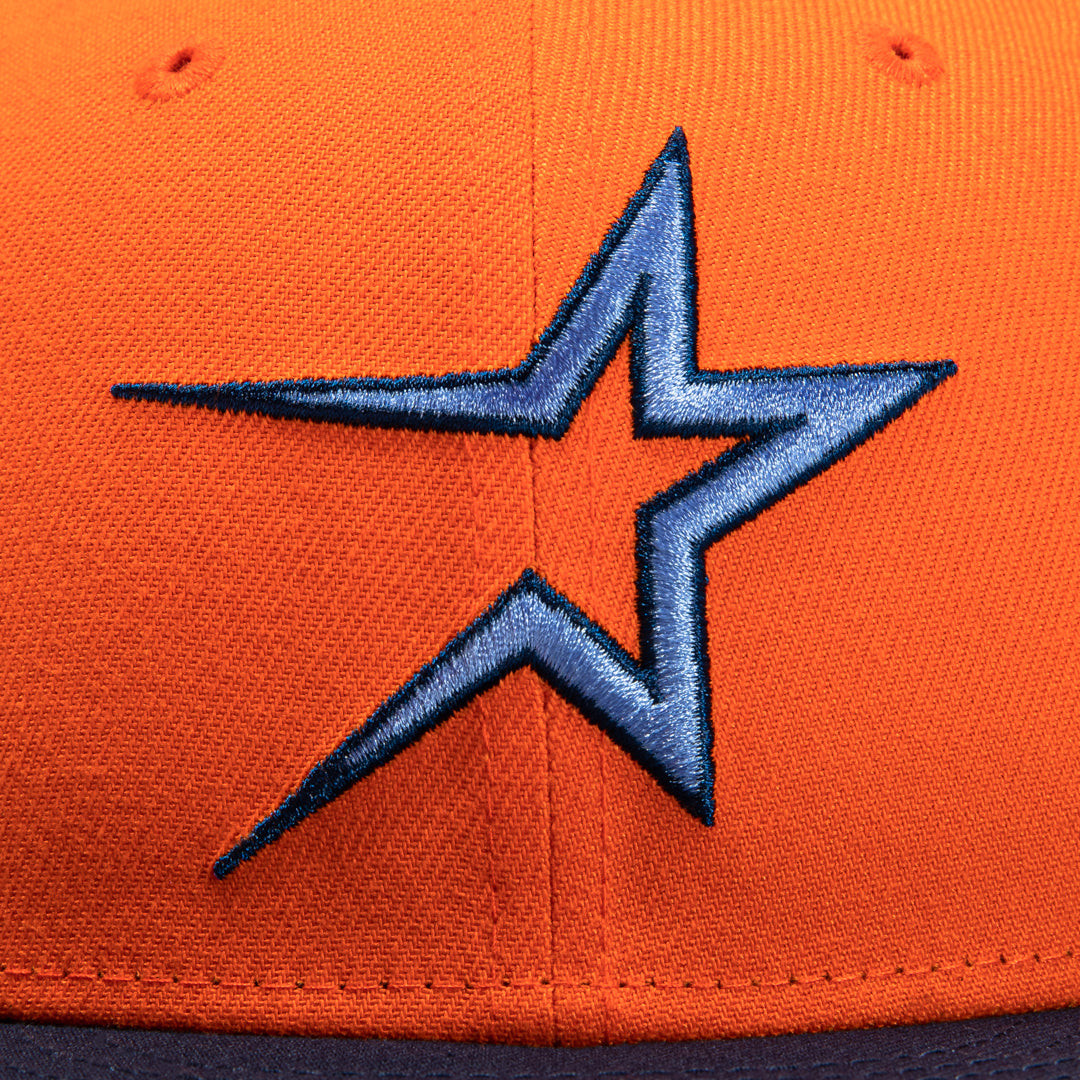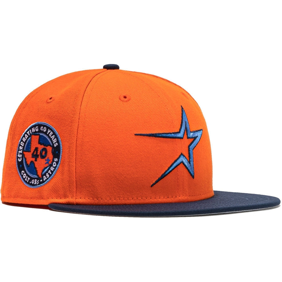 This New Era Houston Astros Orange Crush 59FIFTY fitted hat has an orange six panel structured high crown and embroidered eyelets with a navy blue fabric squatchee button. The fitted cap also has a navy blue flat bill with a grey undervisor and black sweatband. The front panel features the Houston Astros logo embroidery, with a side patch embroidery on the right panel. The left panel of the fitted displays the New Era logo with the official MLB logo embroidery on the rear crown.