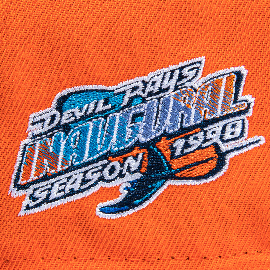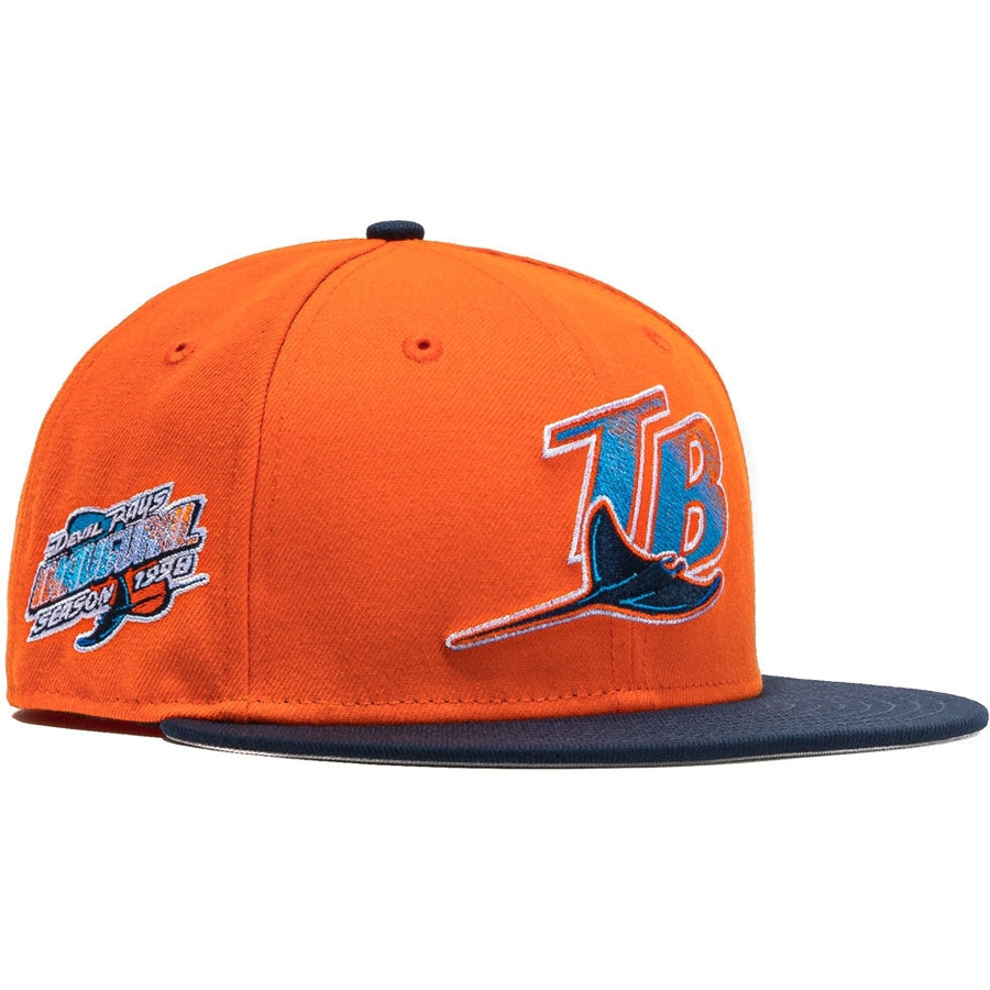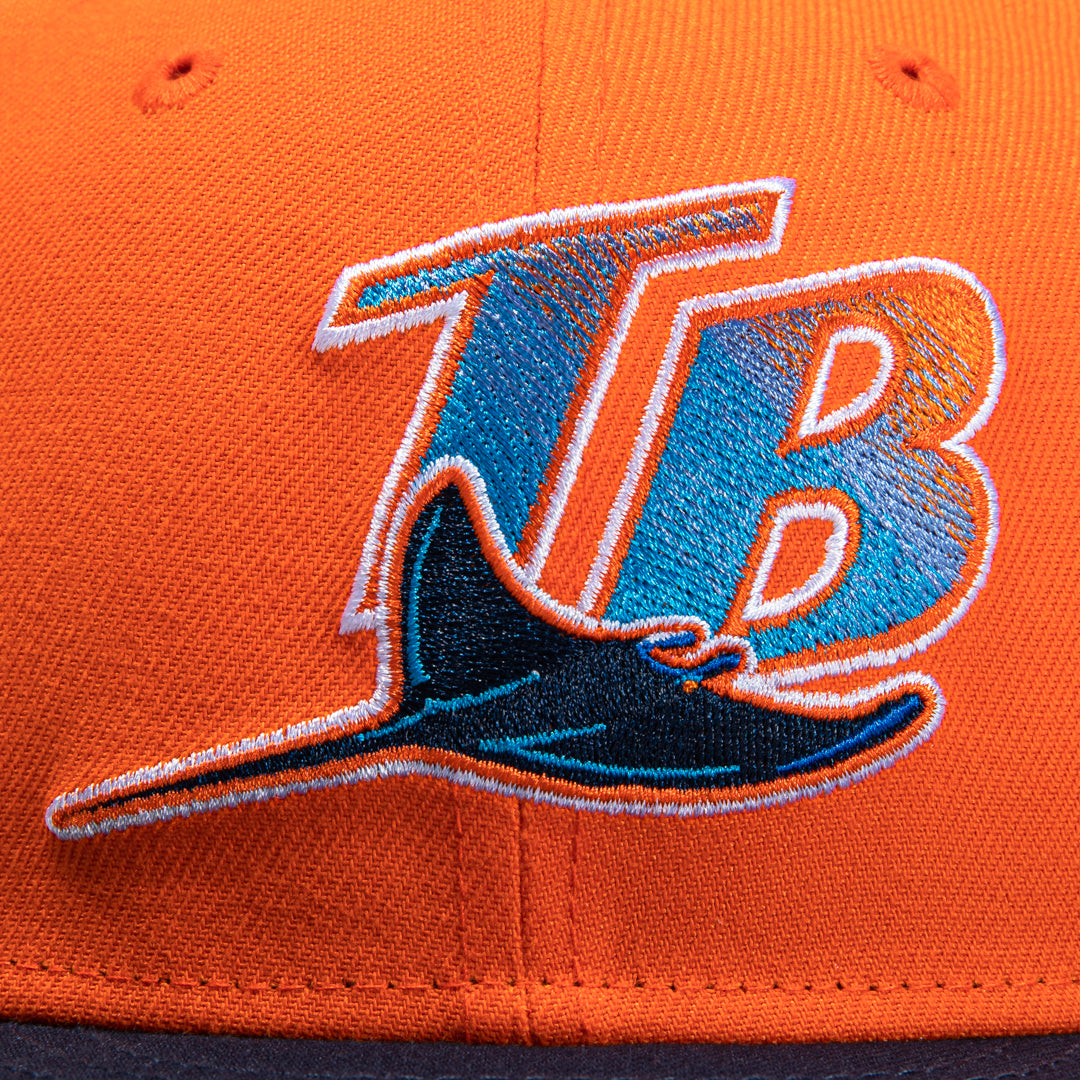 This New Era Tampa Bay Rays Orange Crush 59FIFTY fitted hat has an orange six panel structured high crown and embroidered eyelets with a navy blue fabric squatchee button. The fitted cap also has a navy blue flat bill with a grey undervisor and black sweatband. The front panel features the Tampa Bay Rays logo embroidery, with a side patch embroidery on the right panel. The left panel of the fitted displays the New Era logo with the official MLB logo embroidery on the rear crown.