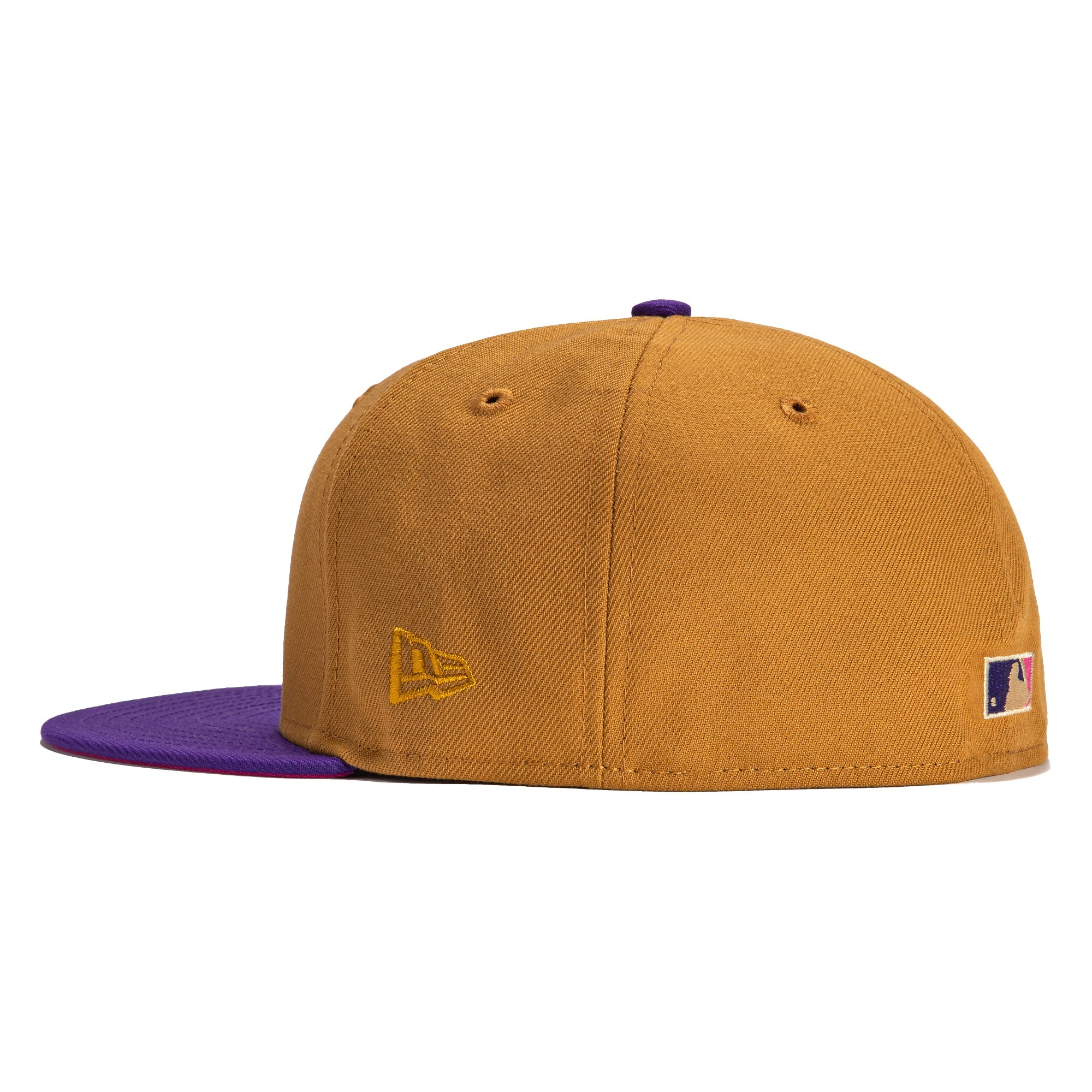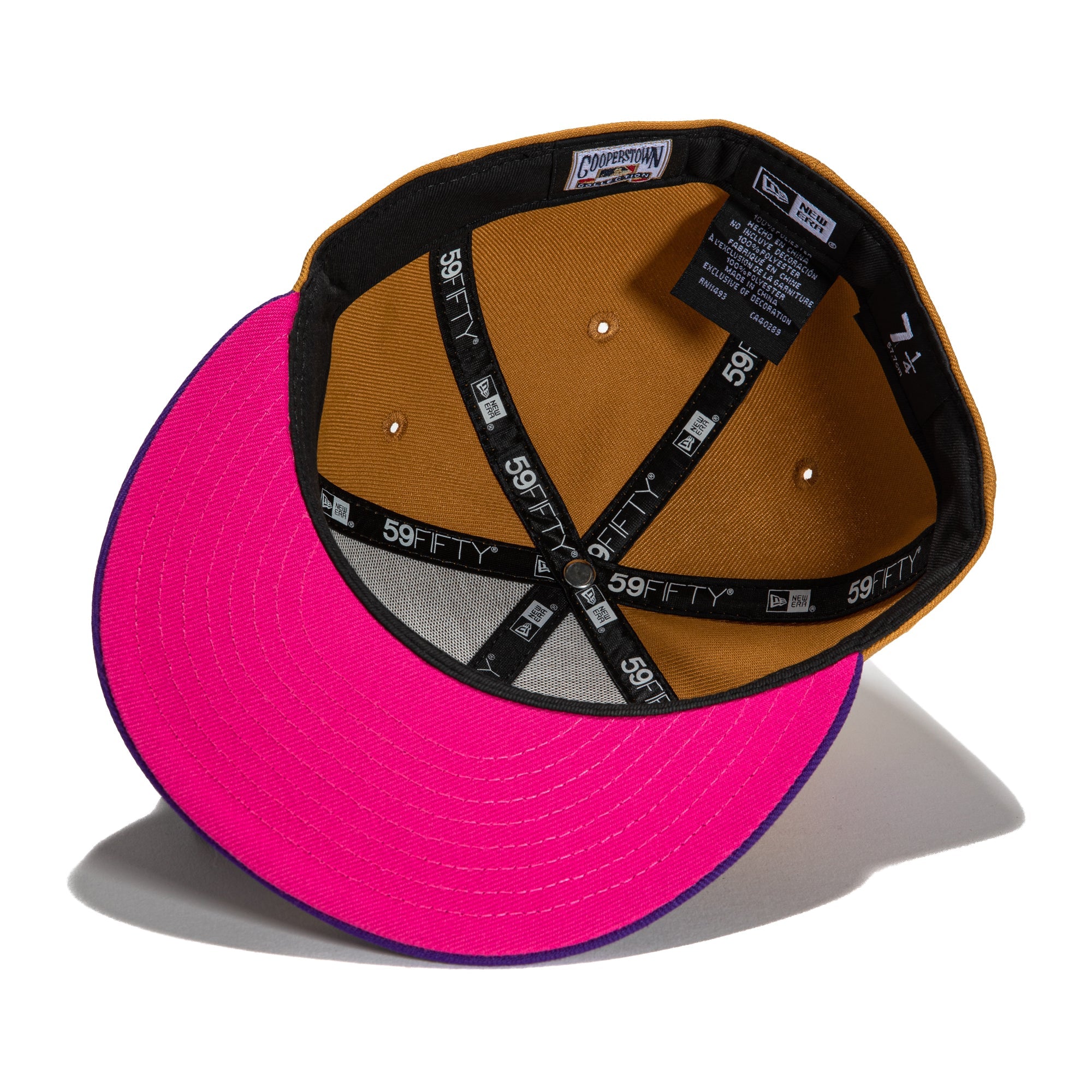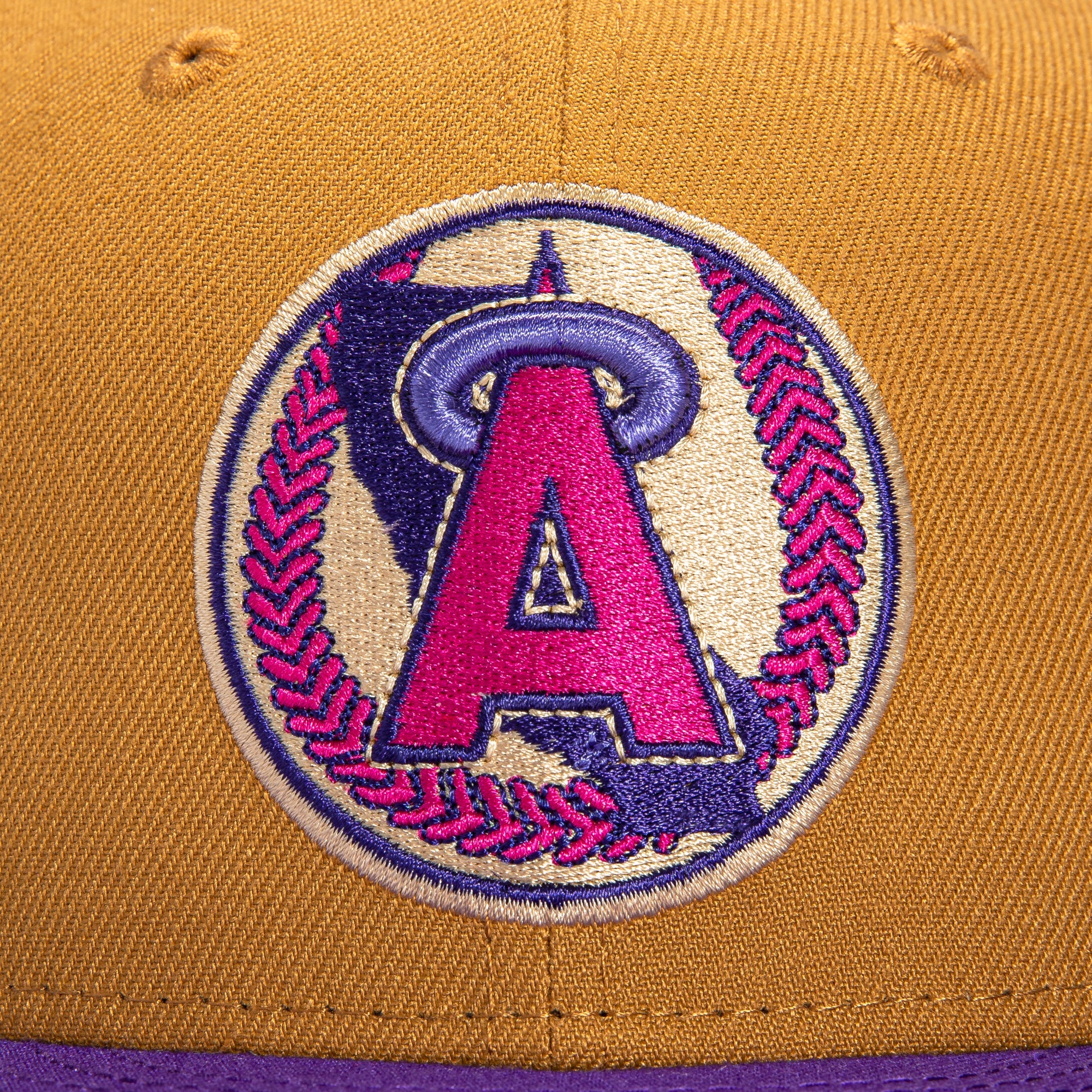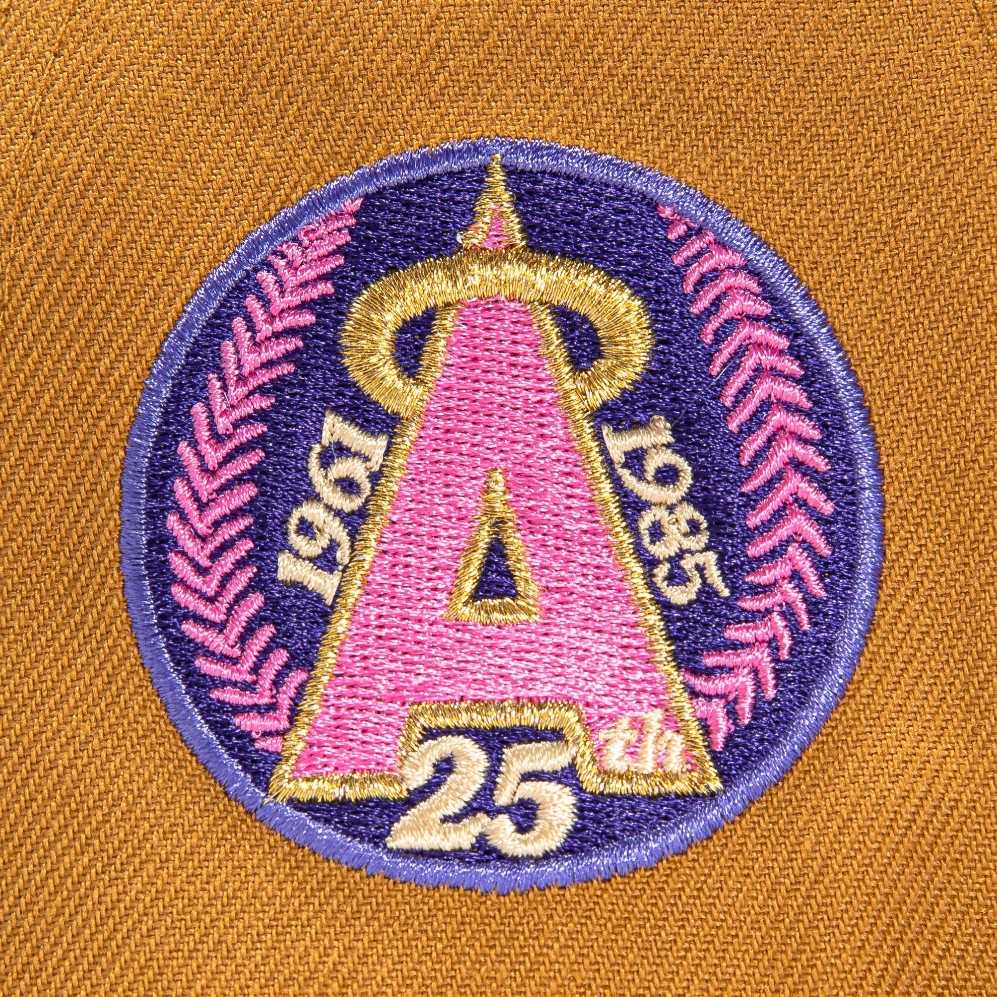 This New Era Parks HOT Valley Los Angeles Angels 25th Anniversary 2022 59FIFTY Fitted Hat is a Hat Club exclusive. The fitted has a panama tan six panel structured high crown and embroidered eyelets with a purple fabric squatchee button. The fitted cap has a purple flat bill with a mgenta undervisor and black sweatband. The front panel features the Los Angeles Angels logo embroidery and a 25th Anniversary side patch embroidery on the right panel. The left panel of the fitted displays the New Era logo and the official MLB logo embroidery on the rear crown.