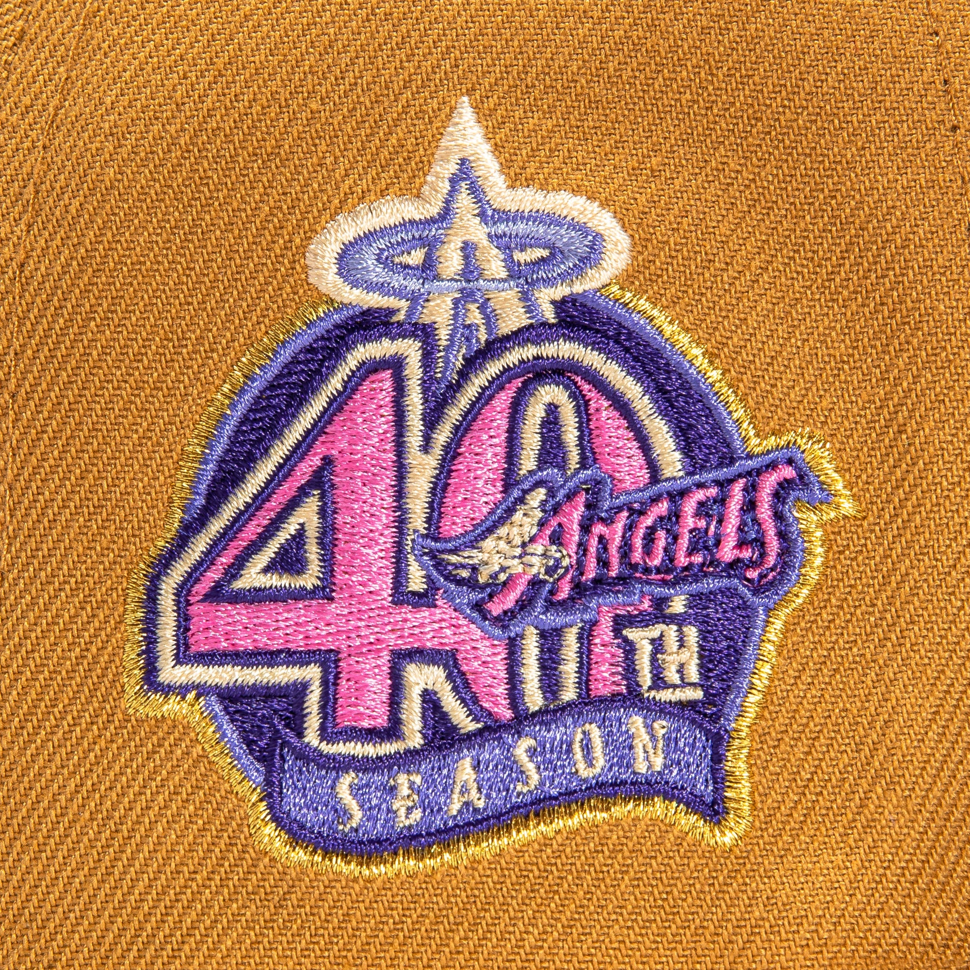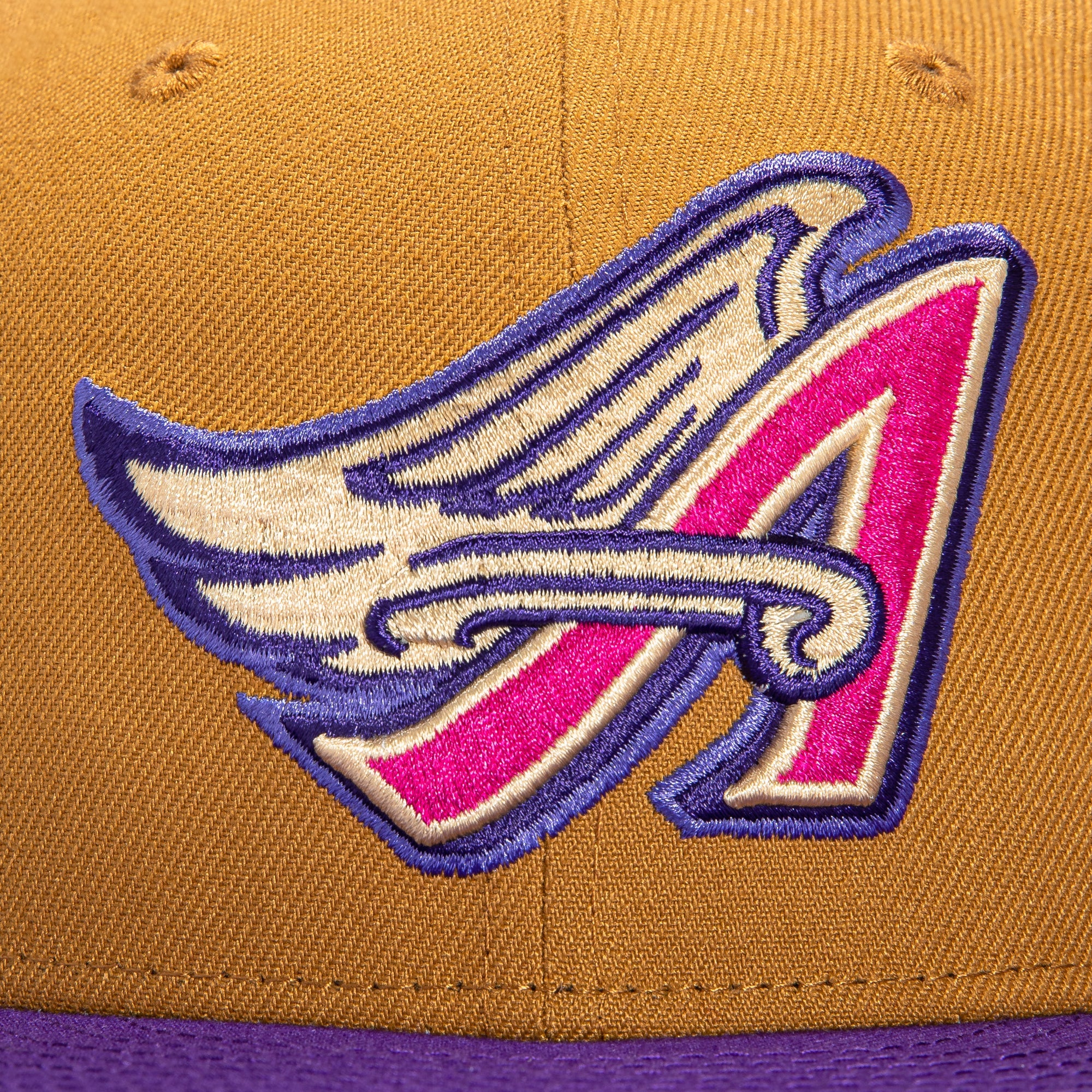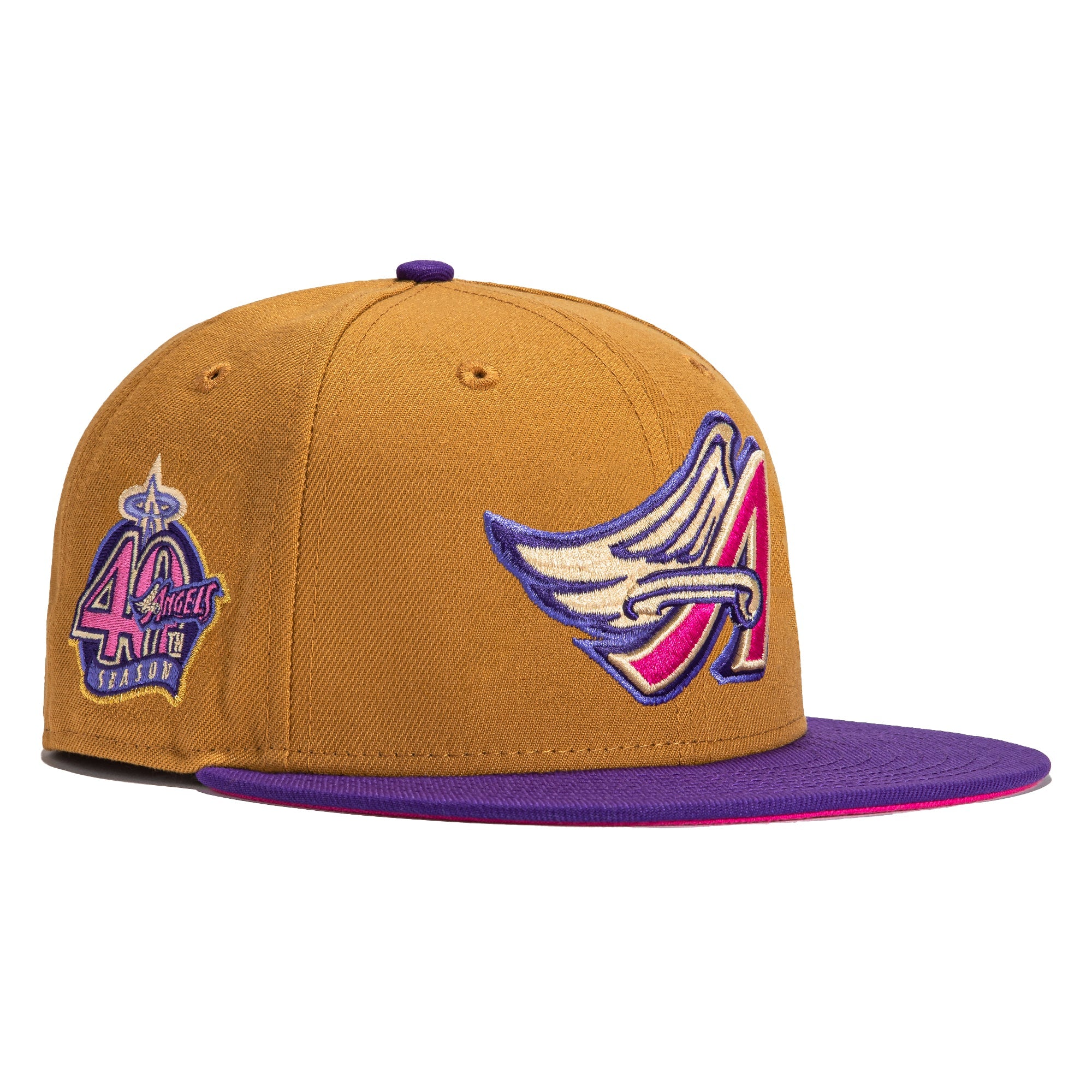 This New Era Parks HOT Valley Los Angeles Angels 40th Anniversary 2022 59FIFTY Fitted Hat is a Hat Club exclusive. The fitted has a panama tan six panel structured high crown and embroidered eyelets with a purple fabric squatchee button. The fitted cap has a purple flat bill with a magenta undervisor and black sweatband. The front panel features the Los Angeles Angels logo embroidery and a 40th Anniversary side patch embroidery on the right panel. The left panel of the fitted displays the New Era logo and the official MLB logo embroidery on the rear crown.