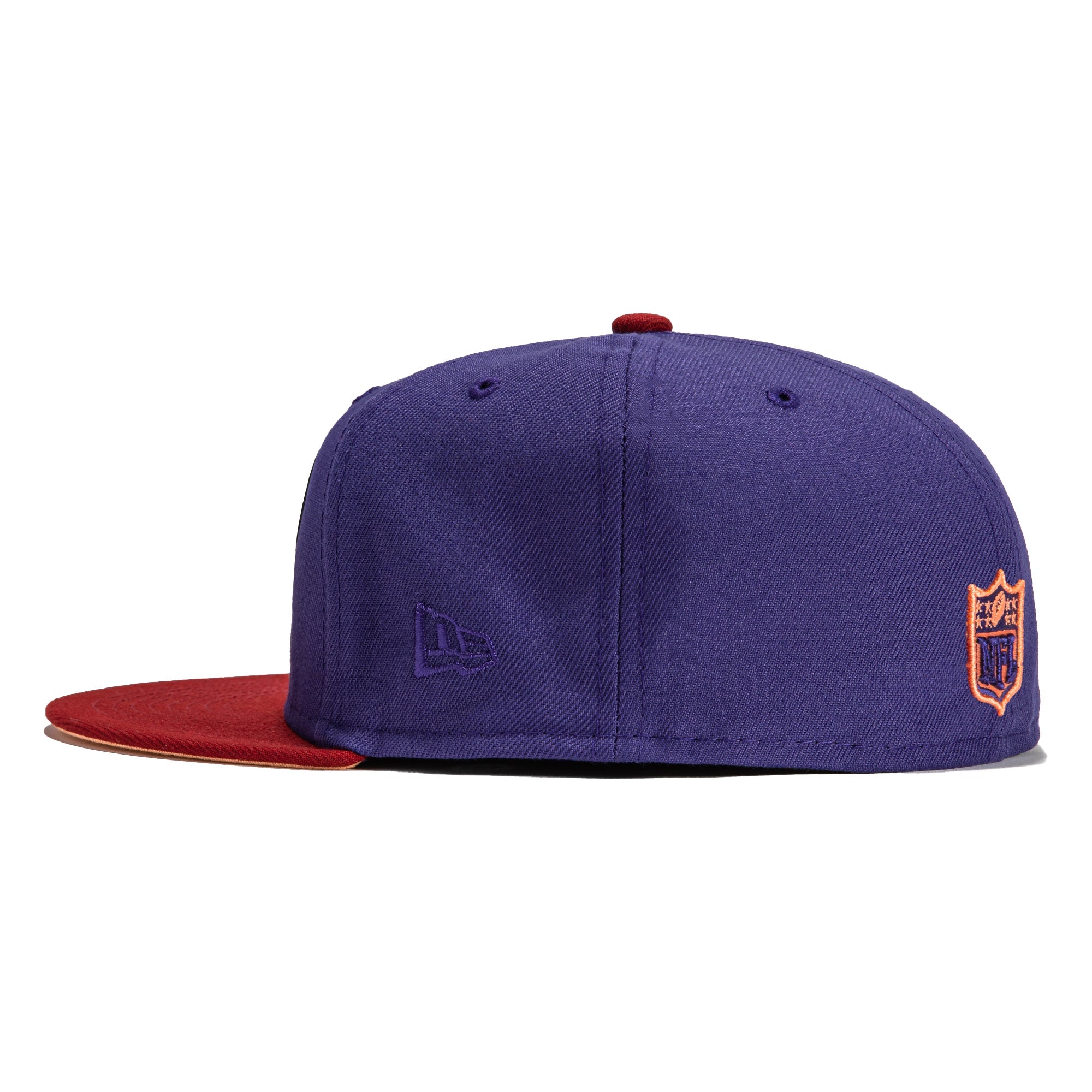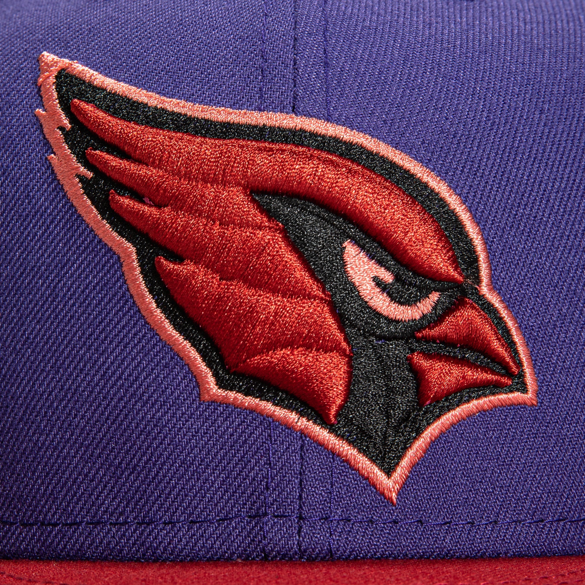This New Era Parks The Arizona Icon Arizona Cardinals 1996 Pro Bowl 2022 59FIFTY Fitted Hat is a Hat Club exclusive. The fitted has a purple six panel structured high crown and embroidered eyelets with a sedona red fabric squatchee button. The fitted cap has a sedona red flat bill with peach undervisor and black sweatband. The front panel features the Arizona Cardinals logo embroidery and a 1996 Pro Bowl side patch embroidery on the right panel. The left panel of the fitted displays the New Era logo and the official NFL logo embroidery on the rear crown.