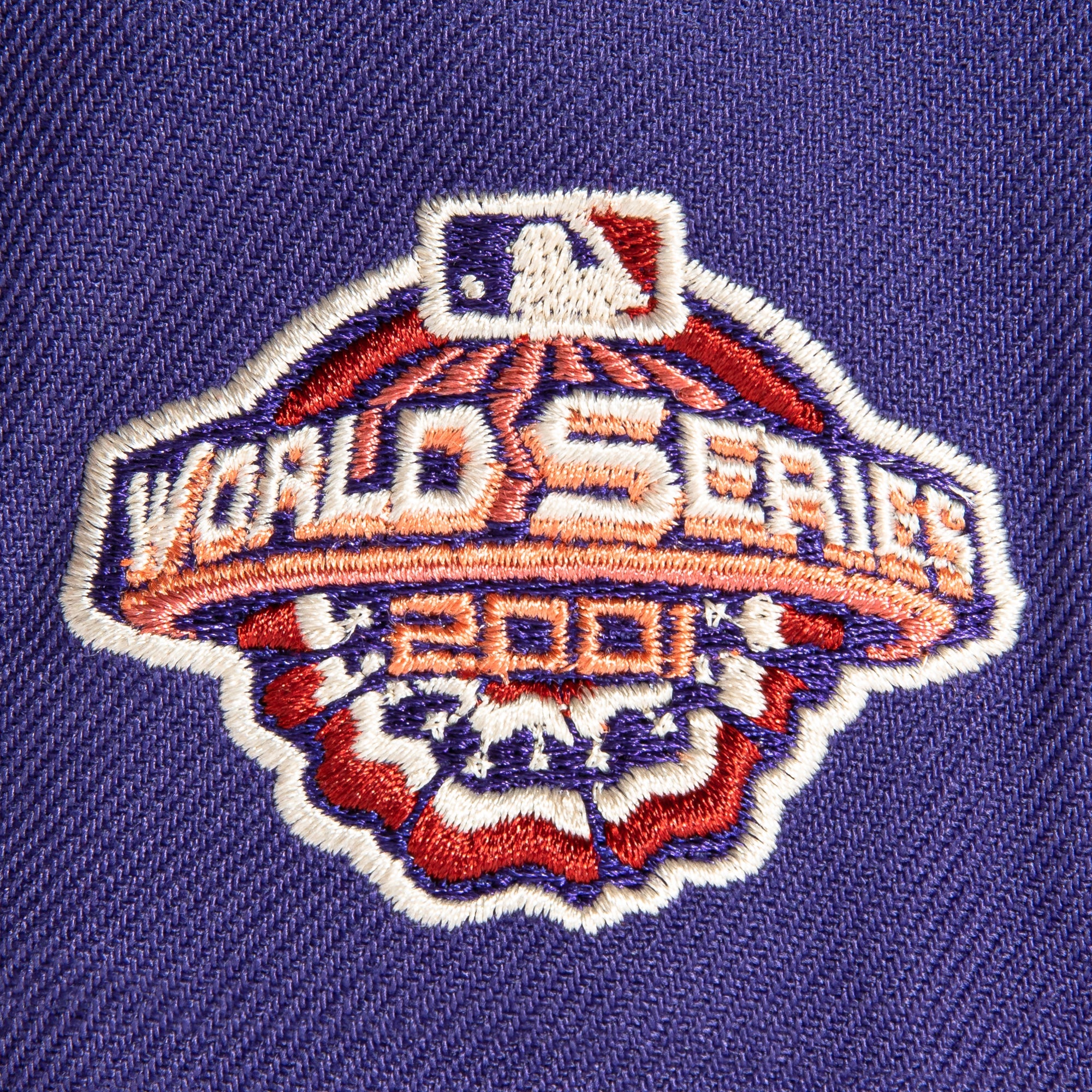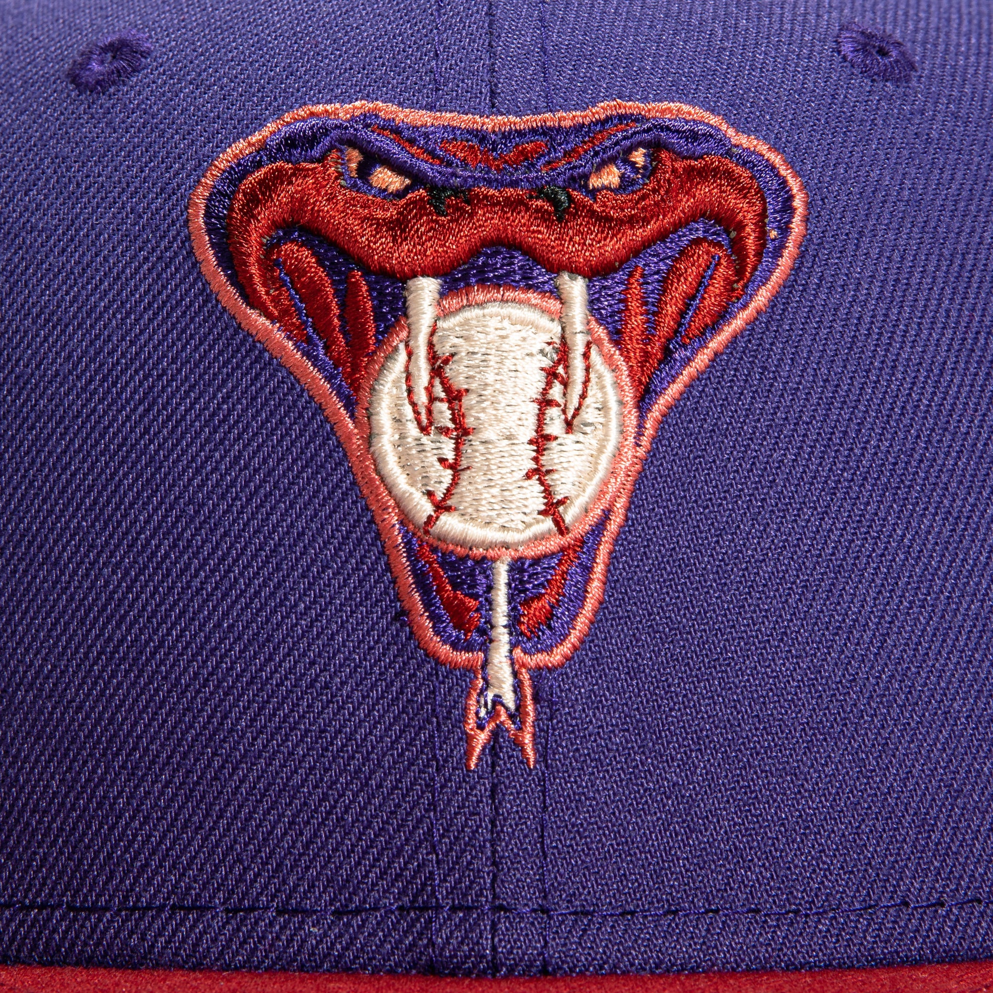 This New Era Parks The Arizona Icon Arizona Diamondbacks 2001 World Series 2022 59FIFTY Fitted Hat is a Hat Club exclusive. The fitted has a purple six panel structured high crown and embroidered eyelets with a sedona red fabric squatchee button. The fitted cap has a sedona red flat bill with a peach undervisor and black sweatband. The front panel features the Arizona Diamondbacks logo embroidery and a 2001 World Series side patch embroidery on the right panel. The left panel of the fitted displays the New Era logo and the official MLB logo embroidery on the rear crown.