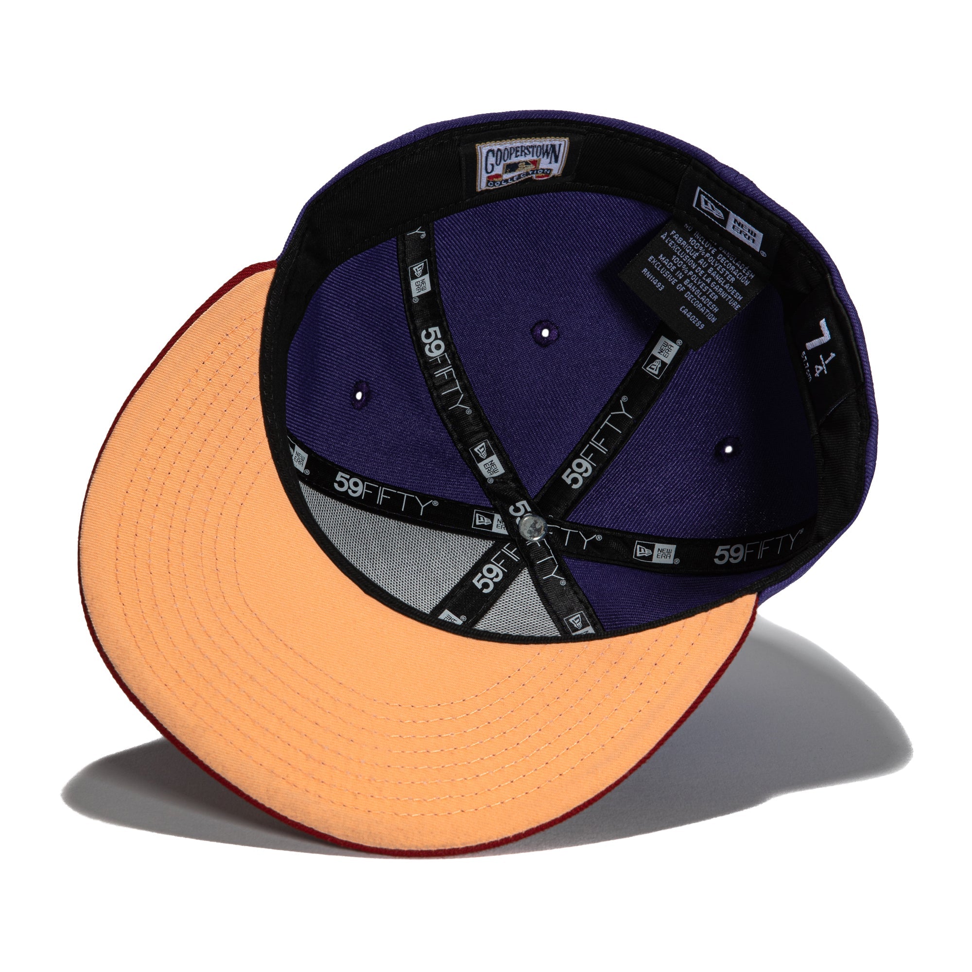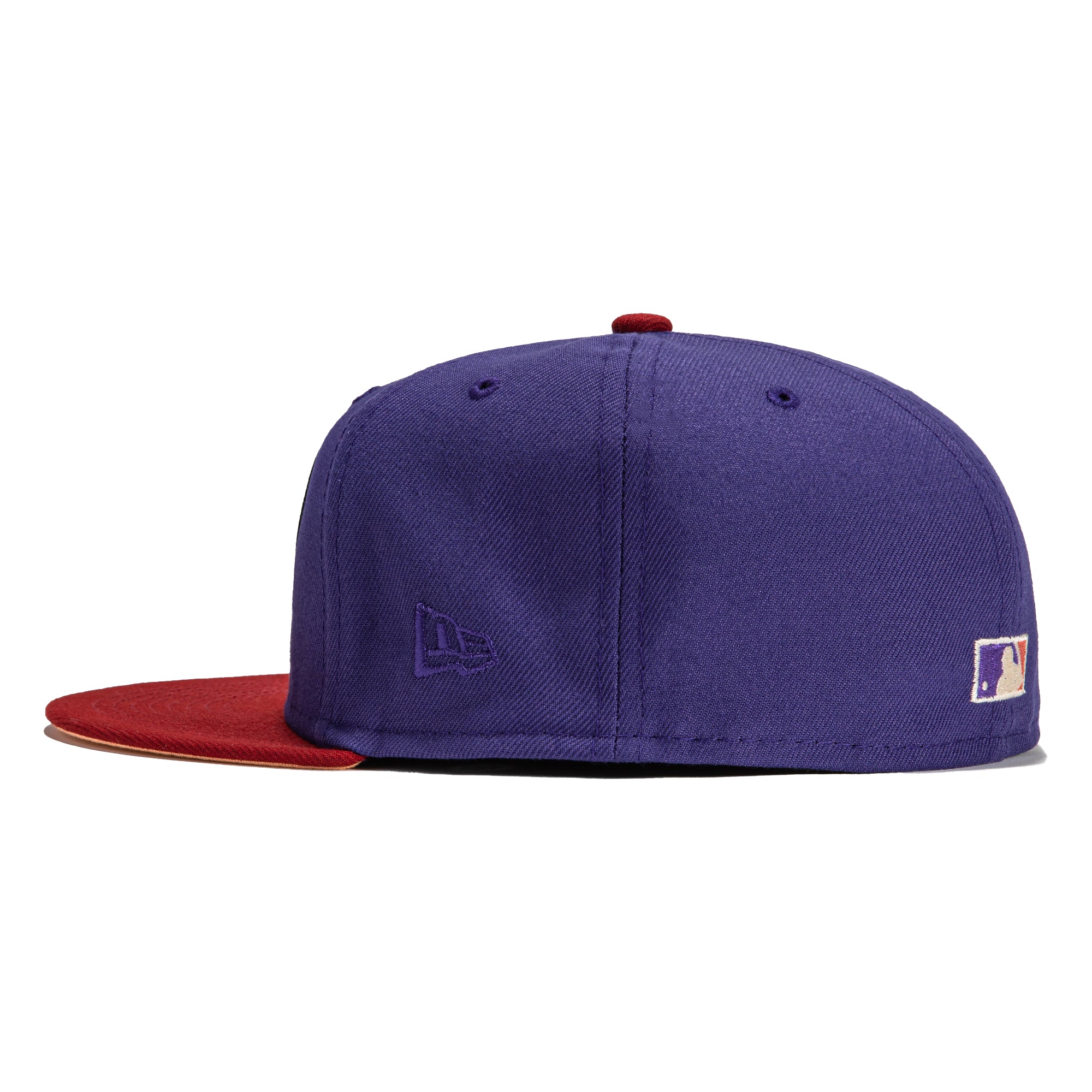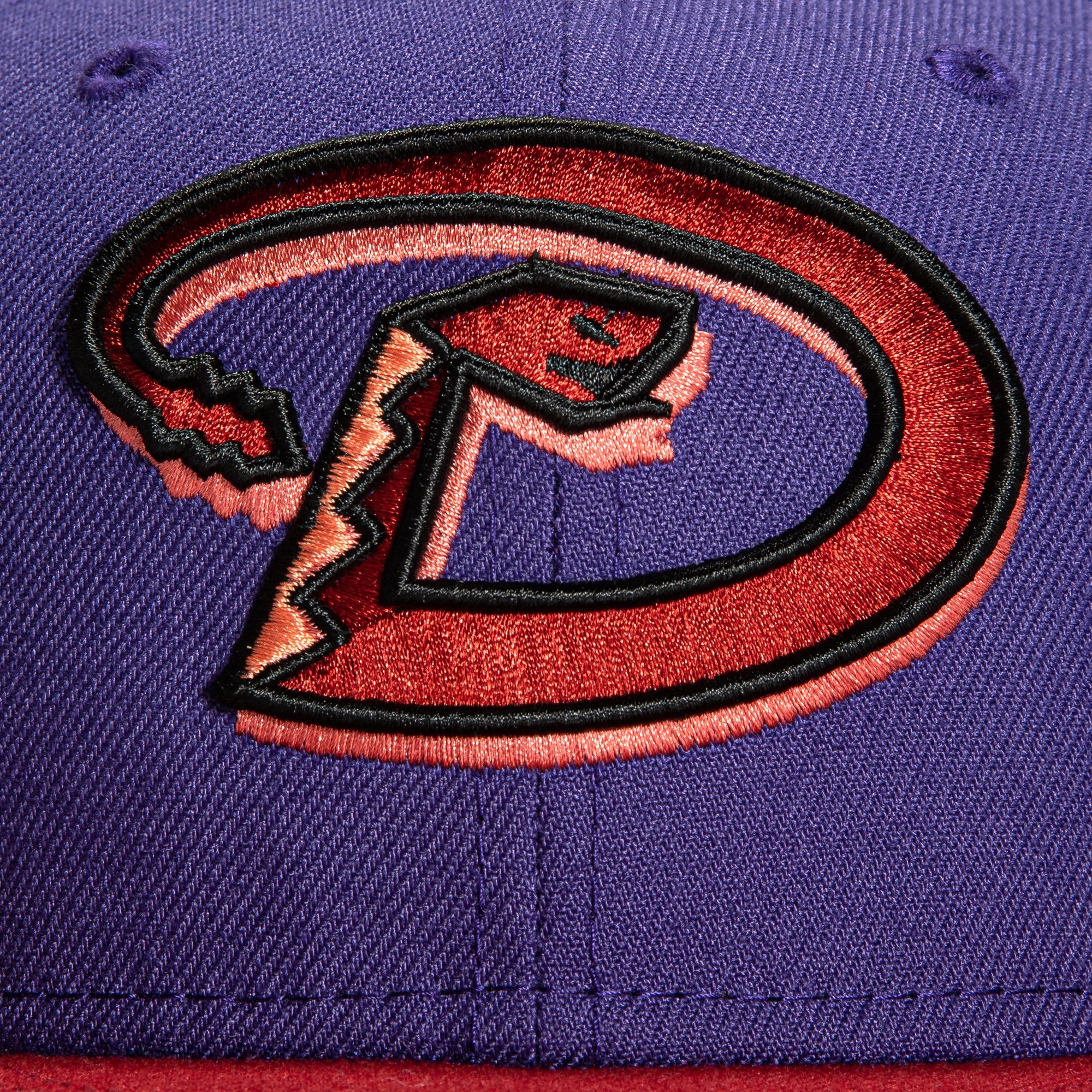This New Era Parks The Arizona Icon Arizona Diamondbacks 20th Anniversary 2022 59FIFTY Fitted Hat is a Hat Club exclusive. The fitted has a purple six panel structured high crown and embroidered eyelets with a sedona red fabric squatchee button. The fitted cap has a sedona red flat bill with a peach undervisor and black sweatband. The front panel features the Arizona Diamondbacks logo embroidery and a 20th Anniversary side patch embroidery on the right panel. The left panel of the fitted displays the New Era logo and the official MLB logo embroidery on the rear crown.