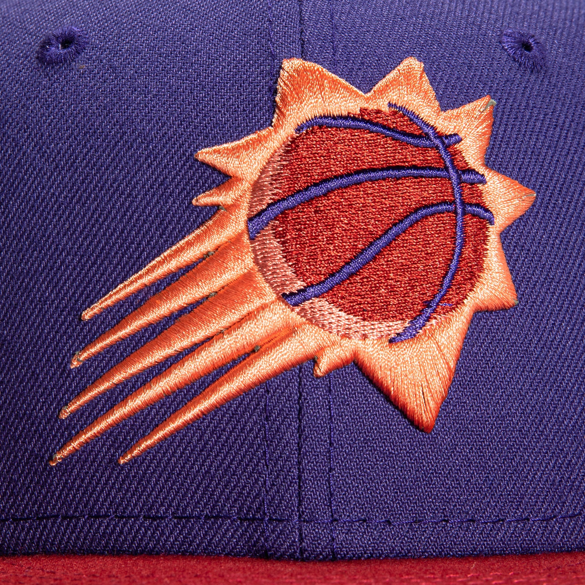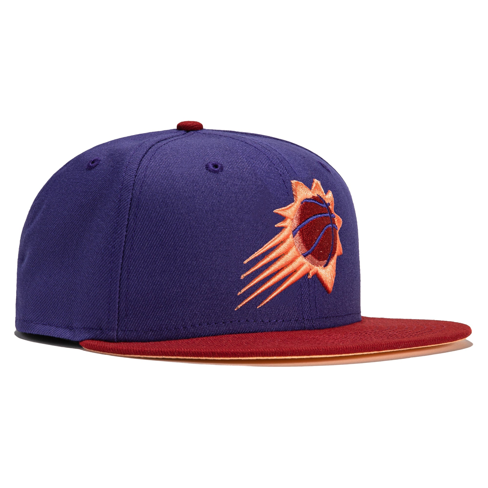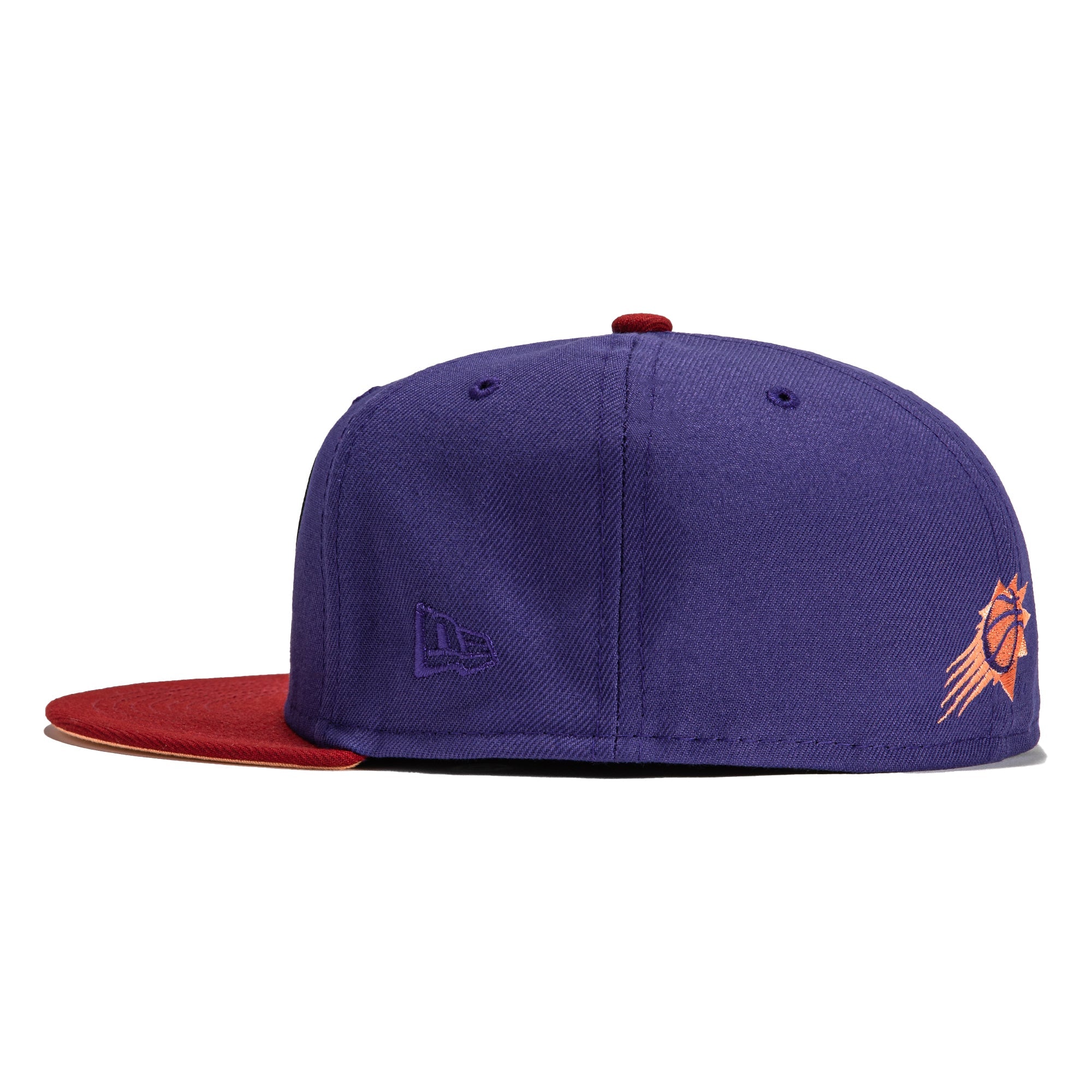 This New Era Parks The Arizona Icon Phoenix Suns 2022 59FIFTY Fitted Hat is a Hat Club exclusive. The fitted has a purple six panel structured high crown and embroidered eyelets with a sedona red fabric squatchee button. The fitted cap has a sedona red flat bill with a peach undervisor and black sweatband. The front panel features the Phoenix Suns logo embroidery. The left panel of the fitted displays the New Era logo and the official NBA logo embroidery on the rear crown.