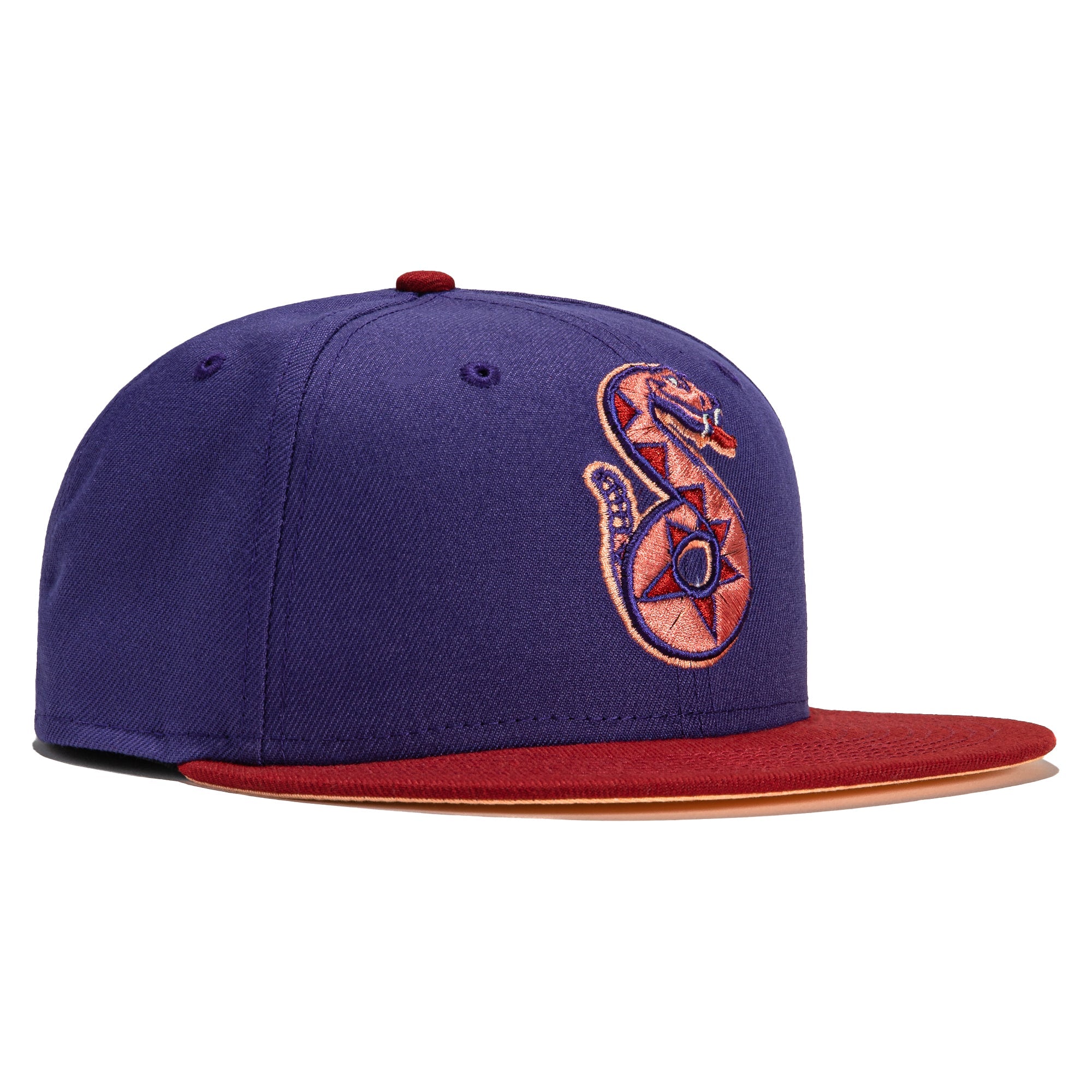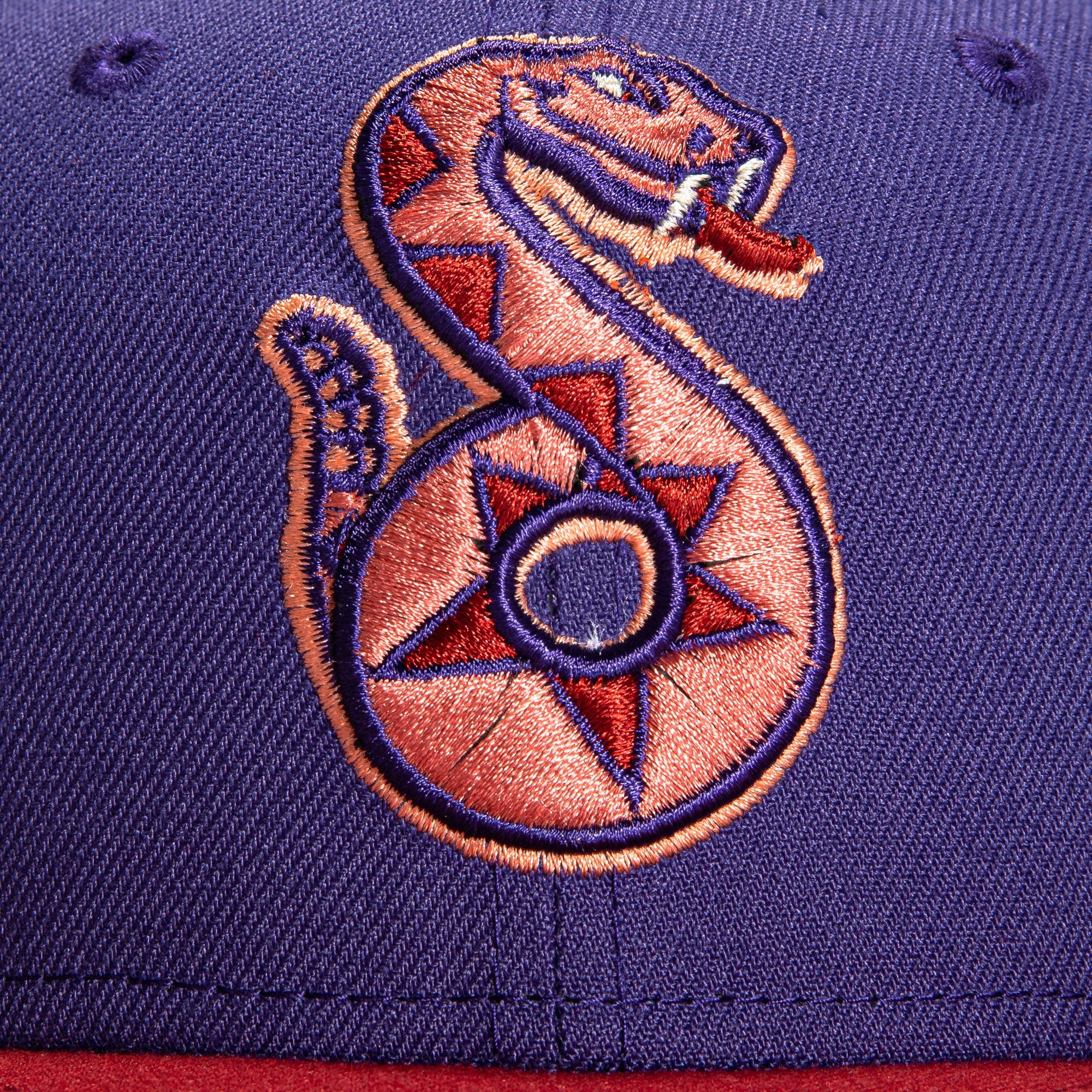 This New Era Parks The Arizona Icon Tucson Sidewinders 2022 59FIFTY Fitted Hat is a Hat Club exclusive. The fitted has a purple six panel structured high crown and embroidered eyelets with a sedona red fabric squatchee button. The fitted cap has a sedona red flat bill with a peach undervisor and black sweatband. The front panel features the Tucson Sidewinders logo embroidery. The left panel of the fitted displays the New Era logo and the official MILB logo embroidery on the rear crown.