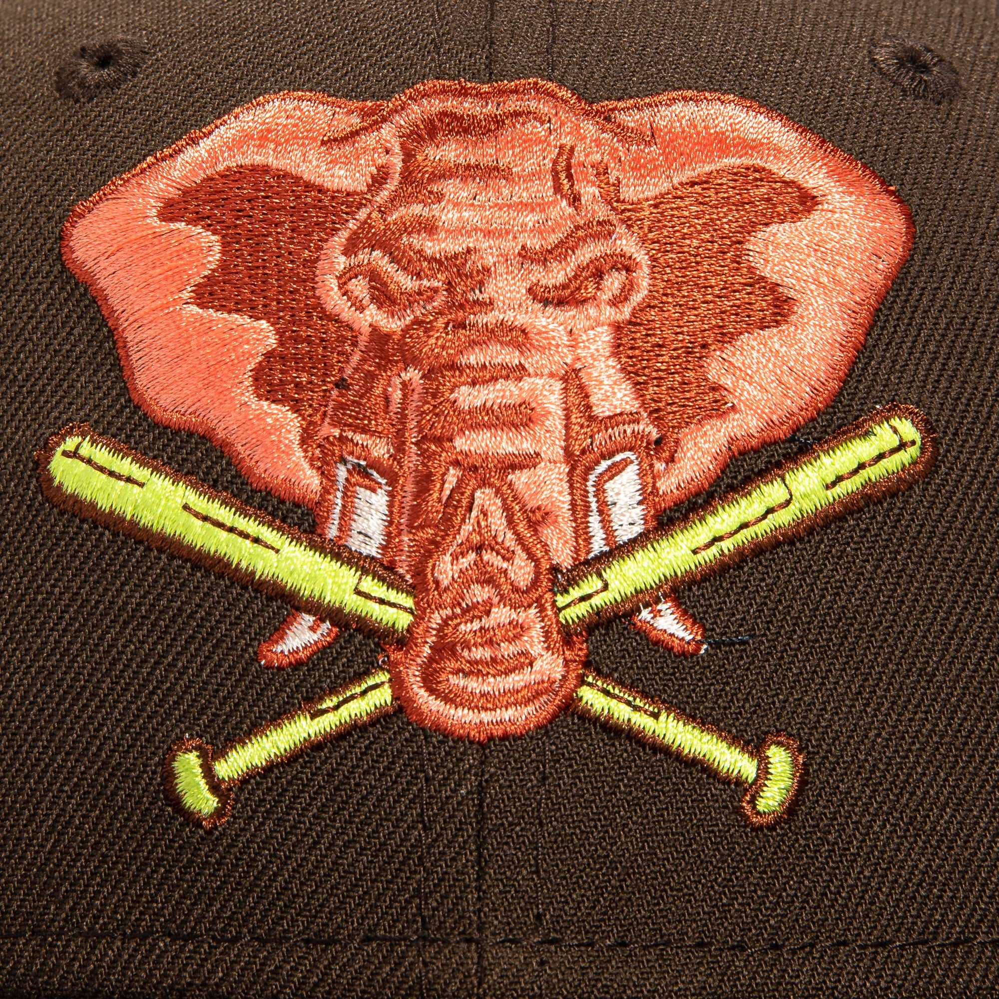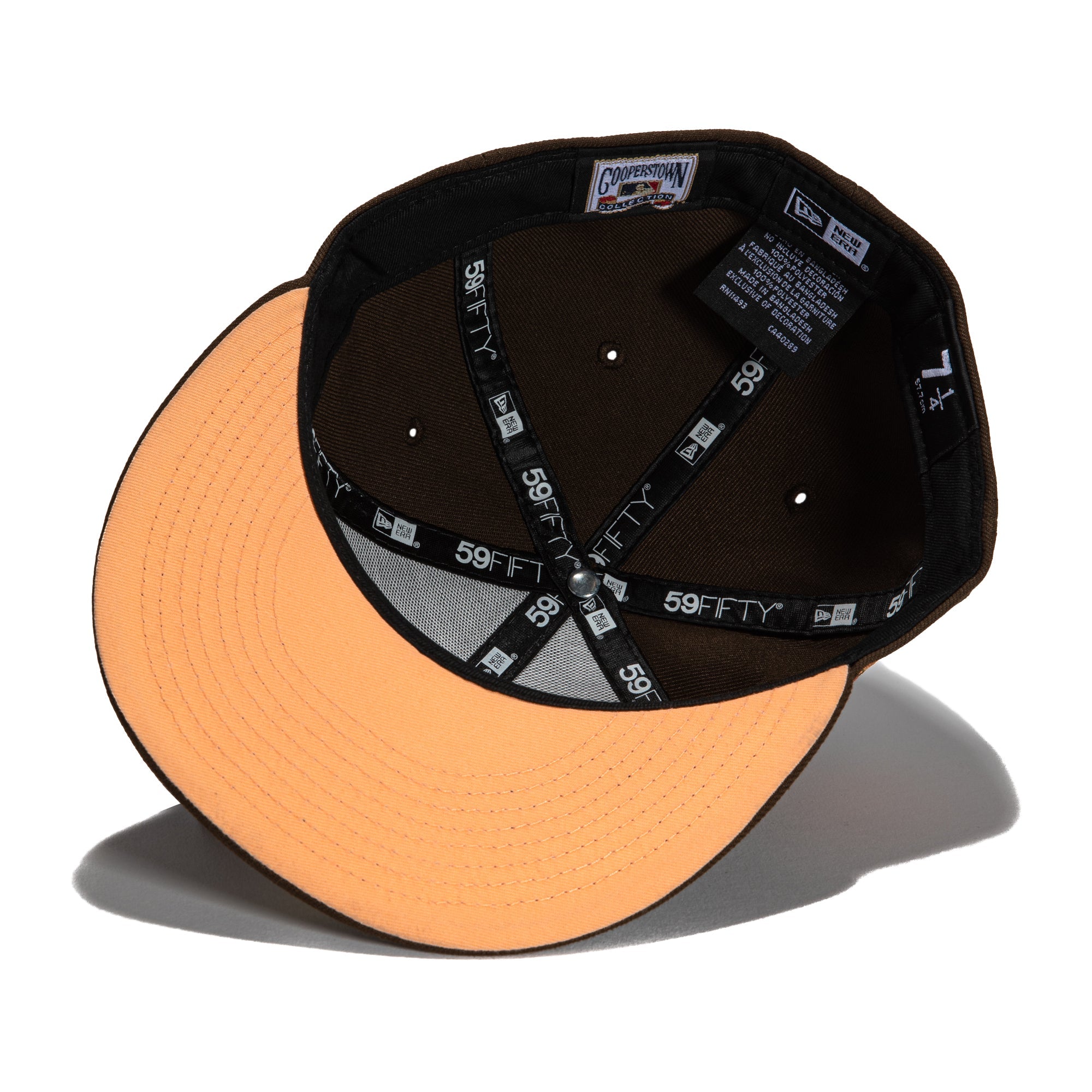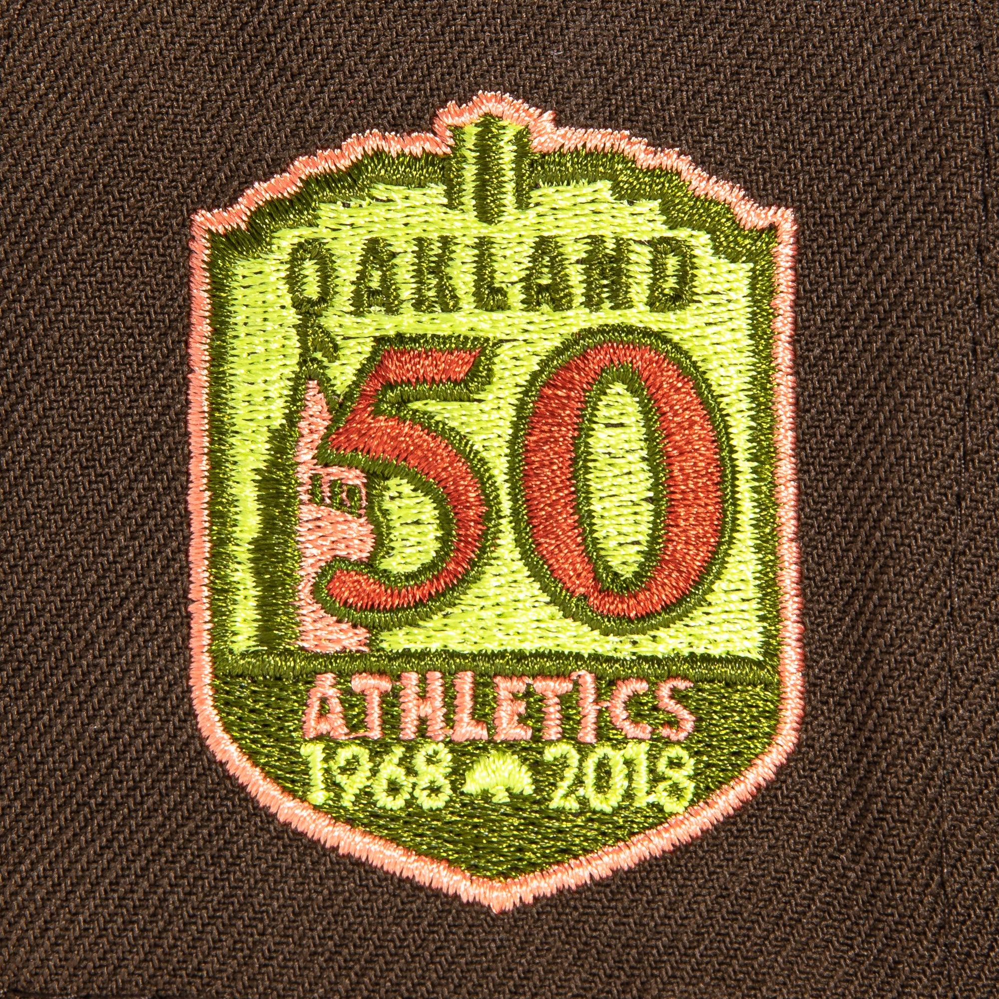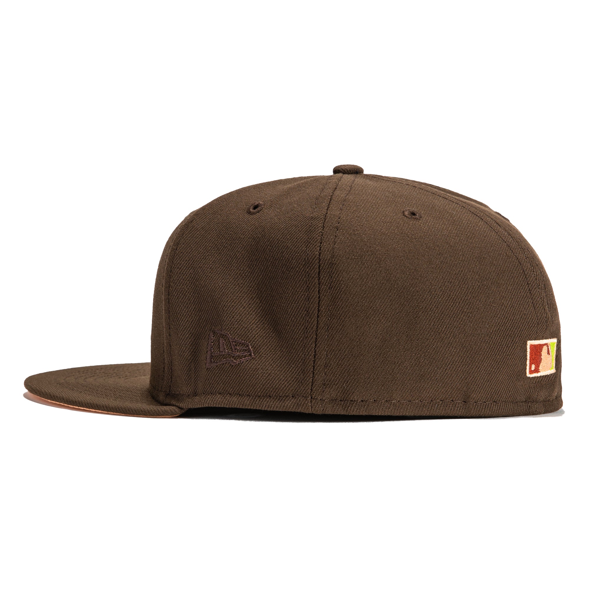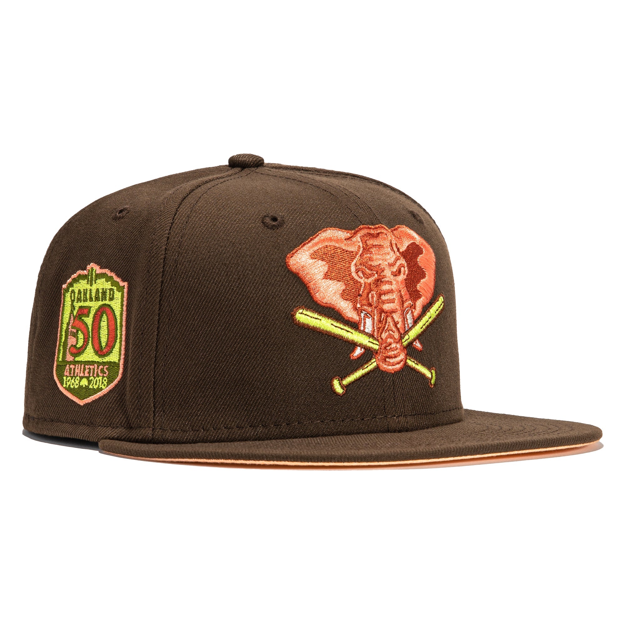 This New Era Parks The Woods Oakland Athletics 50th Anniversary 2022 59FIFTY Fitted Hat is a Hat Club exclusive. The fitted has a dark brown six panel structured high crown and embroidered eyelets with a dark brown fabric squatchee button. The fitted cap has a dark brown flat bill with a peach undervisor and black sweatband. The front panel features the Oakland Athletics logo embroidery and a 50th Anniversary side patch embroidery on the right panel. The left panel of the fitted displays the New Era logo and the official MLB logo embroidery on the rear crown.