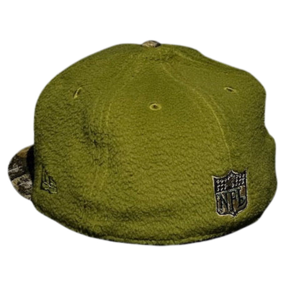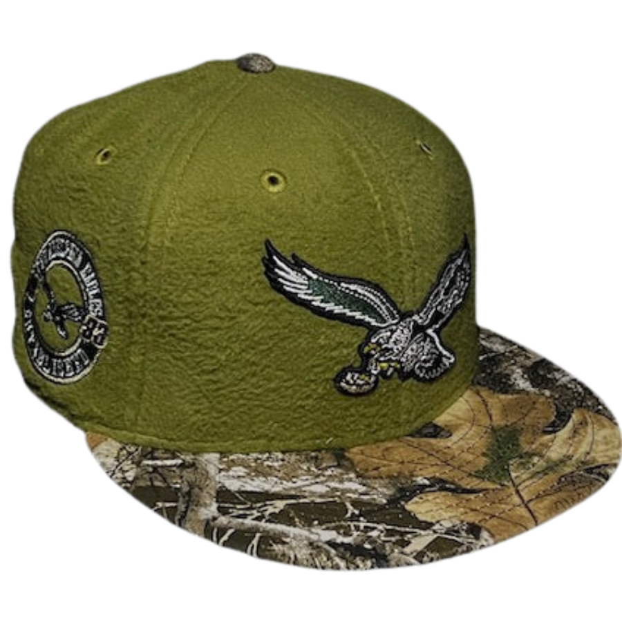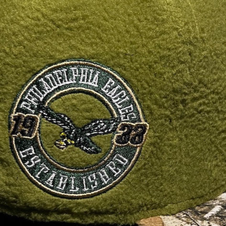 This Philadelphia Eagles fitted hat was released by USA Cap king. The fitted has a green fleece six panel structured high crown and embroidered eylets with a realtree fabric squatchee button. The fitted cap also has a realtree flat bill with a grey undervisor. The front panel features the Philadelphia Eagles logo embroidery, a 1938 established side patch on the right panel and the official MLB NFL shield on the rear crown.