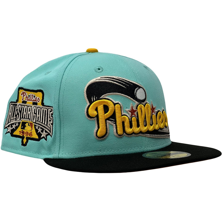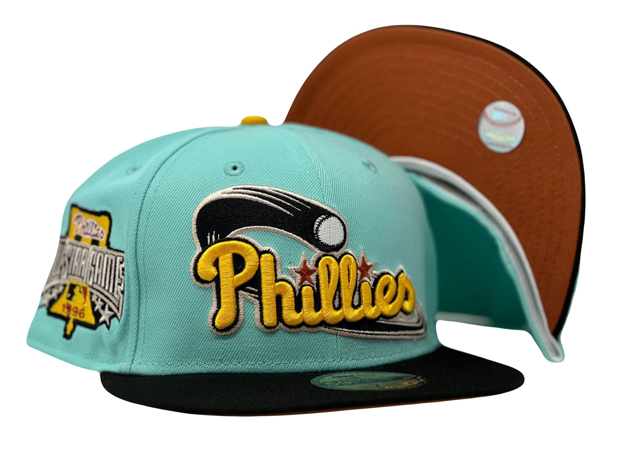 This New Era Philadelphia Phillies 1996 All-Star Game Blue Tint/Yellow/Black 59FIFTY Fitted Hat has a blue tint six panel structured high crown and embroidered eyelets with a yellow fabric squatchee button. The fitted cap also has a black flat bill with a rust orange undervisor and white sweatband. The front panel features the Philadelphia Phillies logo embroidery and a 1996 ASG side patch embroidery on the right panel. The left panel of the fitted displays the New Era logo.