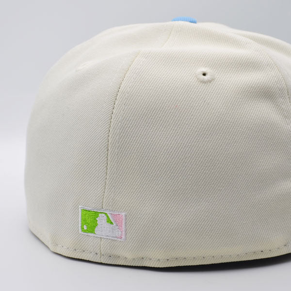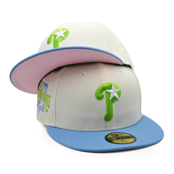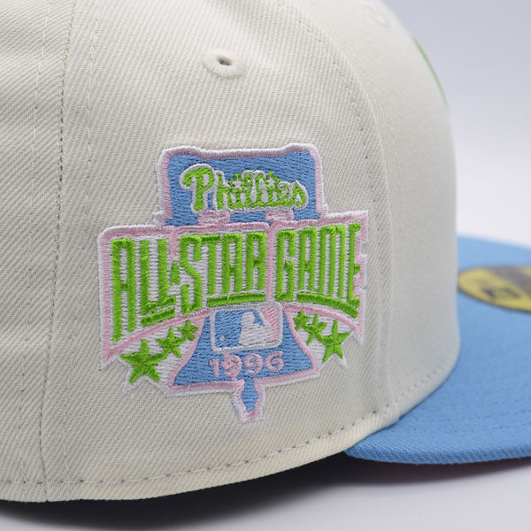 This New Era Philadelphia Phillies Chrome/Sky Blue/Lime 1998 Inaugural Season 59FIFTY Fitted Hat was released by Hat Dreams. The fitted cap features a _ colorway. The front panel includes the Philadelphia Phillies logo embroidery. The left panel of the fitted displays the New Era logo and the official MLB insignia embroidered on the rear crown and a side patch on the right-wear side.