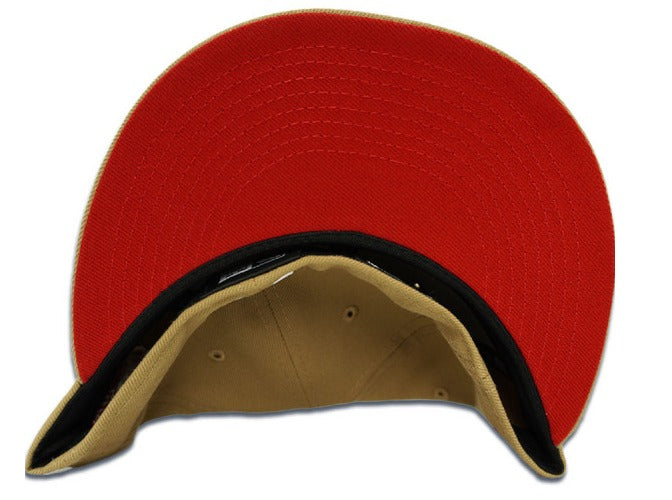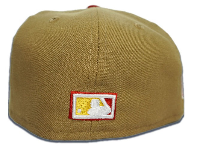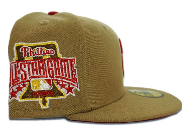 This New Era Philadelphia Phillies 'Coffee Pack' fitted hat has a tan six panel structured high crown and embroidered eyelets with a red fabric squatchee button. The flat bill of the fitted is also tan with a red undervisor and black sweatband. The front panel features the Philadelphia Phillies logo embroidered in red and yellow threads outlined in white thread and the right panel features a 1996 All-Star Game side patch in the same colorway.