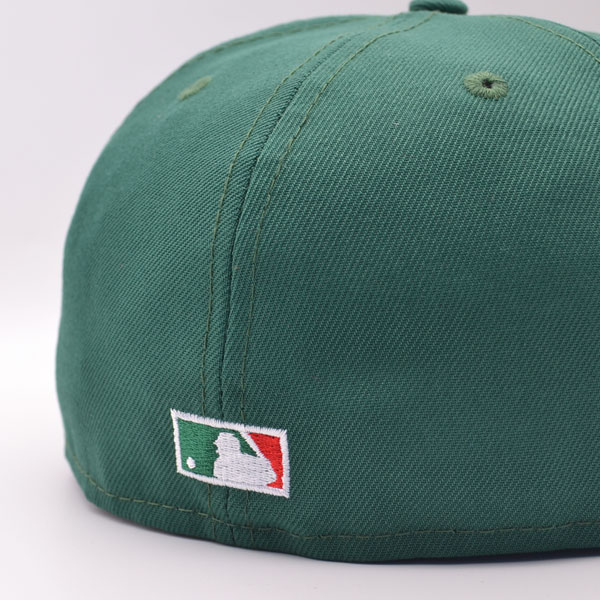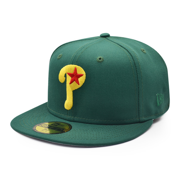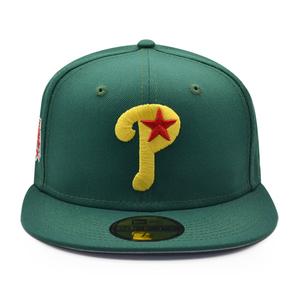This New Era Philadelphia Phillies Emeral green/Moonbeam 1996 All-Star Game 59FIFTY fitted hat has an emerald green six panel structured high crown, embroidered eyelets and fabric squatchee button located at the top of the crown. The flat brim of the fitted is emerald green with a light gray undervisor. The front panel features the Phillies logo embroidered in moonbeam and red stitching with a 1996 ASG side patch embroidery on the right-wear side in the same colorway as the primary logo.
