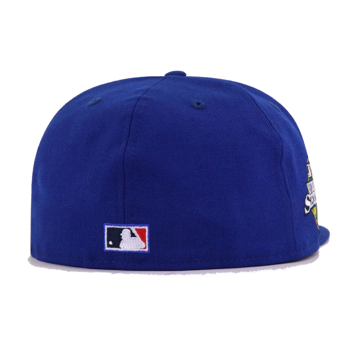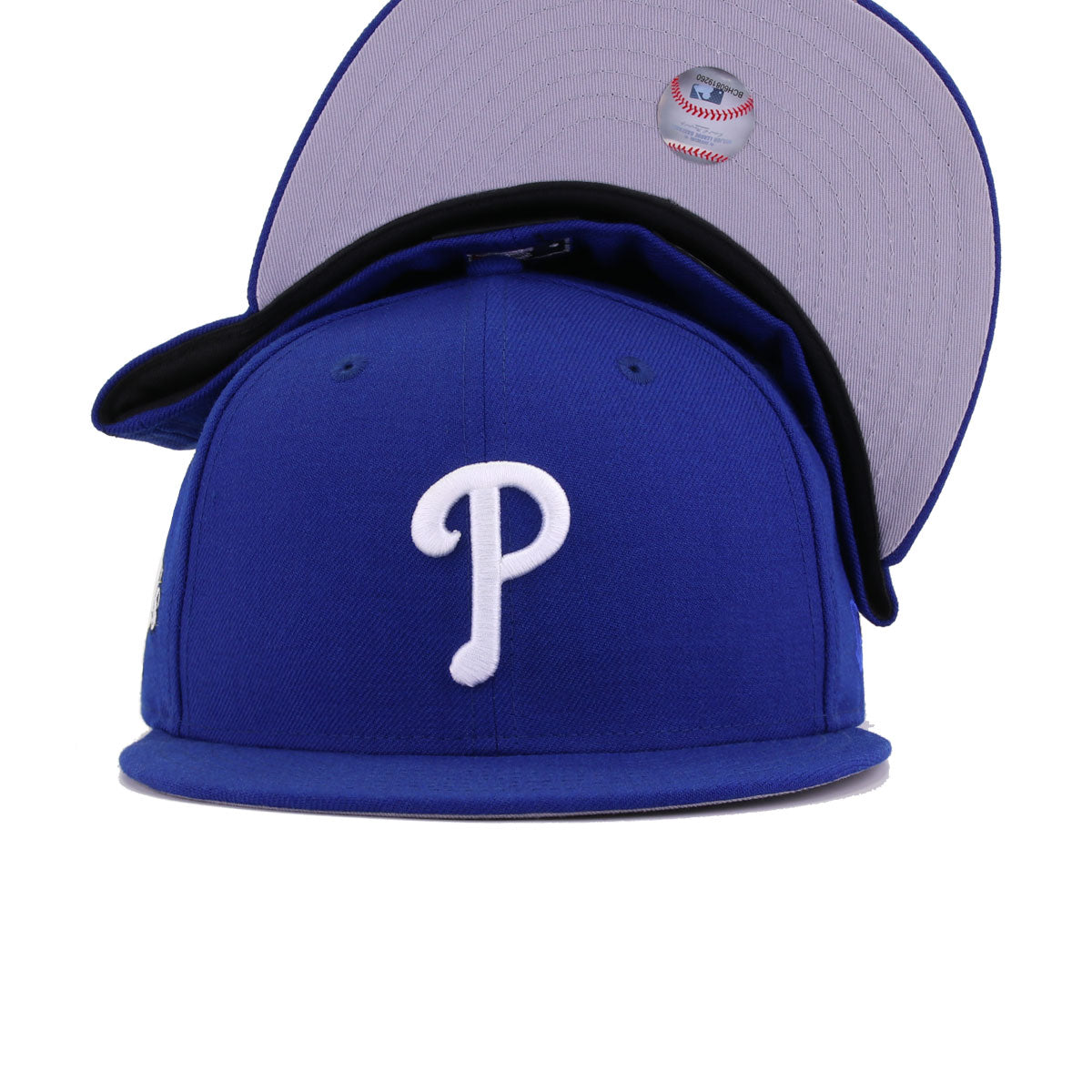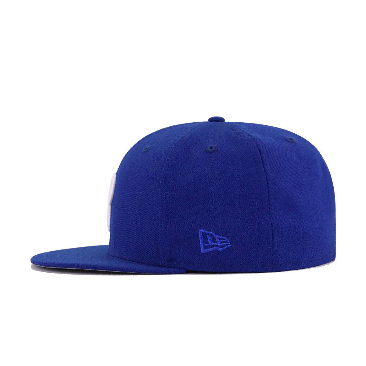 This New Era Philadelphia Phillies Light Royal Blue 2008 World Series 59FIFTY Fitted Hat was released by Hat Heaven. The fitted has a royal blue six panel structured high crown and embroidered eyelets with a royal blue fabric squatchee button. The flat bill of the fitted cap is also royal blue with a grey undervisor and black sweatband. The front panel features the Philadelphia Phillies logo embroidered in white stitching and the New Era "Fly Your Own Flag" logo on the left panel.