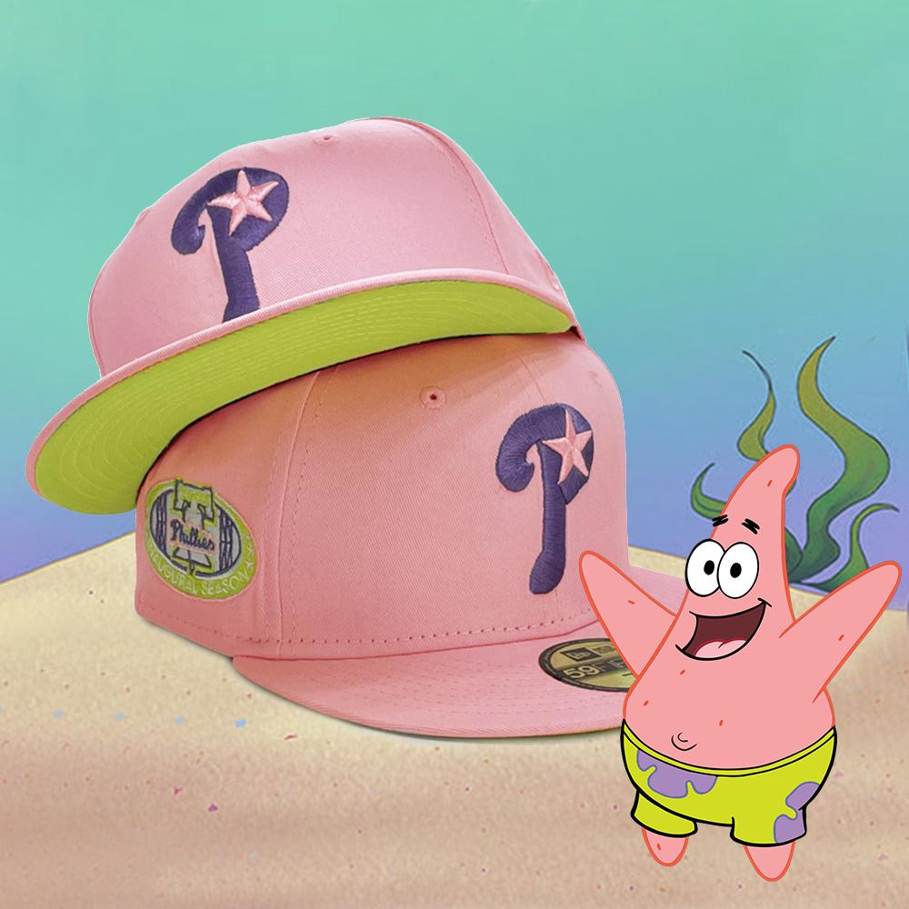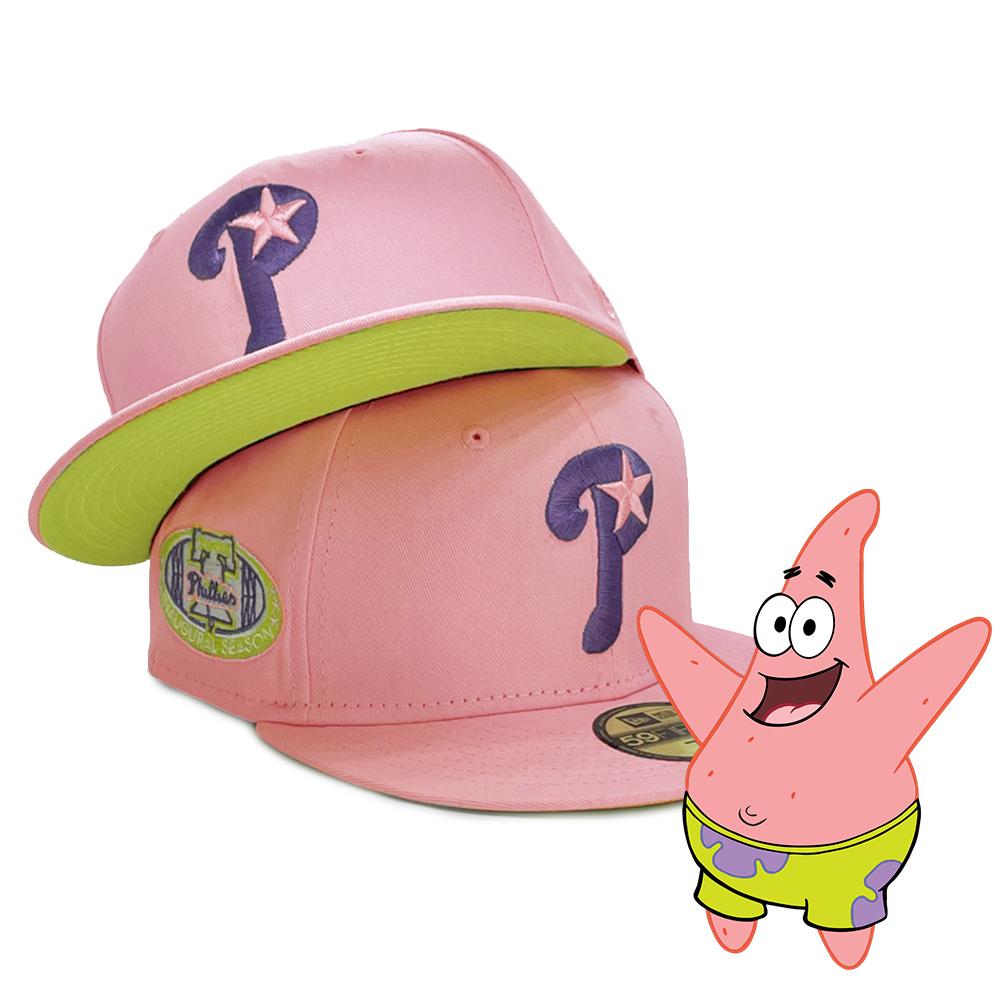 Patrick Star inspired fitted hat is a Crown Minded exclusive drop. The six panel structured high crown and flat bill of the fitted is soft pink with a soft yellow undervisor. The front panel features the Phillies logo embroidered in purple thread, with an Inaugural Season side patch embroidered on the right panel. This fitted hat colorway was inspired by the colors of Patrick Star, a character from SpongeBob Squarepants cartoon.