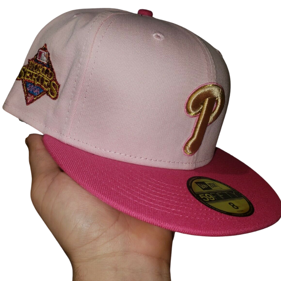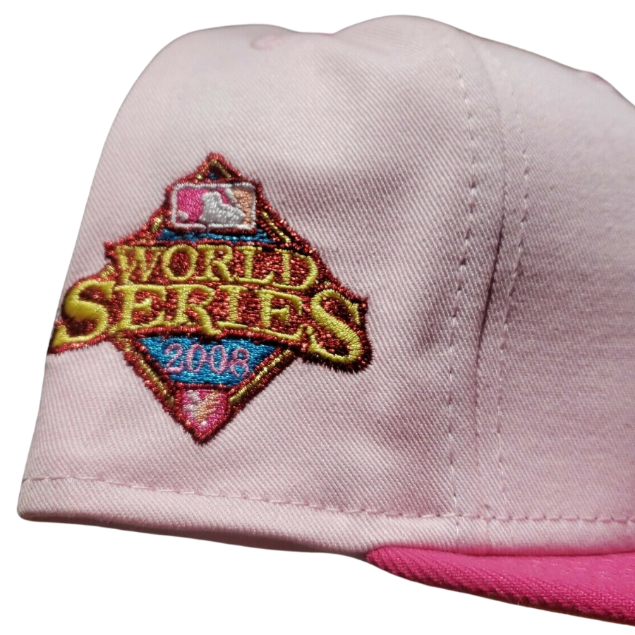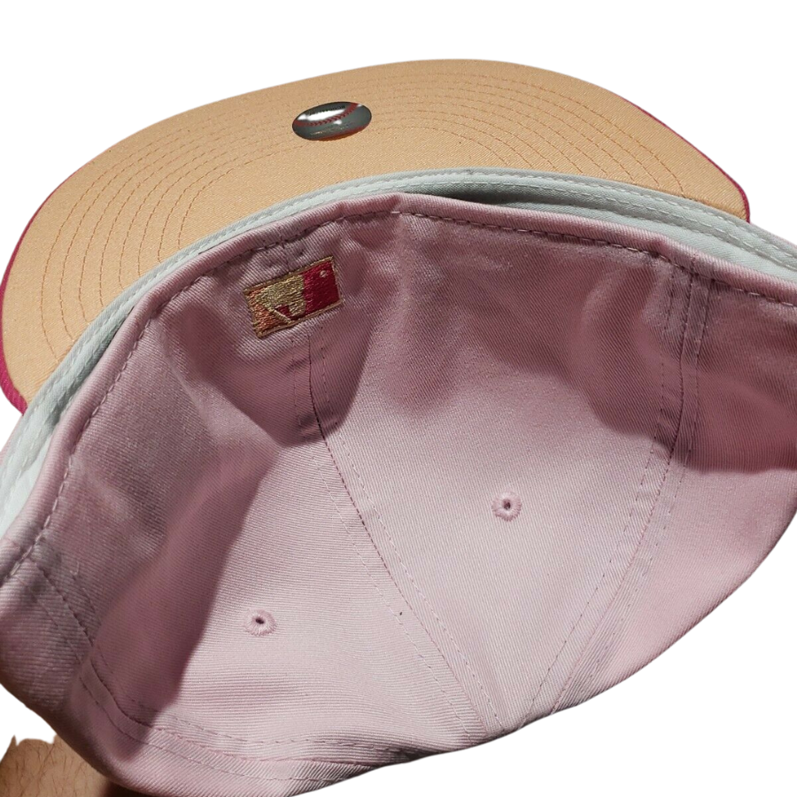Super Mario Kart Princess Peach fitted hat is a My Fitteds exclusive drop. The 59FIFTY fitted cap features a soft pink six panel structured high crown and embroidered eyelets. The fabric squatchee button and flat bill of the fitted is dark pink with a peach undervisor and white sweatband. The front panel features the Philadelphia Phillies "P" logo (also "P" for Princess Peach) embroidery with a 2008 World Series side patch embroidered on the right panel. This fitted cap colorway was inspired by Princess Peach from the Super Mario Kart video game by