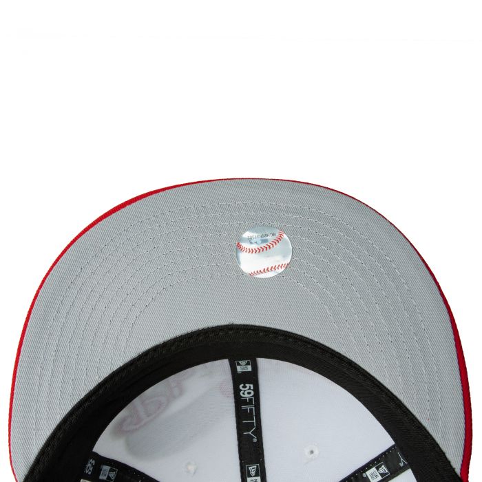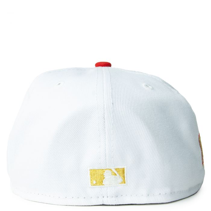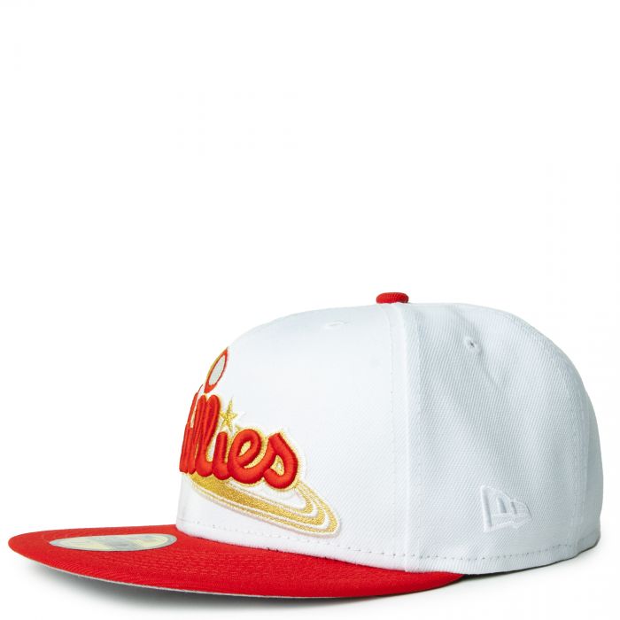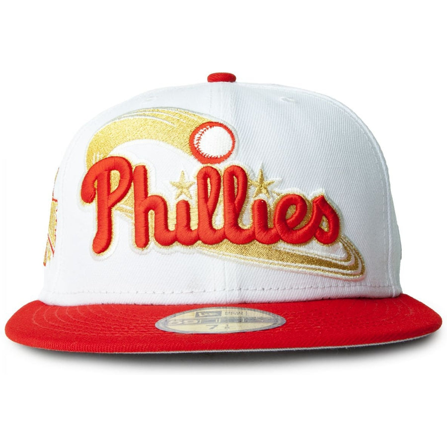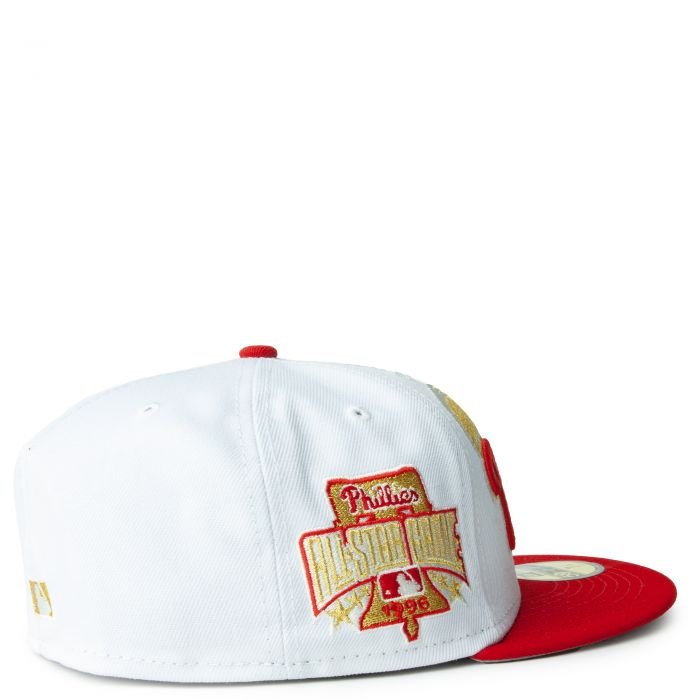 This New Era Philadelphia Phillies White/Red/Gold 1996 All-Star Game 59FIFTY Fitted Hat was released by Karma Loop. The fitted has a white six panel structured high crown and embroidered eyelets with a red fabric squatchee button. The fitted cap also has a red flat bill with a grey undervisor and black sweatband. The front panel features the Philadelphia Phillies logo embroidery and a 1996 ASG side patch embroidery on the right panel. The left panel of the fitted displays the New Era logo and the official MLB Batterman logo embroidery on the rear crown.