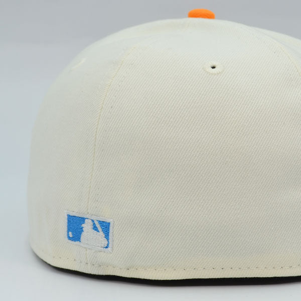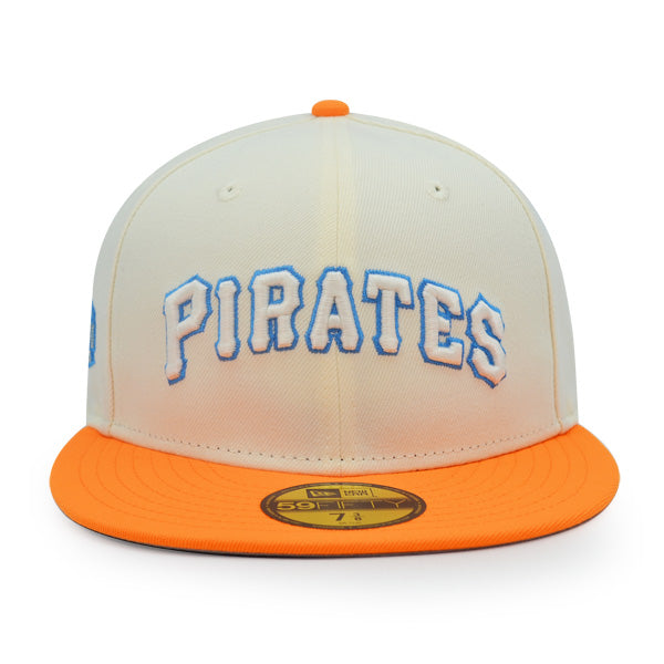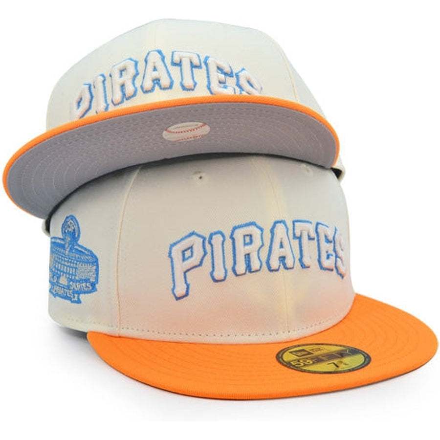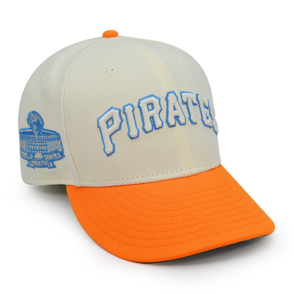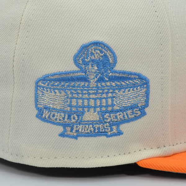 This New Era 59FIFTY Pittsburgh Pirates fitted hat was released by Hat Dreams. The fitted has a chrome six panel structured high crown and embroidered eyelets with an orange fabric squatchee button and bill. The fitted also has a grey bottom undervisor. The front panel features the Pittsburgh Pirates logo embroidery with a 1971 World Series on the right-wear side.