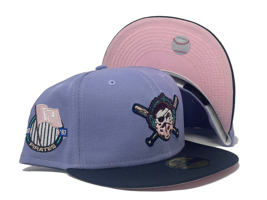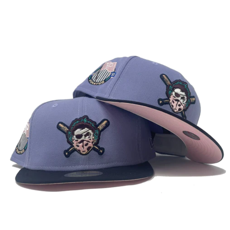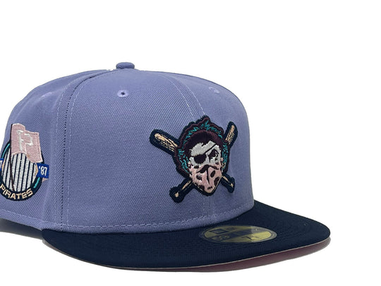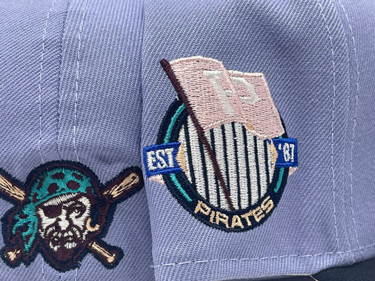 This New Era Pittsburgh Pirates "Blue Orchid 2" 59FIFTY Fitted Hat has a lavender six panel structured high crown and embroidered eyelets with a lavender fabric squatchee button. The fitted cap has a navy flat bill with a pink undervisor. The front panel features the Pittsburgh Pirates logo embroidery and a side patch embroidery on the right panel. The left panel of the fitted displays the New Era logo and the official MLB logo embroidery on the rear crown.