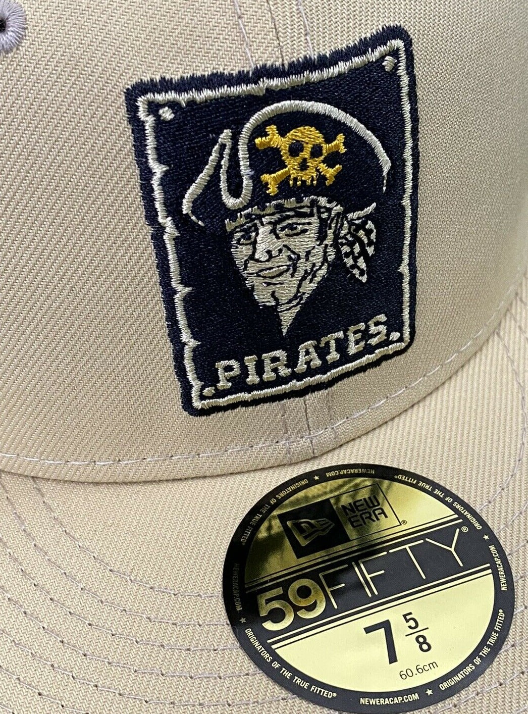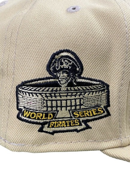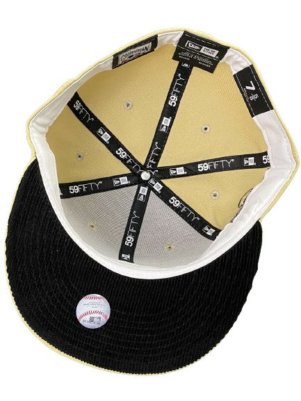 This New Era Pittsburgh Pirates 'Daily Prophet' 59FIFTY fitted hat is a My Fitteds exclusive release. The fitted has an old gold six panel structured high crown, embroidered eyelets, fabric squatchee button and flat bill.  The undervisor of the fitted cap is black corduroy with a white sweatband. The front panel features the Pittsburgh Pirates logo embroidered in black, yellow and old gold threads with a 1971 World Series side patch embroidered on the right panel in the same colorway.