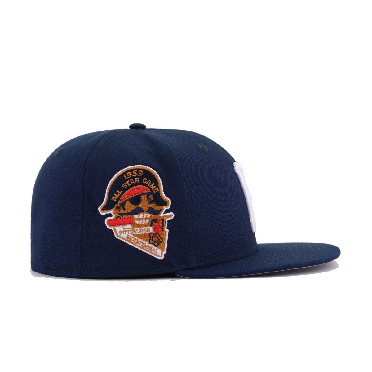 This New Era Pittsburgh Pirates Oceanside Blue 1959 All-Star Game 59FIFTY Fitted Hat was released by Hat Heaven. The fitted has a oceanside blue six panel structured high crown and embroidered eyelets with a oceanside blue fabric squatchee button. The flat bill of the fitted cap is also oceanside blue with a grey undervisor and black sweatband. The front panel features the Pittsburgh Pirates logo embroidered in white stitching and the New Era "Fly Your Own Flag" logo on the left panel.