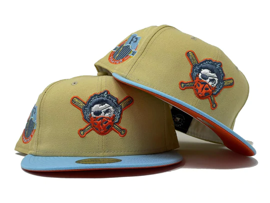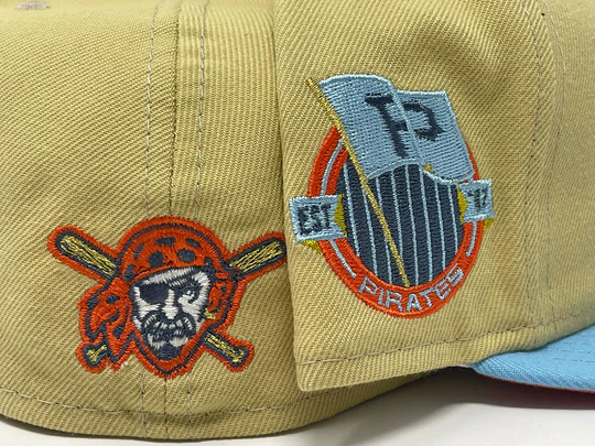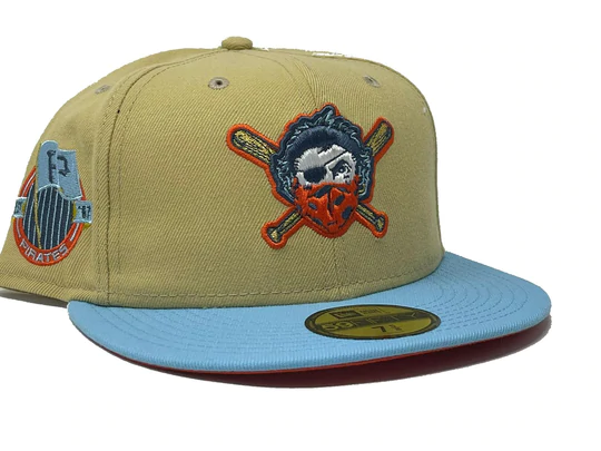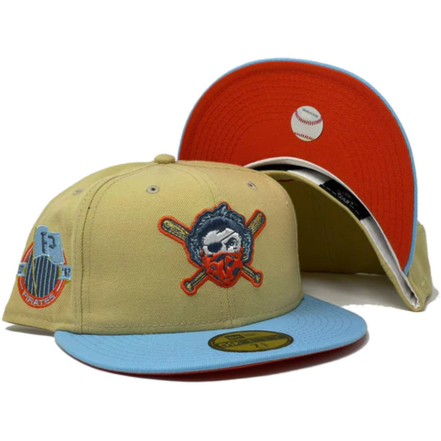 This New Era Pittsburgh Pirates 59FIFTY fitted hat has a vegas gold six panel structured high crown, vegas gold embroidered eyelets and a vegas gold fabric squatchee button. The fitted cap also has a sky blue flat bill with a orange undervisor and white sweatband. The front panel features the Pittsburgh Pirates logo embroidery and a side patch embroidery on the right panel. The left panel of the fitted displays the New Era logo and the rear crown features the official MLB logo embroidery.