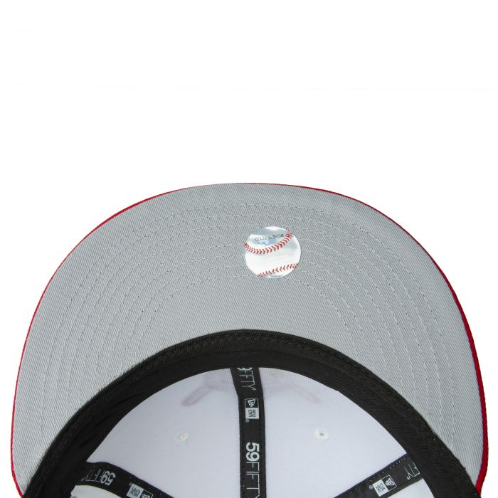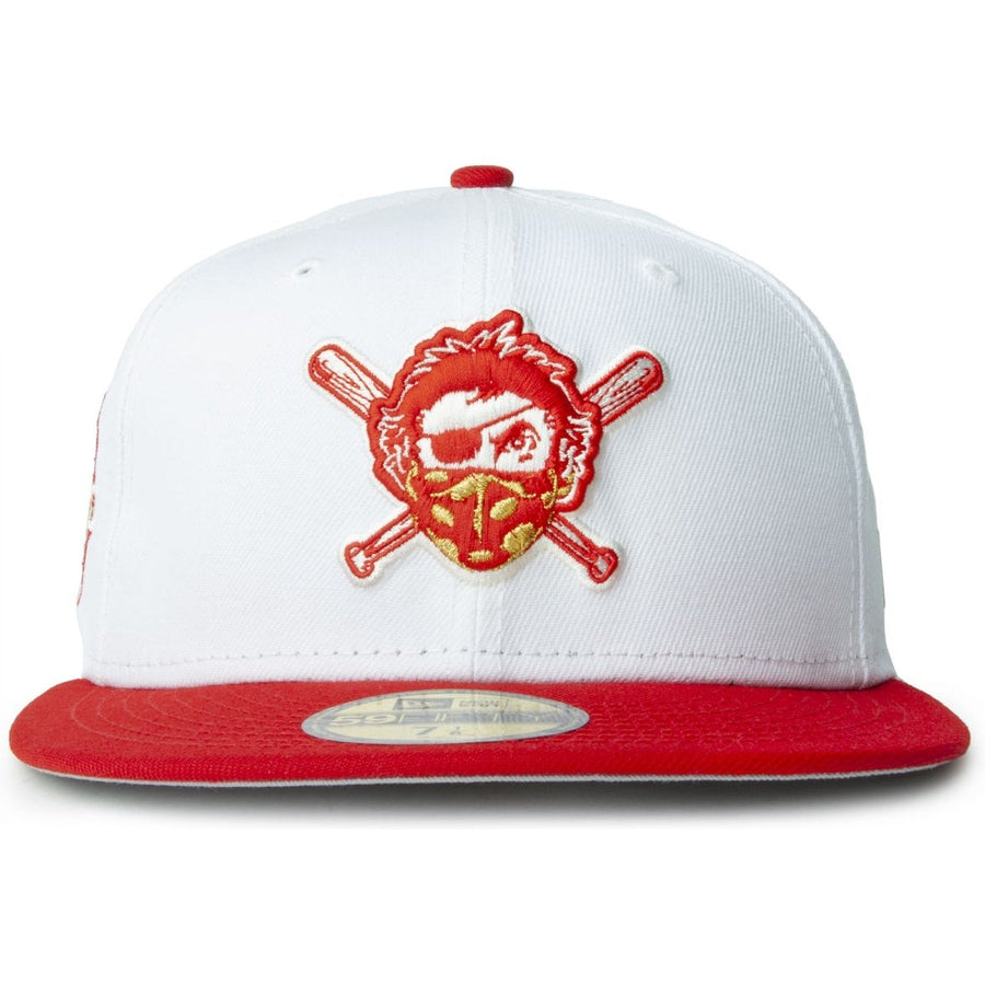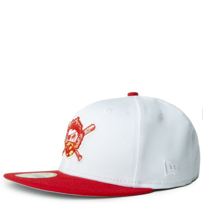 This New Era Pittsburgh Pirates White/Red/Gold 59FIFTY Fitted Hat was released by Karma Loop. The fitted has a white six panel structured high crown and embroidered eyelets with a red fabric squatchee button. The fitted cap also has a red flat bill with a grey undervisor and black sweatband. The front panel features the Pittsburgh Pirates logo embroidery and a side patch embroidery on the right panel. The left panel of the fitted displays the New Era logo and the official MLB Batterman logo embroidery on the rear crown.