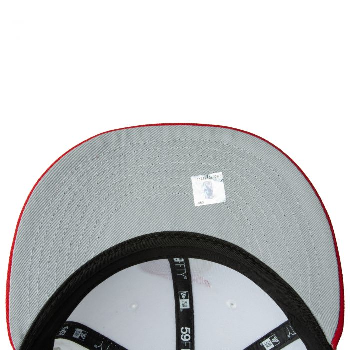 This New Era Portland Trail Blazers White/Red/Gold 59FIFTY Fitted Hat was released by Karma Loop. The fitted has a white six panel structured high crown and embroidered eyelets with a red fabric squatchee button. The fitted cap also has a red flat bill with a grey undervisor and black sweatband. The front panel features the Portland Trail Blazers logo embroidery and a side patch embroidery on the right panel. The left panel of the fitted displays the New Era logo and the official NBA logo embroidery on the rear crown.