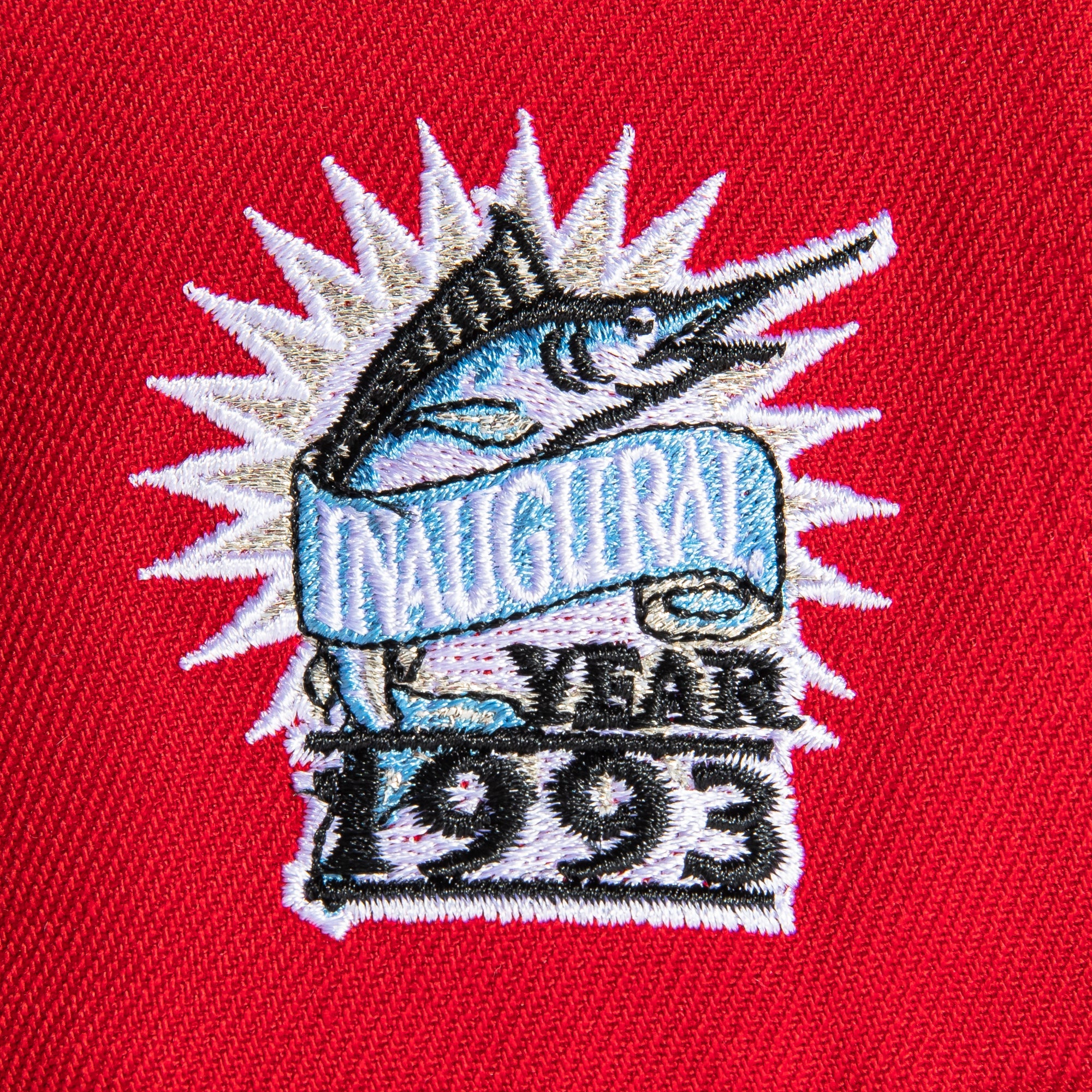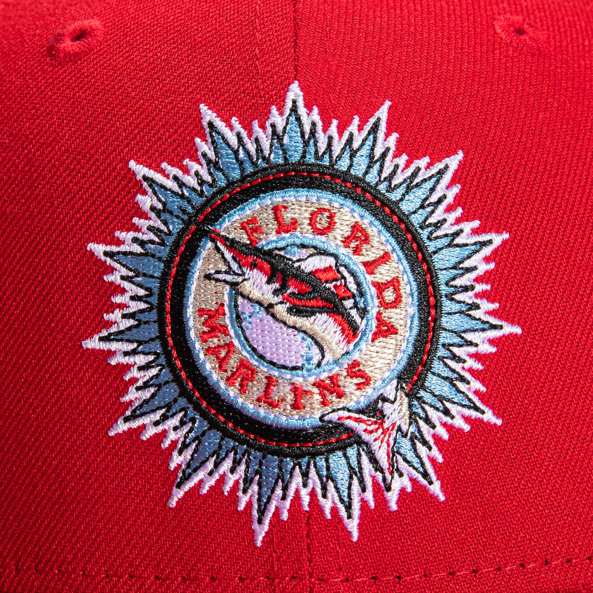 This New Era Red Icy Florida Marlins Inaugural 59FIFTY Fitted Hat was released by Hat Club. The fitted has a red six panel structured high crown, embroidered eyelets with and fabric squatchee button. The fitted also has a red flat bill with an "icy" (light blue) undervisor. The front panel features the Florida Marlins logo embroidery and a side patch embroidery on the right panel. The left panel of the fitted displays the New Era logo and the official MLB logo embroidery on the rear crown.
