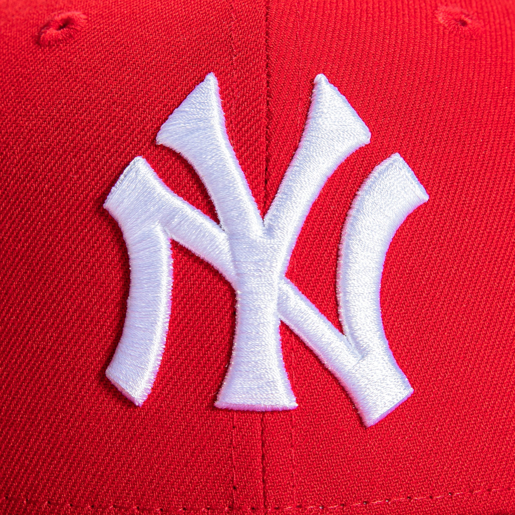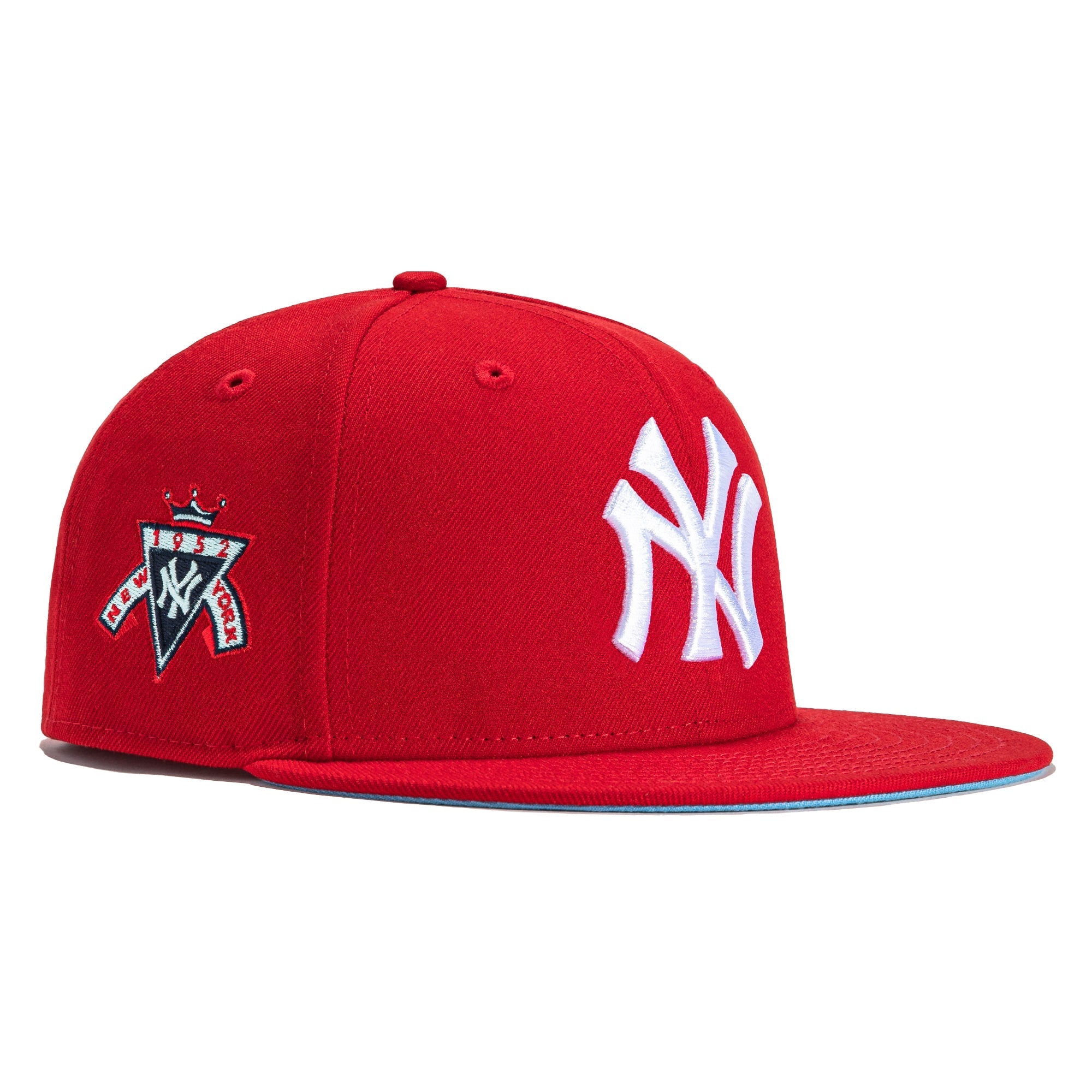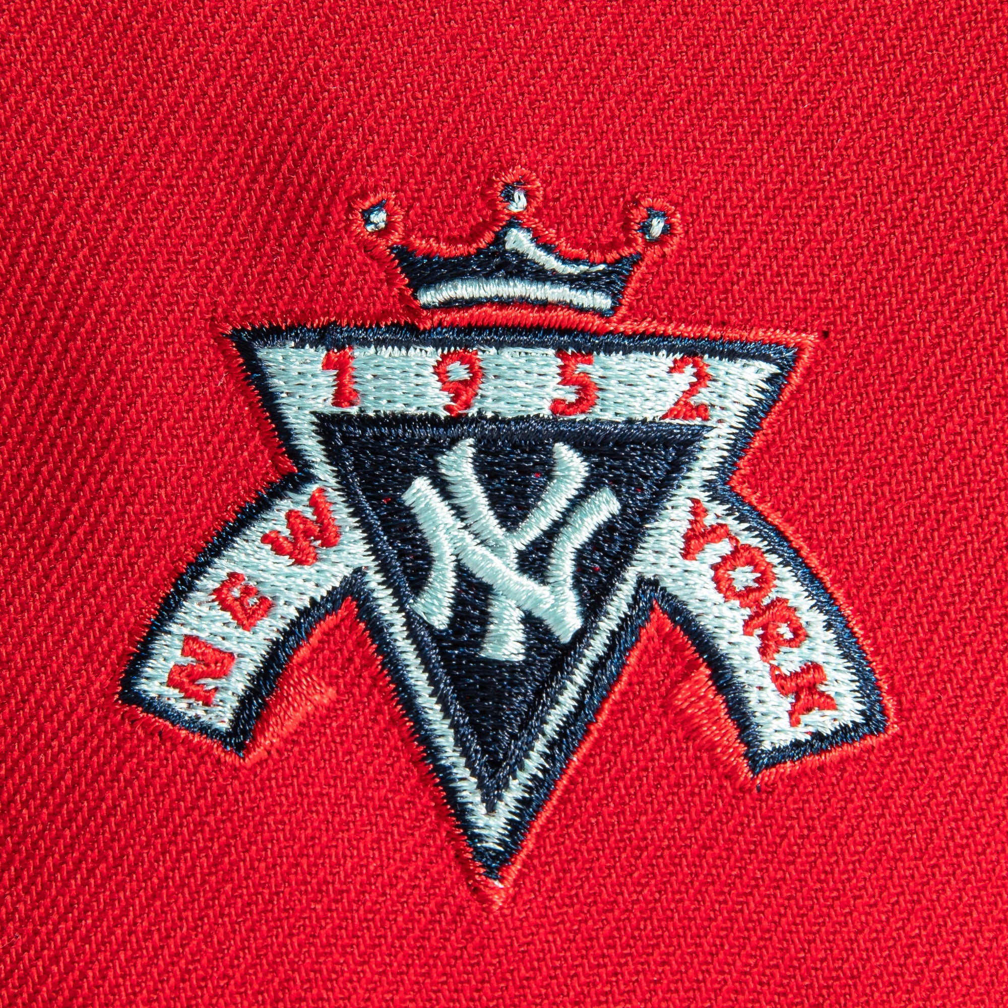 This New Era Red Icy New York Yankees 1952 59FIFTY Fitted Hat was released by Hat Club. The fitted has a red six panel structured high crown, embroidered eyelets with and fabric squatchee button. The fitted also has a red flat bill with an "icy" (light blue) undervisor. The front panel features the New York Yankees logo embroidery and a side patch embroidery on the right panel. The left panel of the fitted displays the New Era logo and the official MLB logo embroidery on the rear crown.