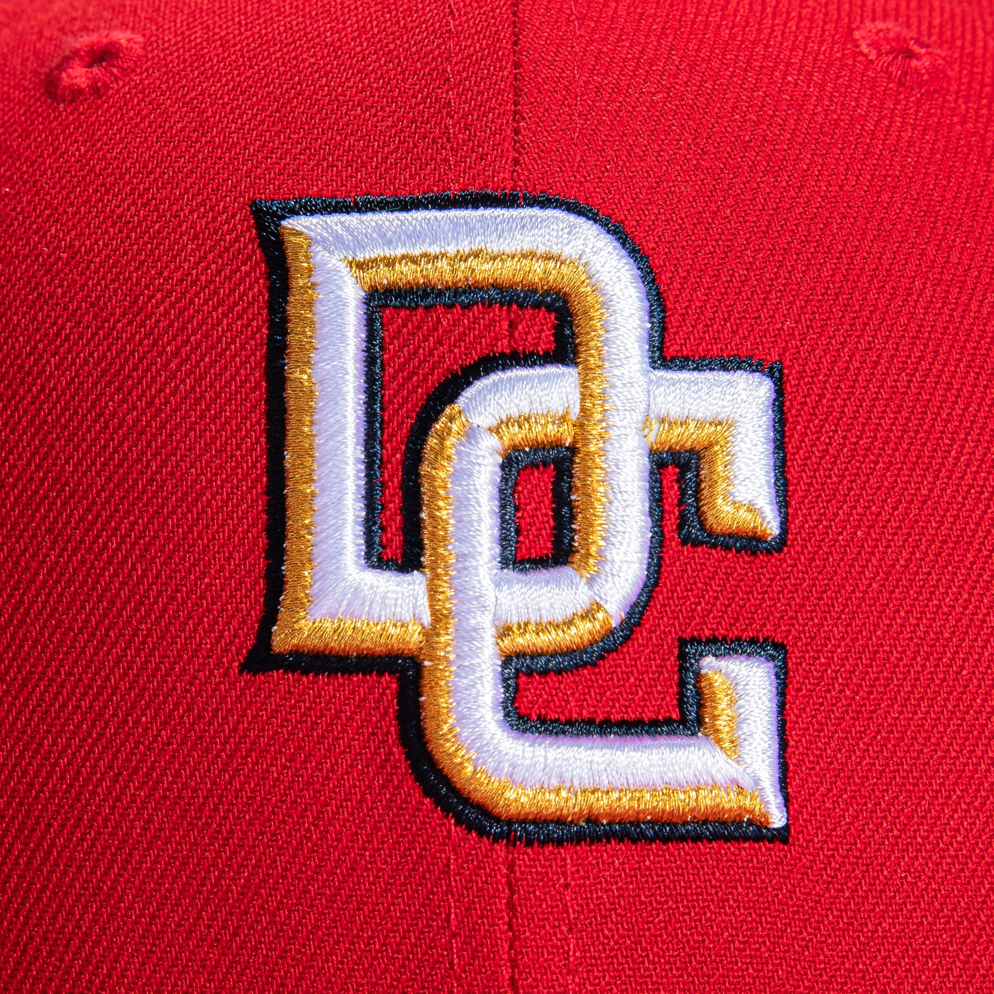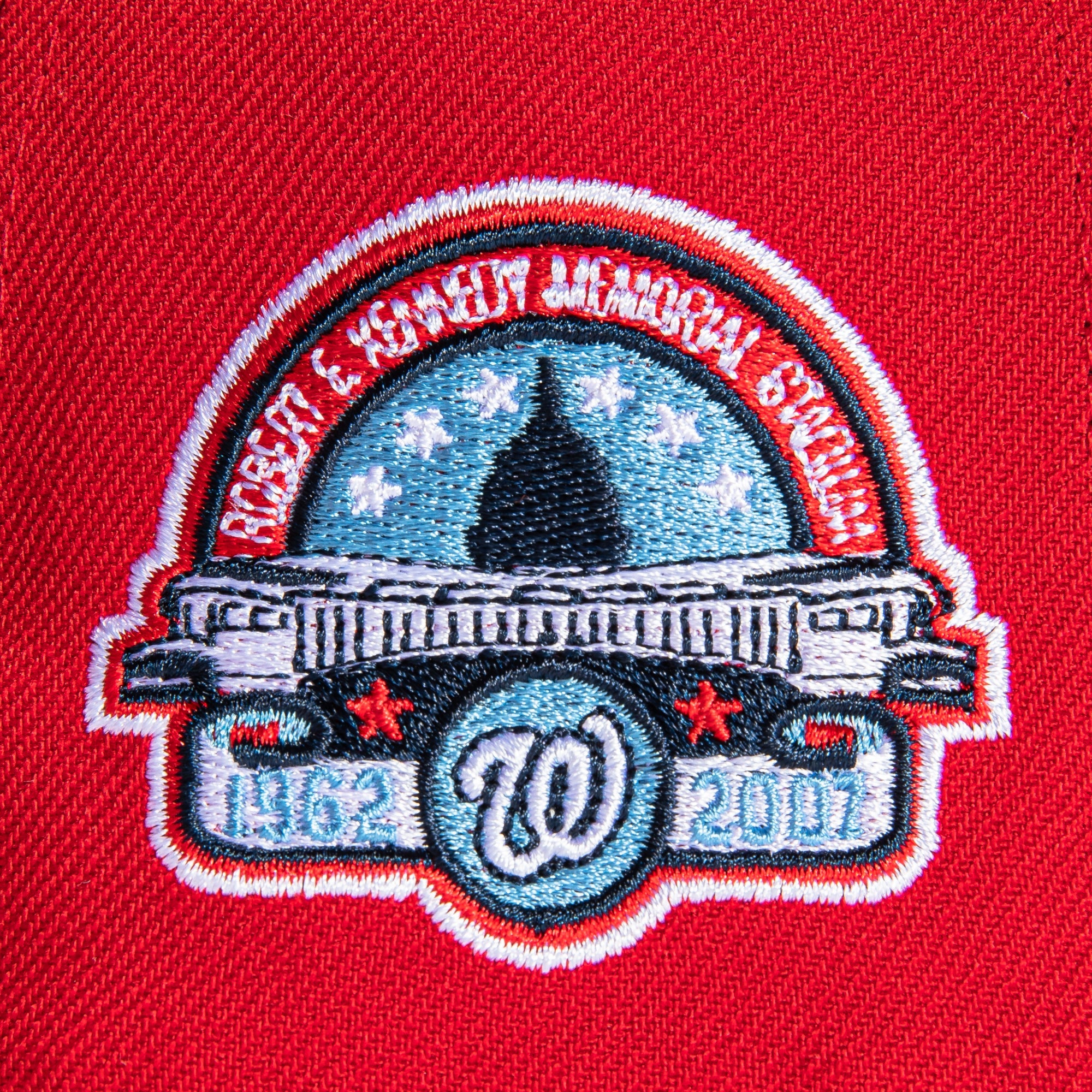 This New Era Red Icy Washington Nationals RFK Stadium 59FIFTY Fitted Hat was released by Hat Club. The fitted has a red six panel structured high crown, embroidered eyelets with and fabric squatchee button. The fitted also has a red flat bill with an "icy" (light blue) undervisor. The front panel features the Washington Nationals logo embroidery and a side patch embroidery on the right panel. The left panel of the fitted displays the New Era logo and the official MLB logo embroidery on the rear crown.