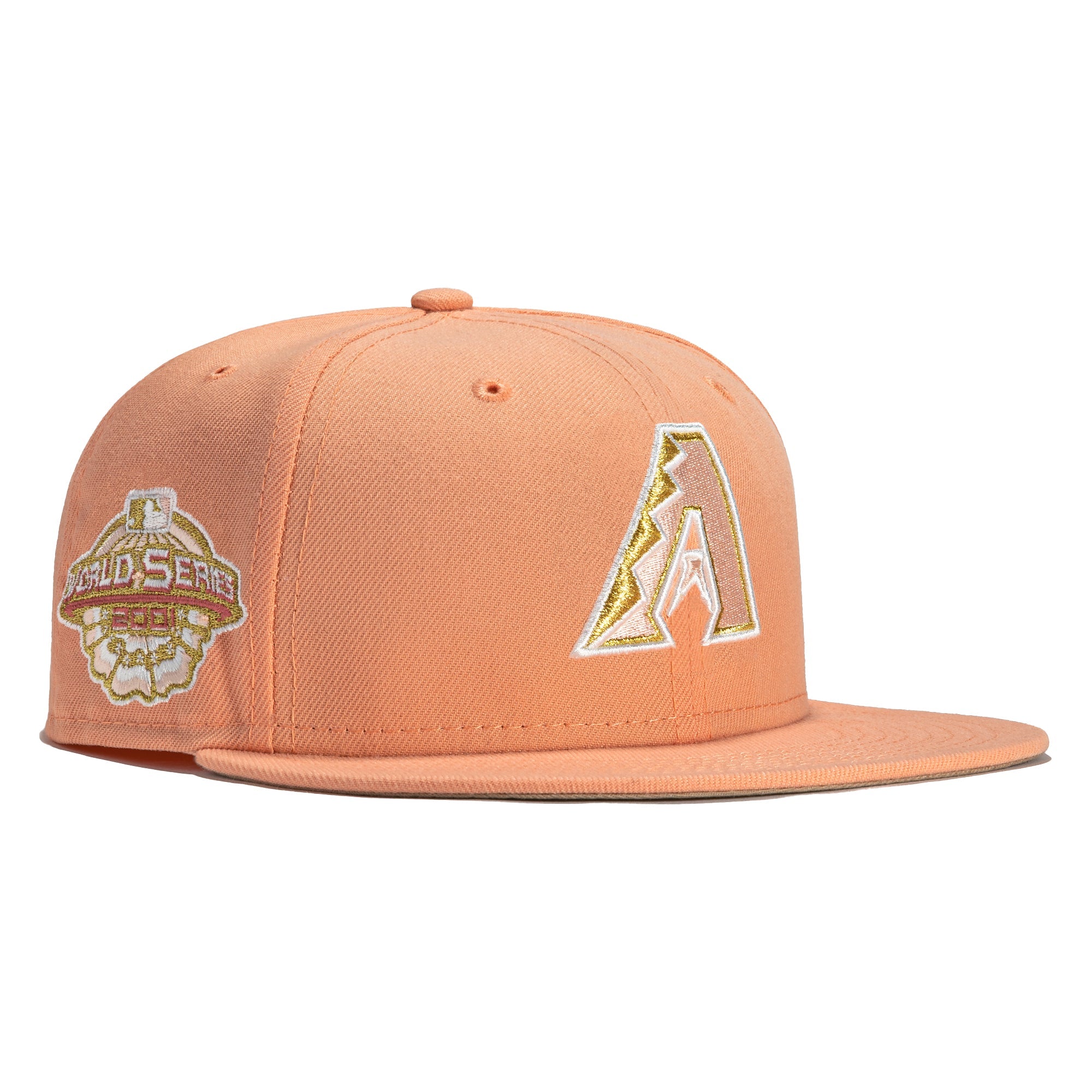 This New Era Rose Gold Arizona Diamondbacks 2001 World Series 59FIFTY Fitted Hat were originally released by Hat Club. The fitteds have a red rose, stone and apricot colorway with a six panel structured high crown embroidered eyelets and a fabric squatchee button. The fitted cap also has a flat bill with a color undervisor. The front panel features the Arizona Diamondbacks logo embroidery and a side patch embroidery on the right panel. These Rose Gold fitteds were released in 2022.