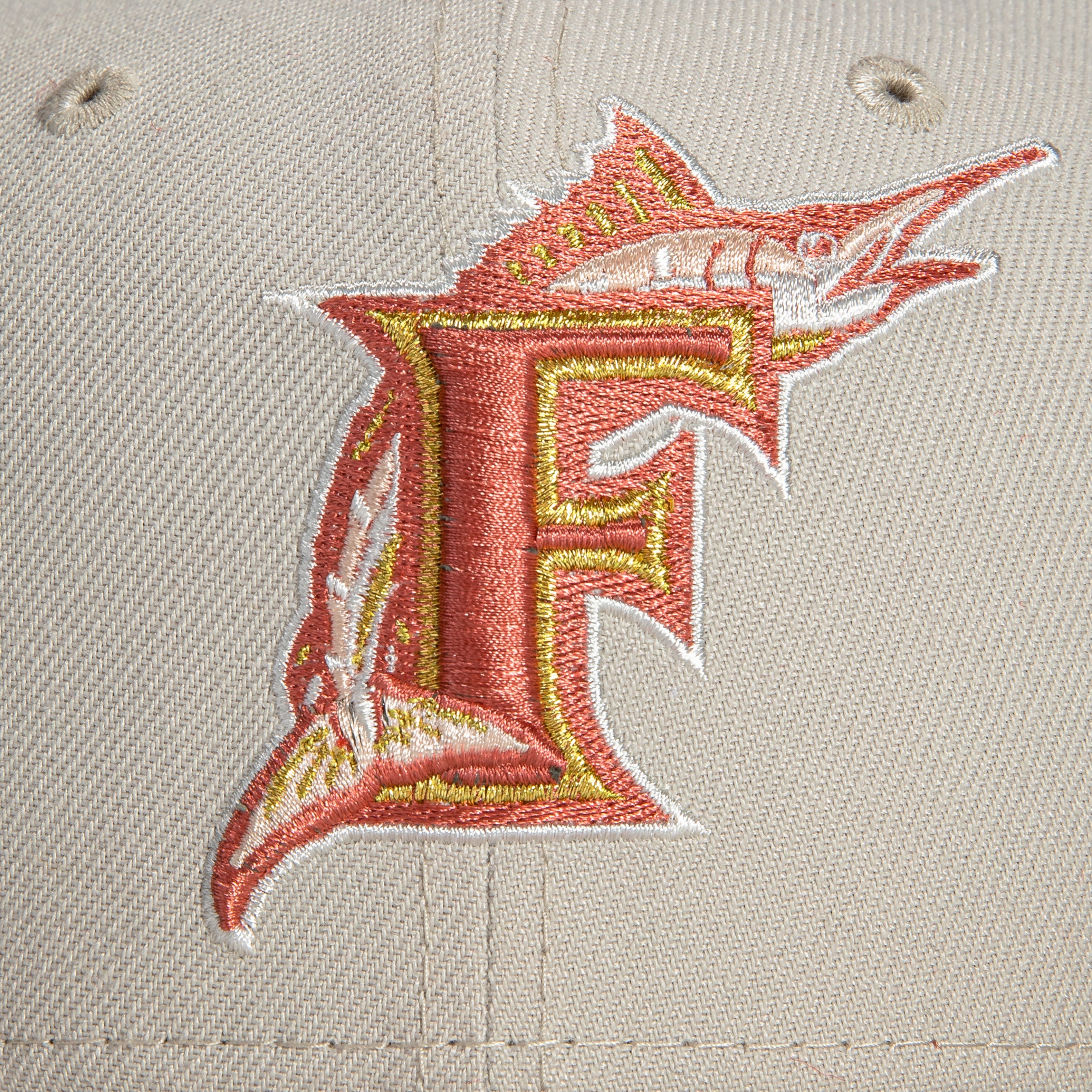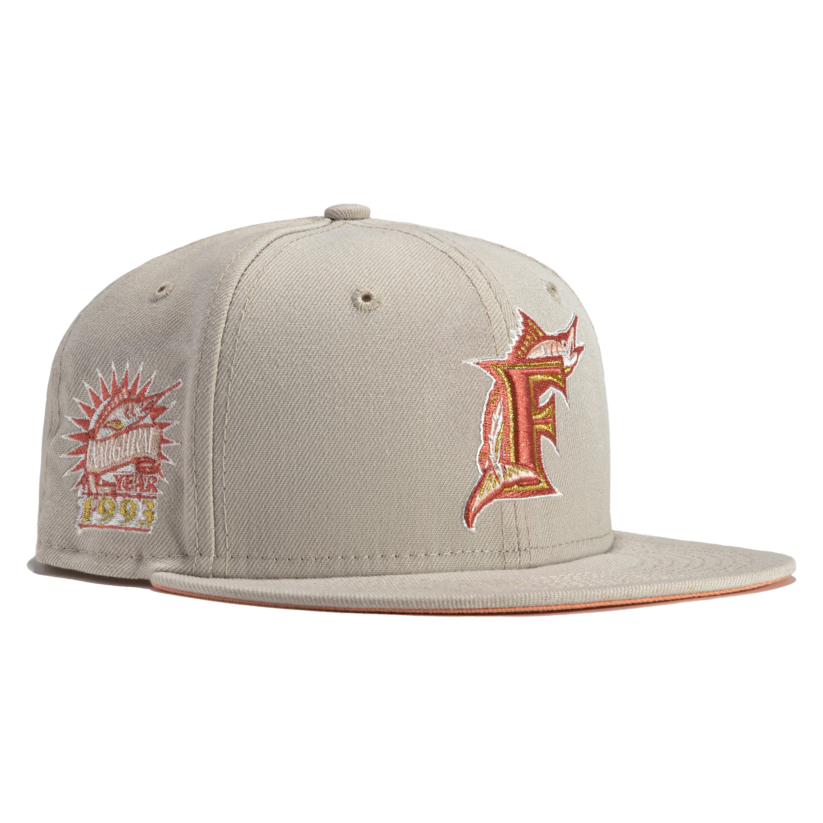 This New Era Rose Gold Florida Marlins Inaugural 59FIFTY Fitted Hat were originally released by Hat Club. The fitteds have a red rose, stone and apricot colorway with a six panel structured high crown embroidered eyelets and a fabric squatchee button. The fitted cap also has a flat bill with a color undervisor. The front panel features the Florida Marlins logo embroidery and a side patch embroidery on the right panel. These Rose Gold fitteds were released in 2022.